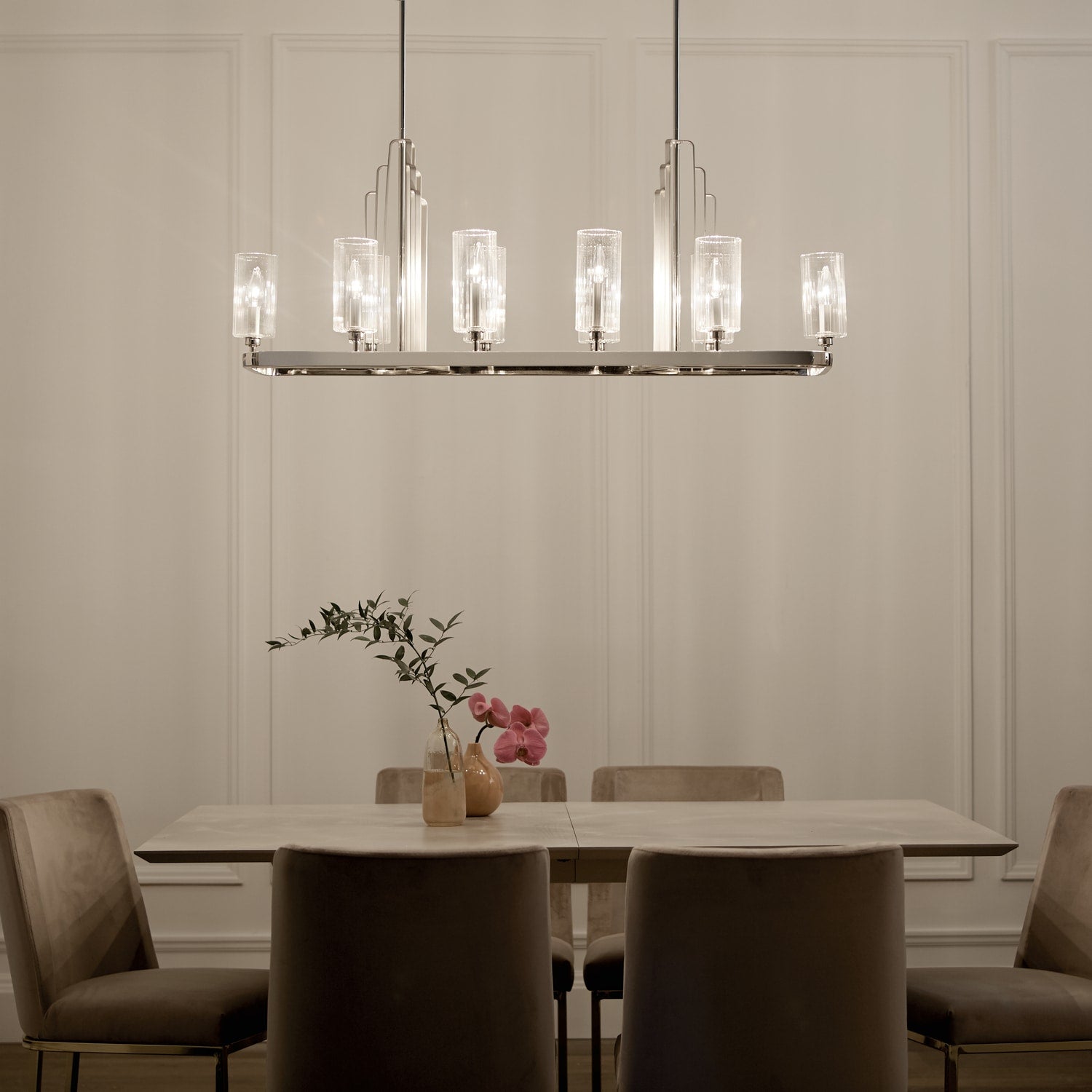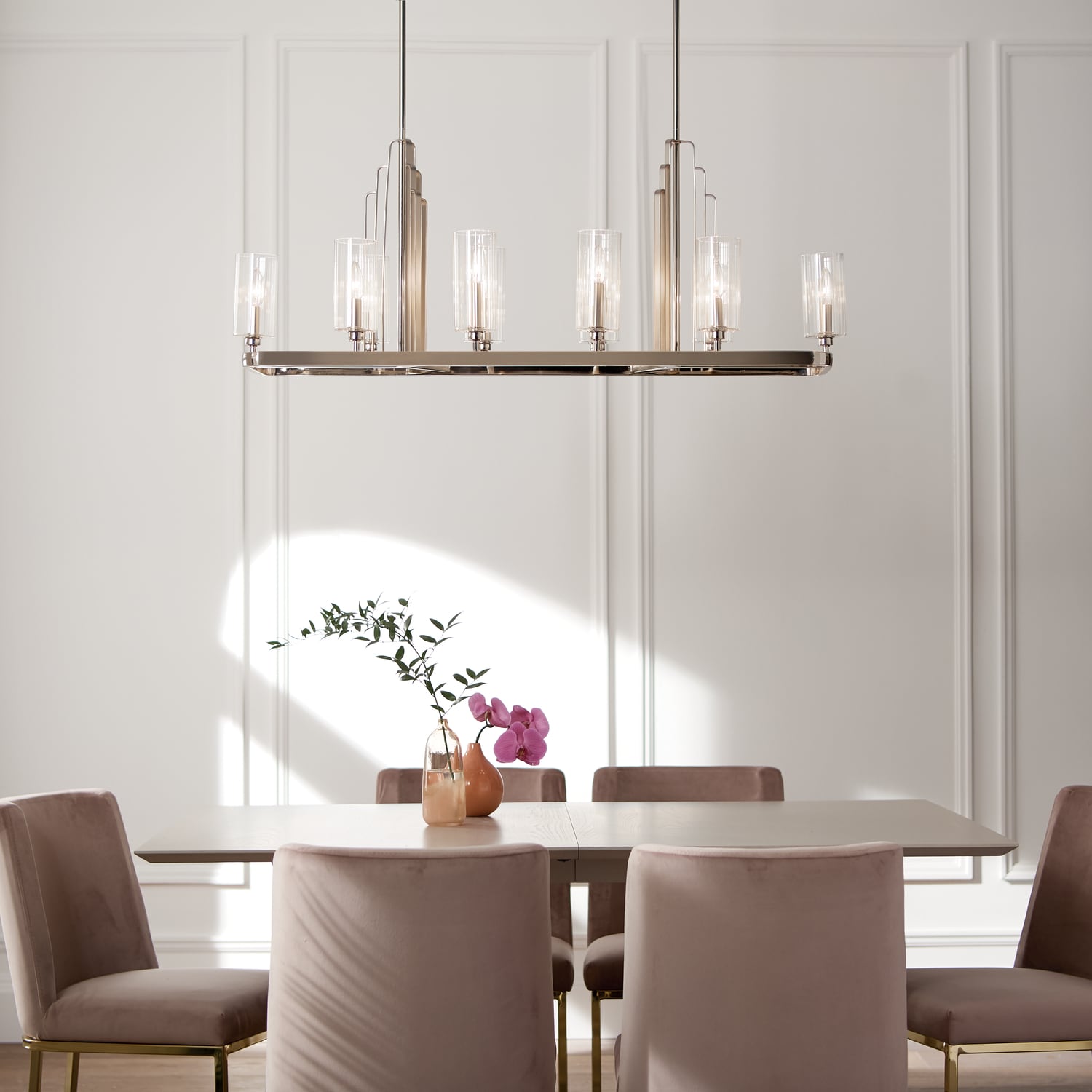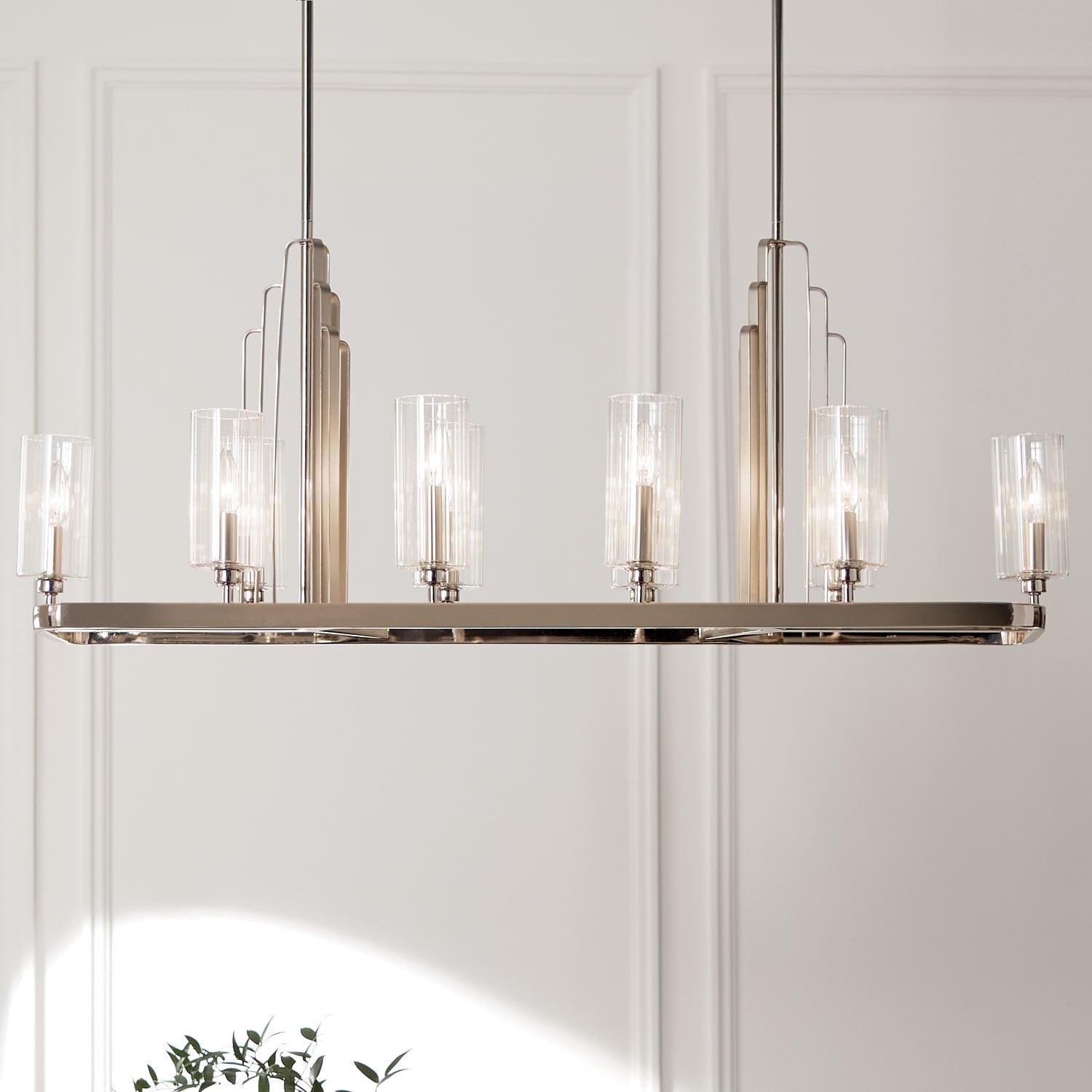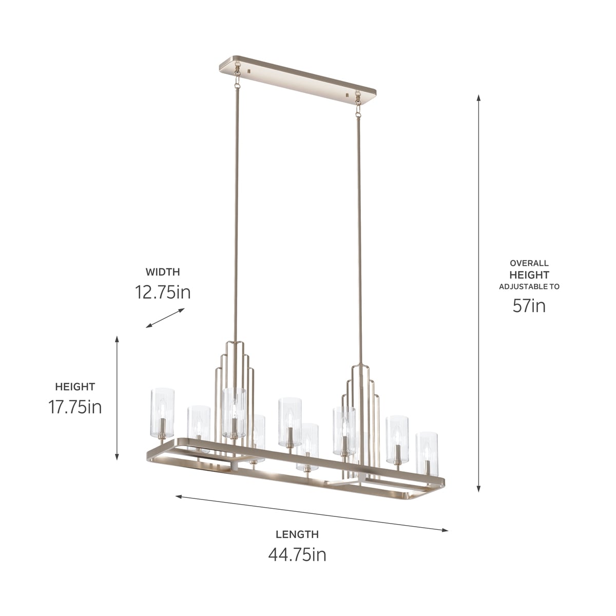 Elevate your space with the Kichler Kimrose 10-Light Chandelier, an Art Deco-inspired masterpiece. This vintage-style chandelier features a stunning blend of polished nickel and satin finishes, accentuated by clear fluted glass shades that create a subtle, elegant glow. Ideal for dining areas, kitchens, or grand foyers, it promises to make a lasting impression.