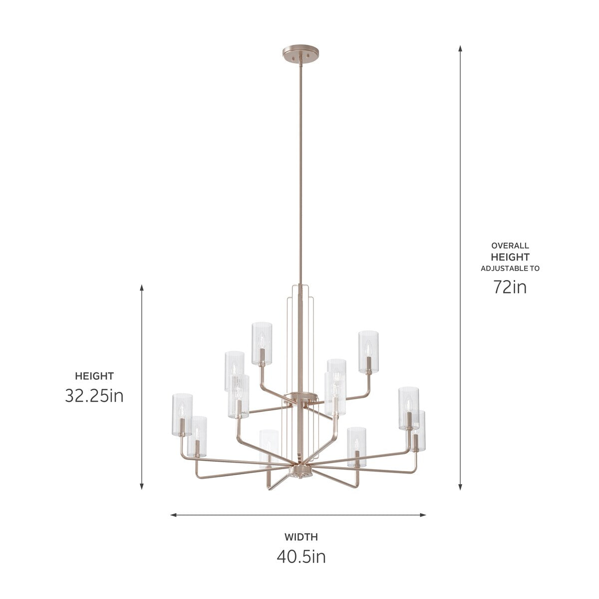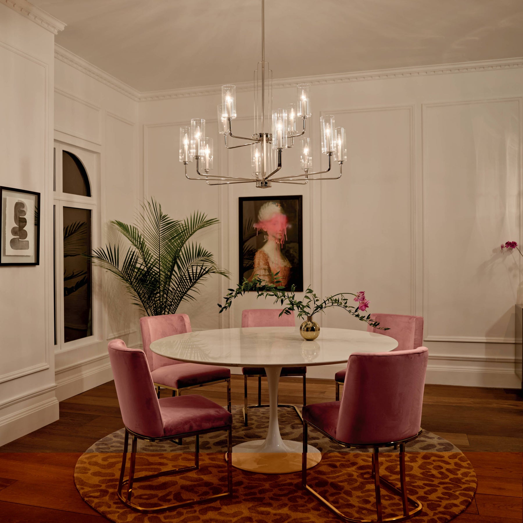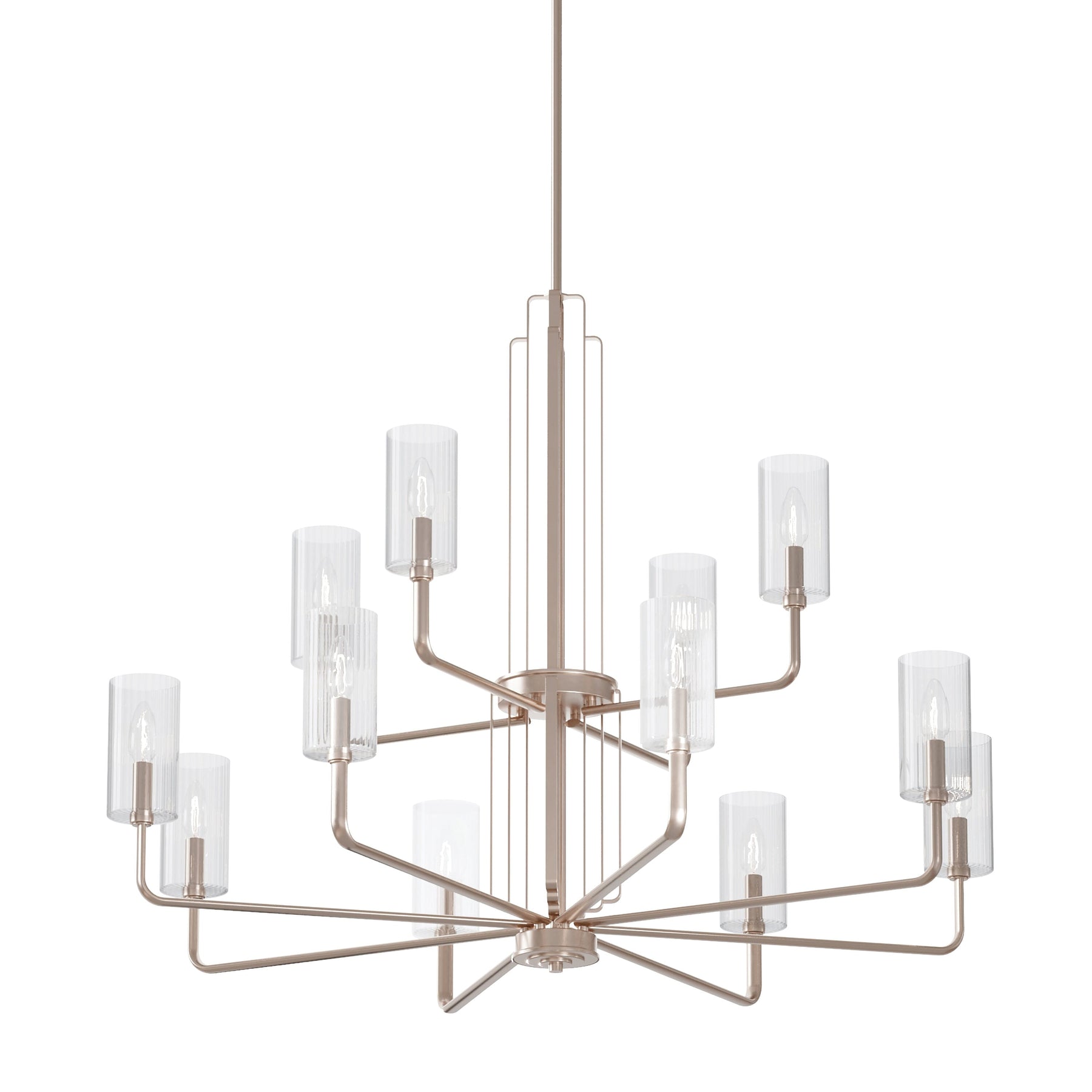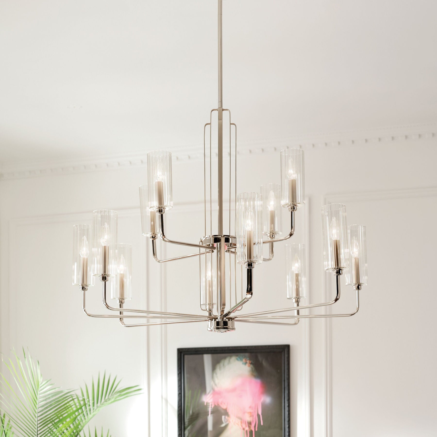 Inspired by the Art Deco grandeur of New York's Madison Belmont Building, the Kichler Kimrose 12-Light Chandelier infuses your space with vintage elegance. Its polished nickel finish and clear fluted glass shades create a visually stunning lighting experience, accentuating any room with geometric flair and classic charm.