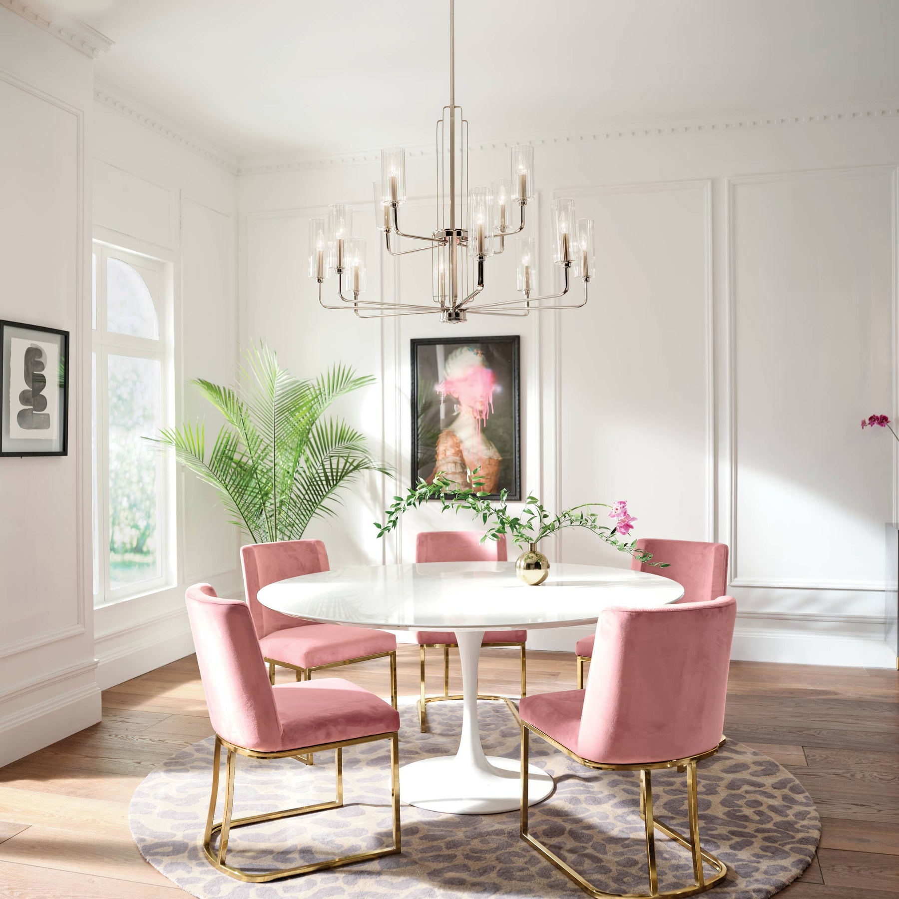 The Kimrose chandelier isn't just lighting—it's a statement piece that transforms any space into a radiant, luxurious environment. Its standout feature, the clear fluted glass shades, casts a delicate yet impactful glow, exuding an alluring Art Deco charisma. Hang this masterpiece above your dining table or in your grand foyer to create a captivating focal point reminiscent of bygone glamour. With its polished nickel finish creating a harmonious balance with diverse decor styles, the Kimrose chandelier becomes an essential touch of sophistication and opulence in your home.