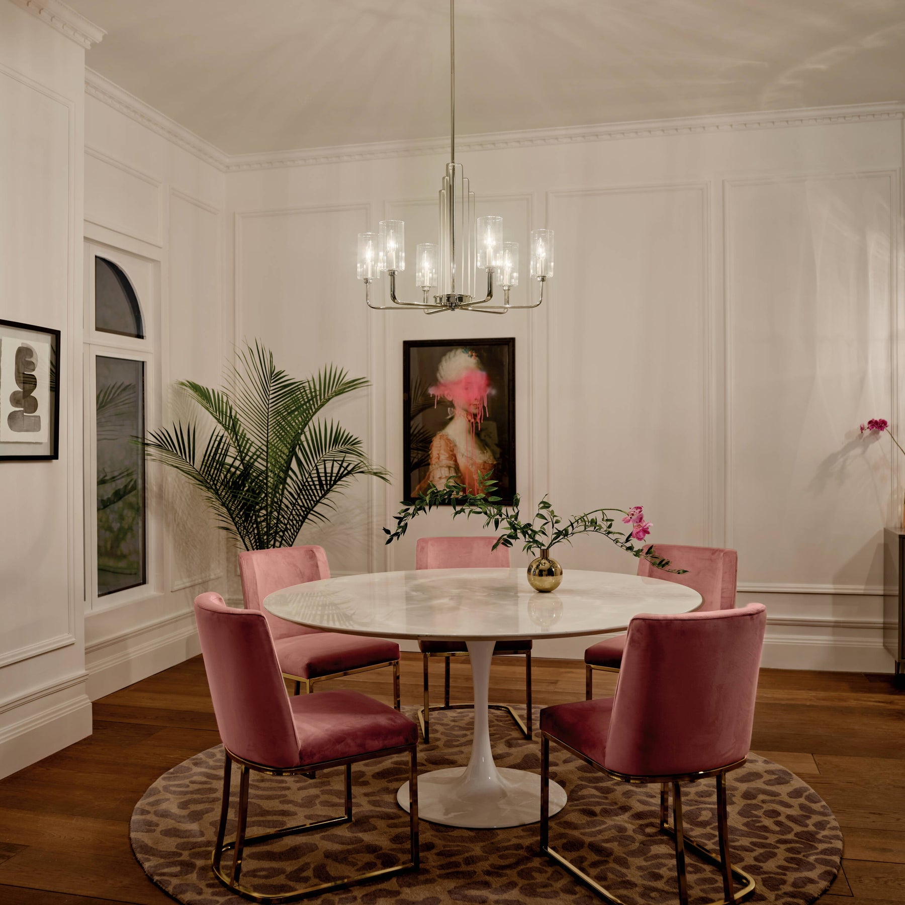 Elevate your space with the Kichler Kimrose 6-Light Polished Nickel Vintage Chandelier. This stunning fixture, inspired by Art Deco design, combines bold geometric shapes with a polished nickel finish and offers versatile lighting options with its clear ribbed glass shades. Perfect for dining rooms or foyers, it seamlessly blends timeless elegance with modern sophistication.