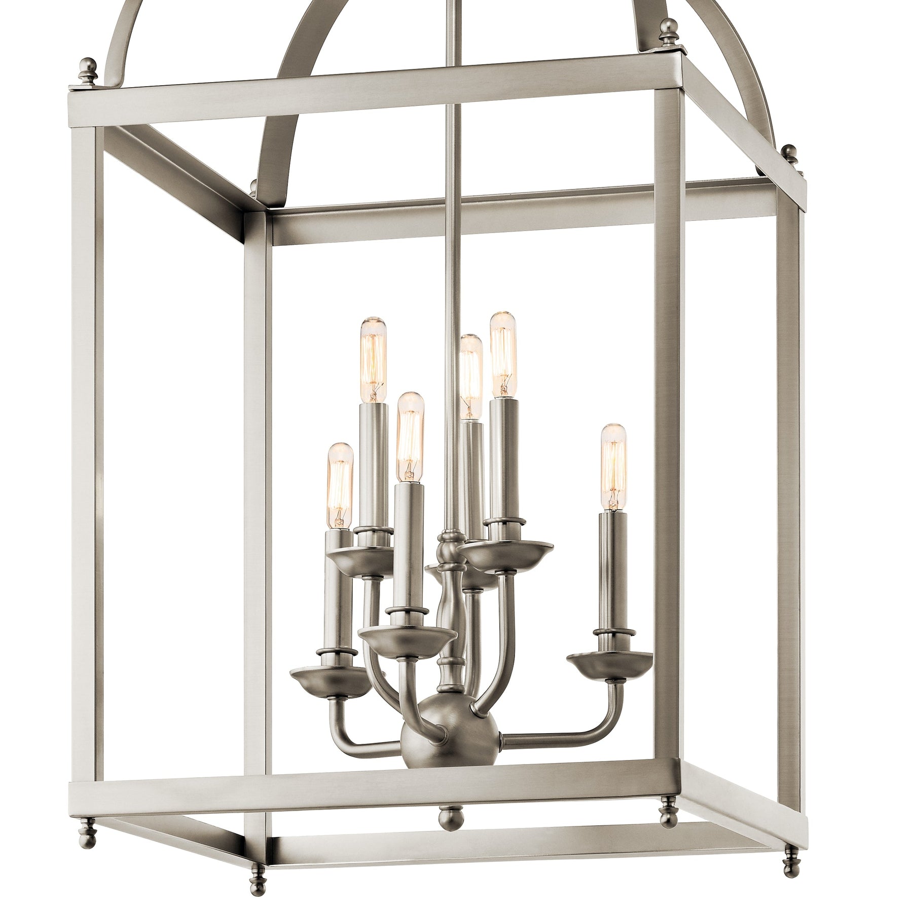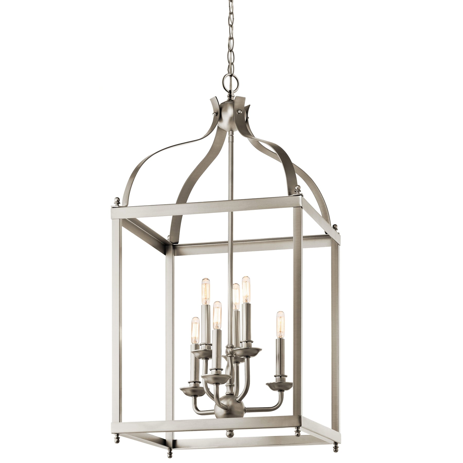 Illuminate your space with the Kichler Larkin 6-Light Brushed Nickel Pendant, a transitional masterpiece that exudes timeless elegance. This medium-sized hanging lantern is designed to captivate with its sophisticated brushed nickel finish and striking linear silhouette, offering versatility across kitchens, dining rooms, or foyers.