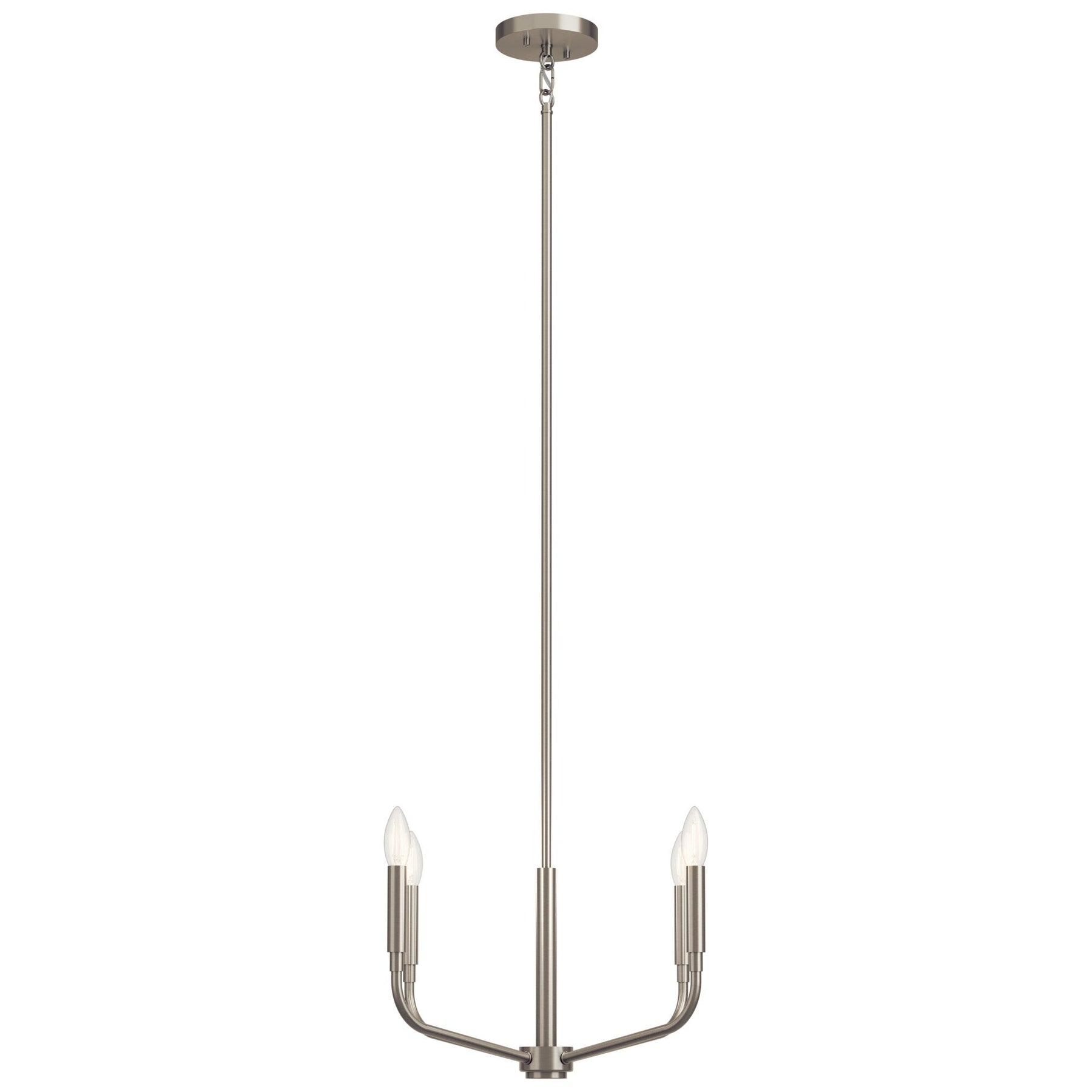 The Kichler Madden 4-Light Chandelier transforms ordinary spaces into elegant abodes with its sophisticated bare bulb design and sleek brushed nickel finish. Its minimalist silhouette and flowing lines create a mesmerizing focal point that adapts effortlessly to both modern and traditional interiors. Picture it hovering gracefully above a dining room table, casting a warm glow while elevating the room's refined charm. This chandelier is not merely a lighting fixture, but a statement of luxury and style.