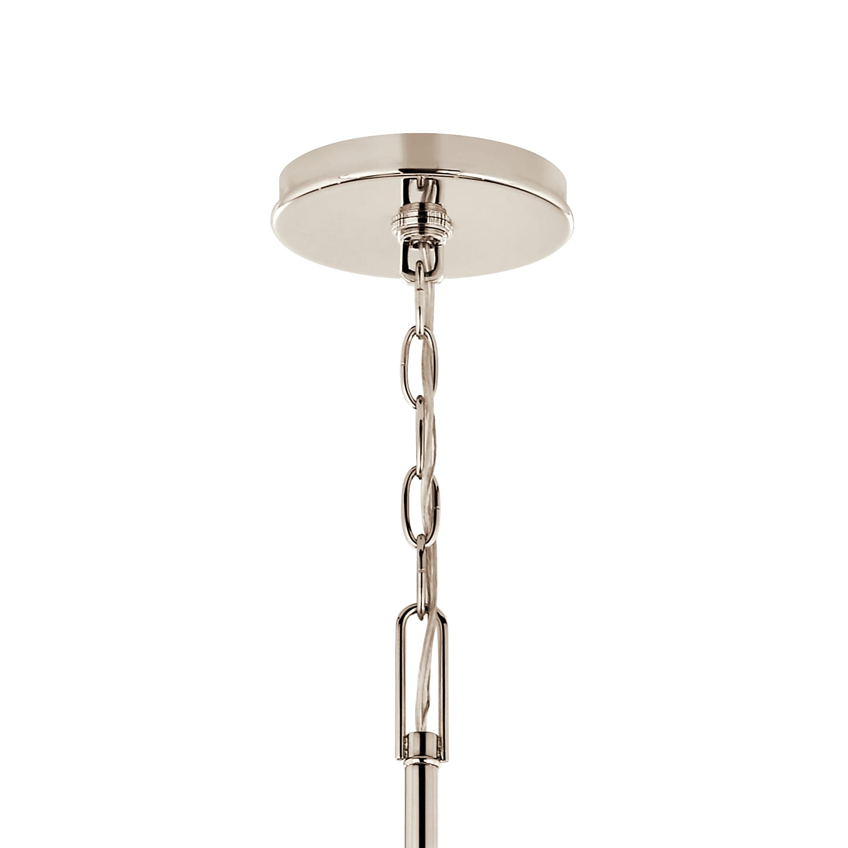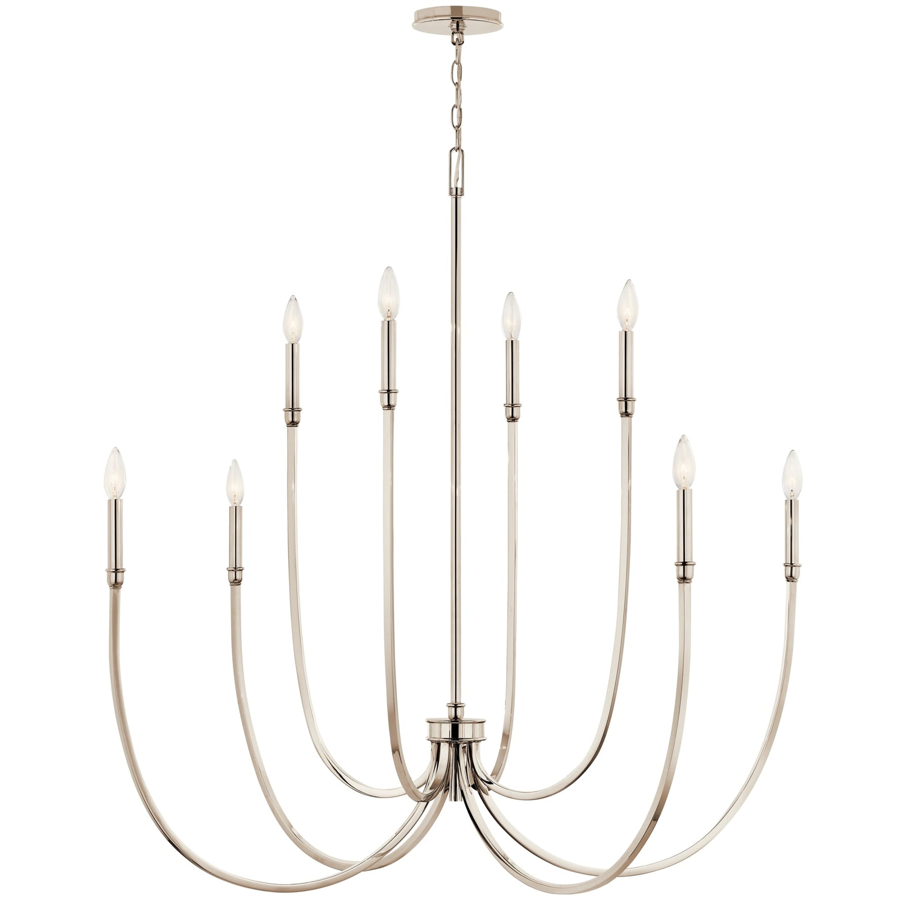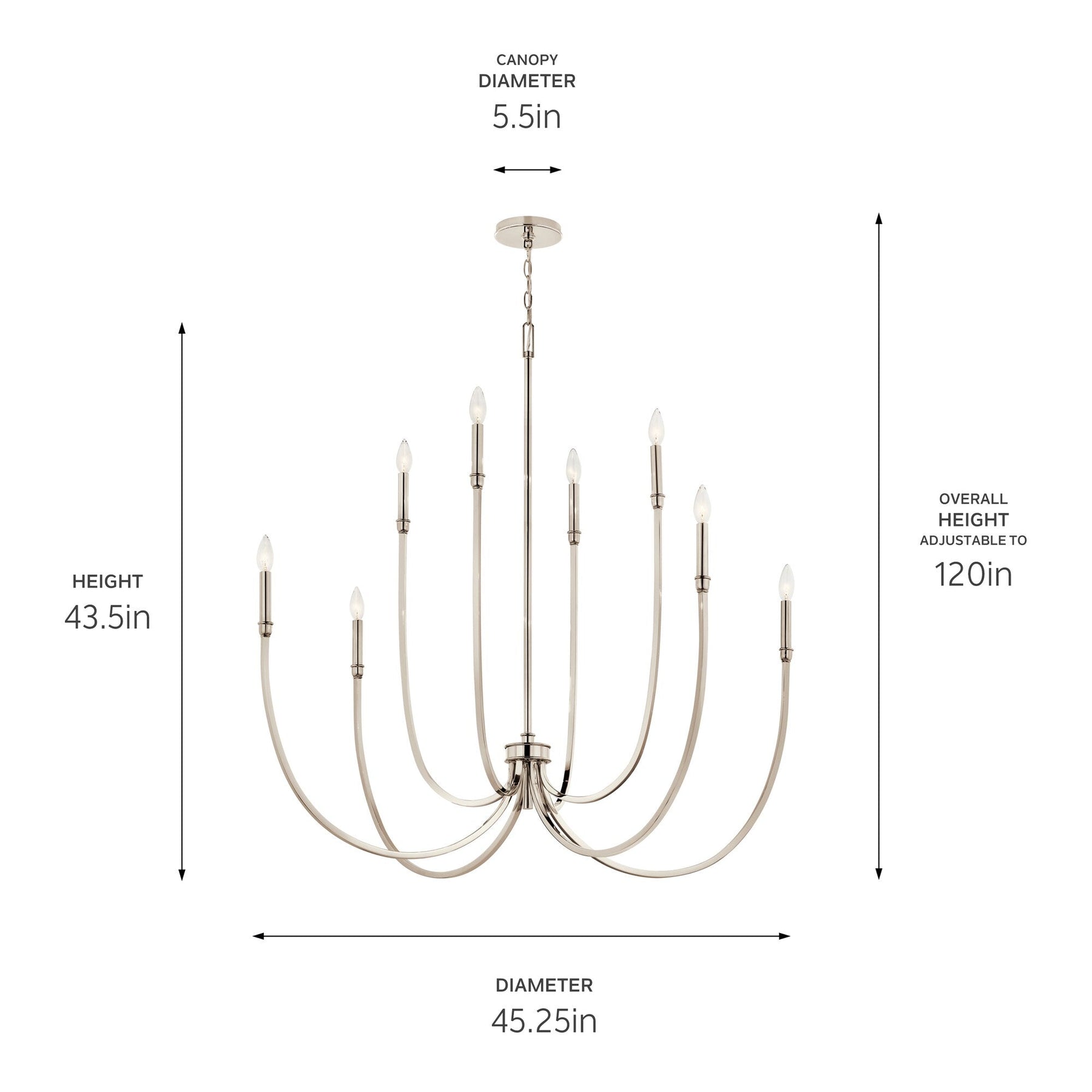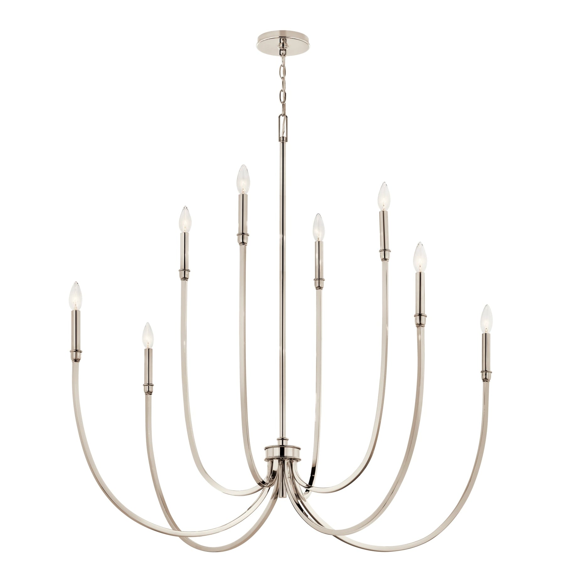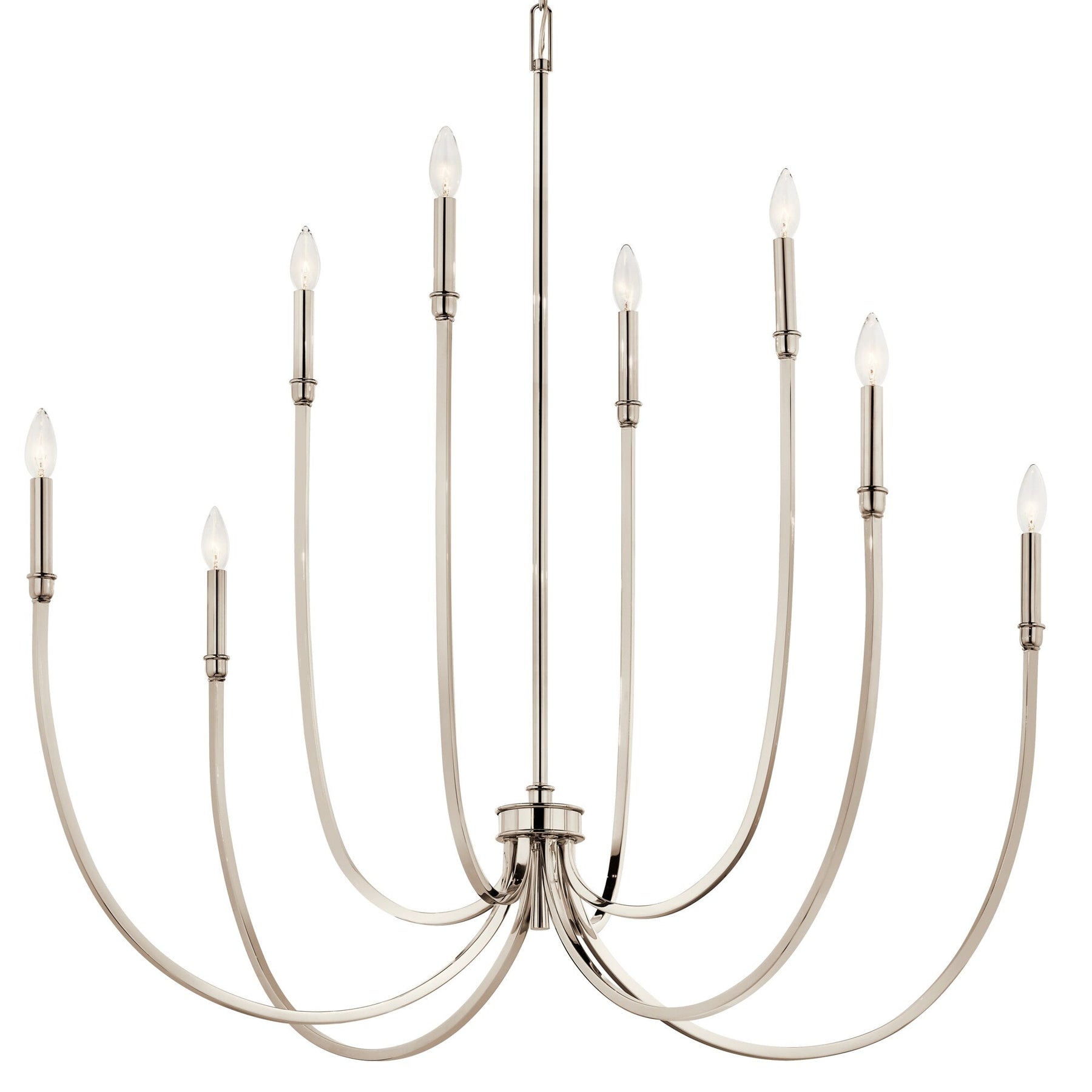 The Kichler Malene 8-Light Chandelier in Polished Nickel delivers a stunning blend of traditional elegance with modern versatility. With its sleek bare bulb design and graceful sweeping arms, this chandelier stands as a centerpiece in any room, offering flexibility in lighting style with interchangeable candle sleeves and compatibility with sloped ceilings.