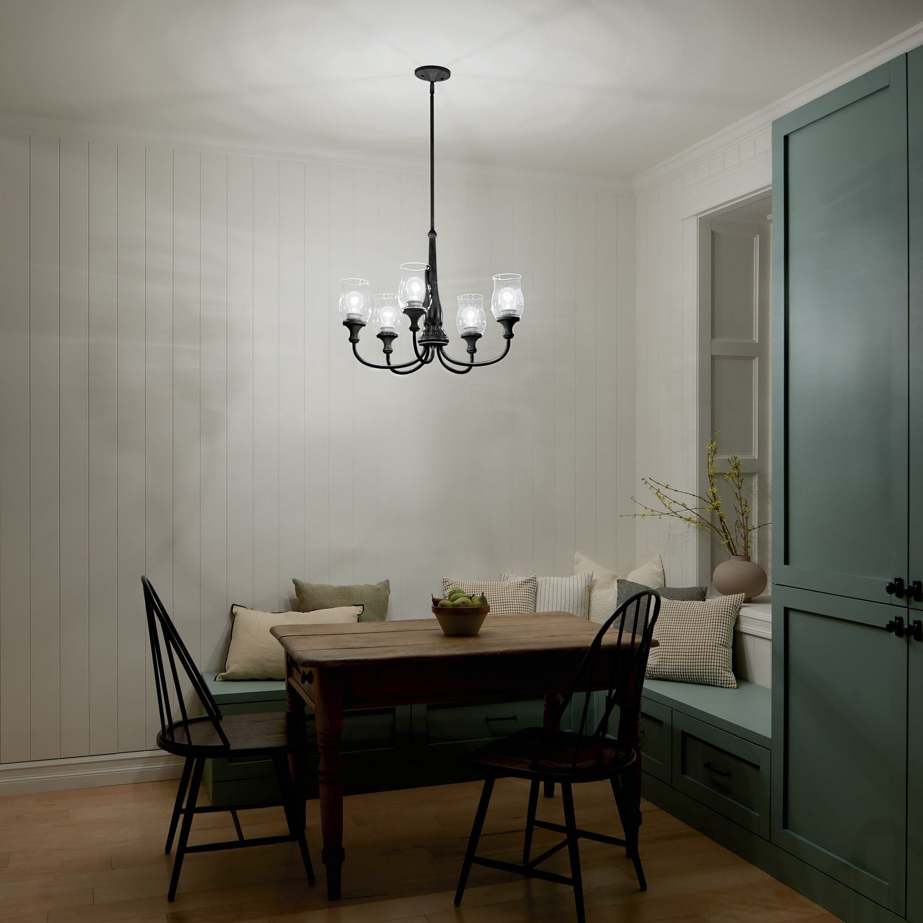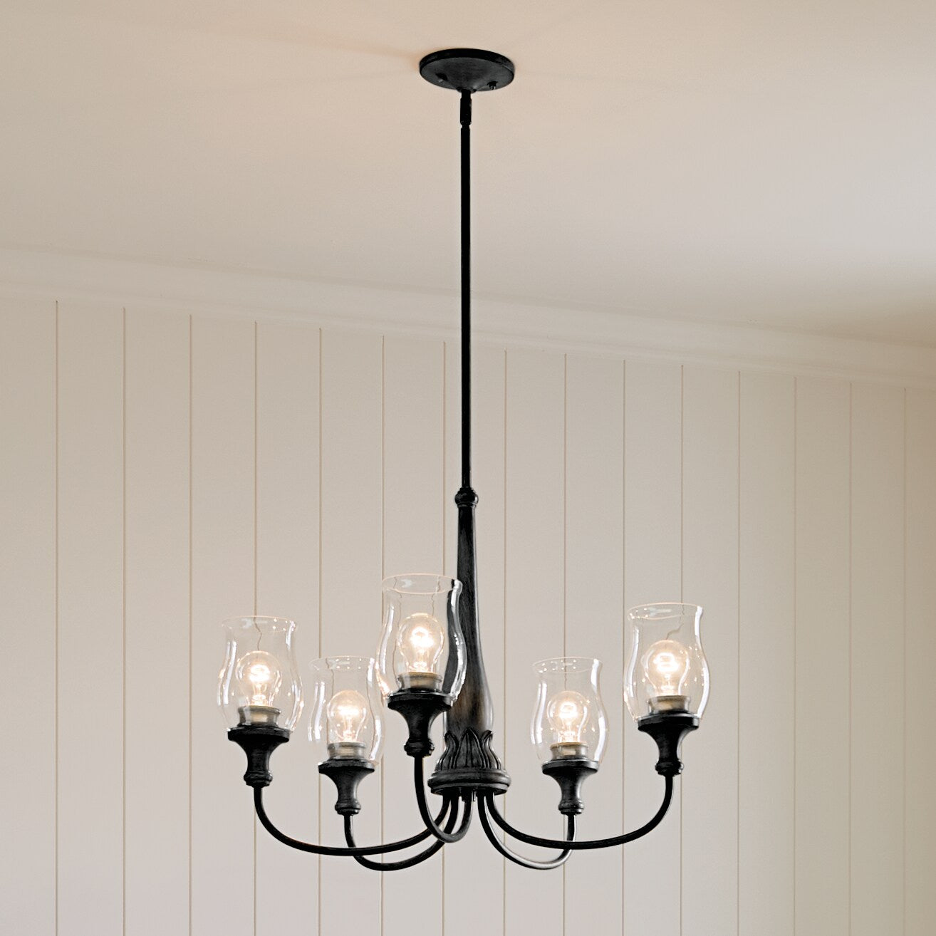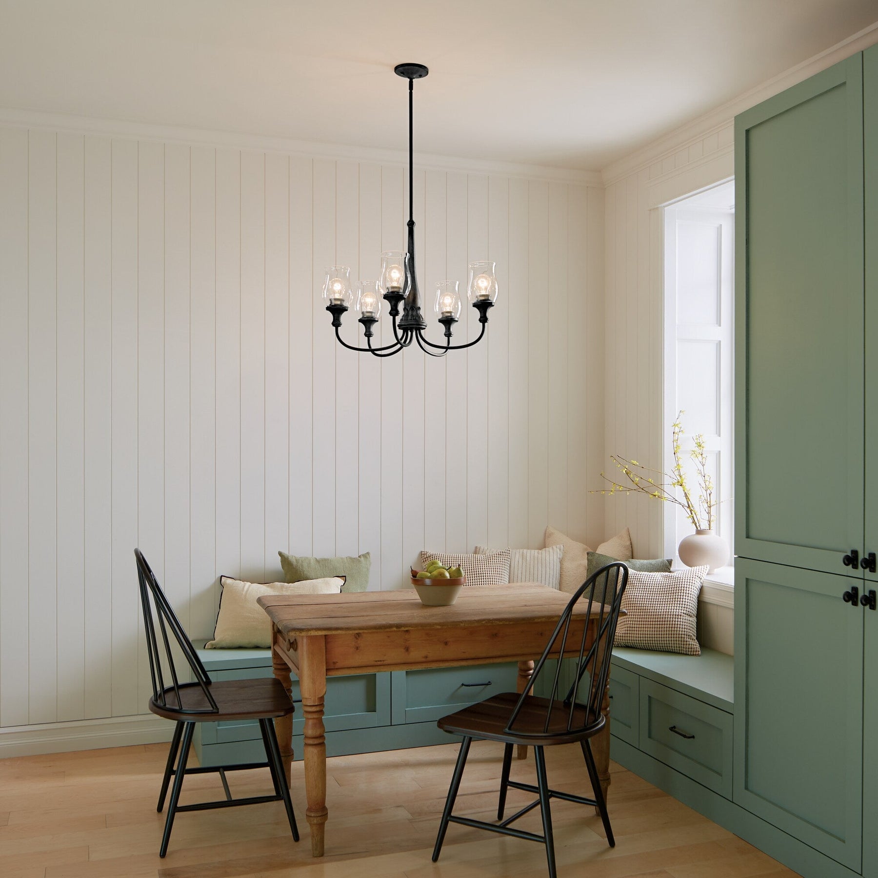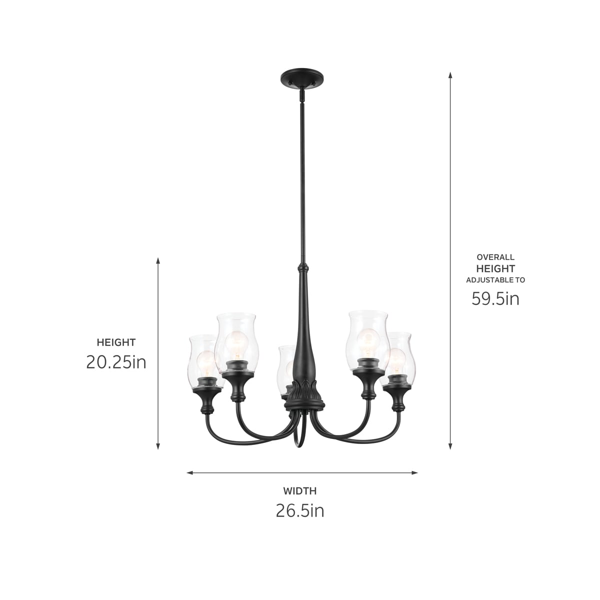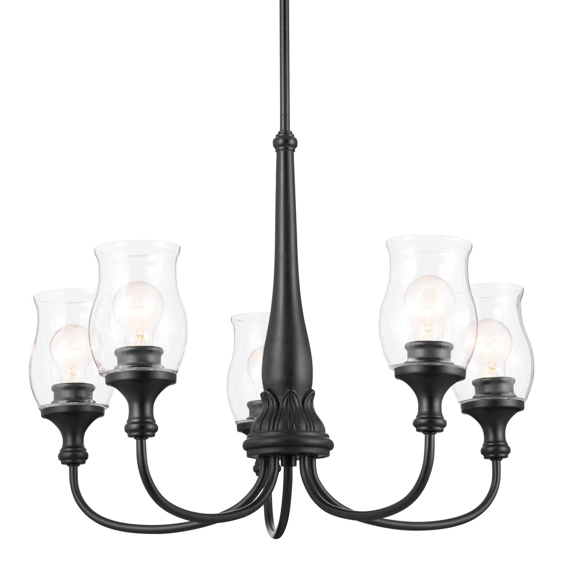 Illuminate your space with the Kichler Melis 5-Light Farmhouse Chandelier, a stunning blend of vintage charm and modern elegance. With a timeless black finish and clear glass shades, this chandelier seamlessly fits into kitchens, dining rooms, or any area longing for a touch of farmhouse warmth. Adjustable in height and crafted with intricate detailing, it's the perfect choice for creating ambient lighting.
