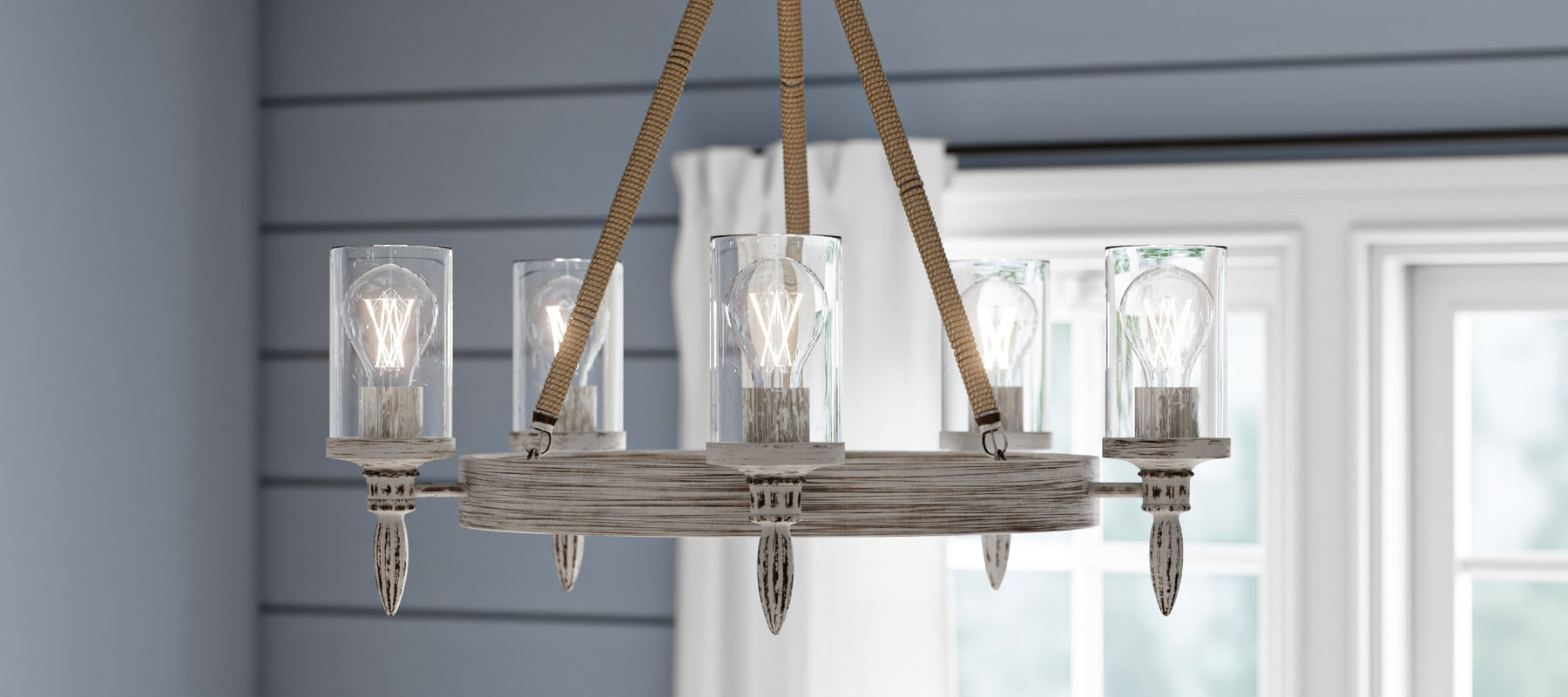 Transform your living area into a serene coastal retreat with the Minnow Chandelier from Kichler. The intricate rope accents and distressed antique white finish evoke the gentle charm of seaside abodes, while the clear seeded glass shades bathe your space in a sumptuous glow. Imagine pairing this piece with driftwood-inspired furniture or navy textiles for a nautically nuanced design. Essential for those who appreciate the intersection of relaxed elegance and high-end design, this chandelier is the epitome of coastal sophistication.