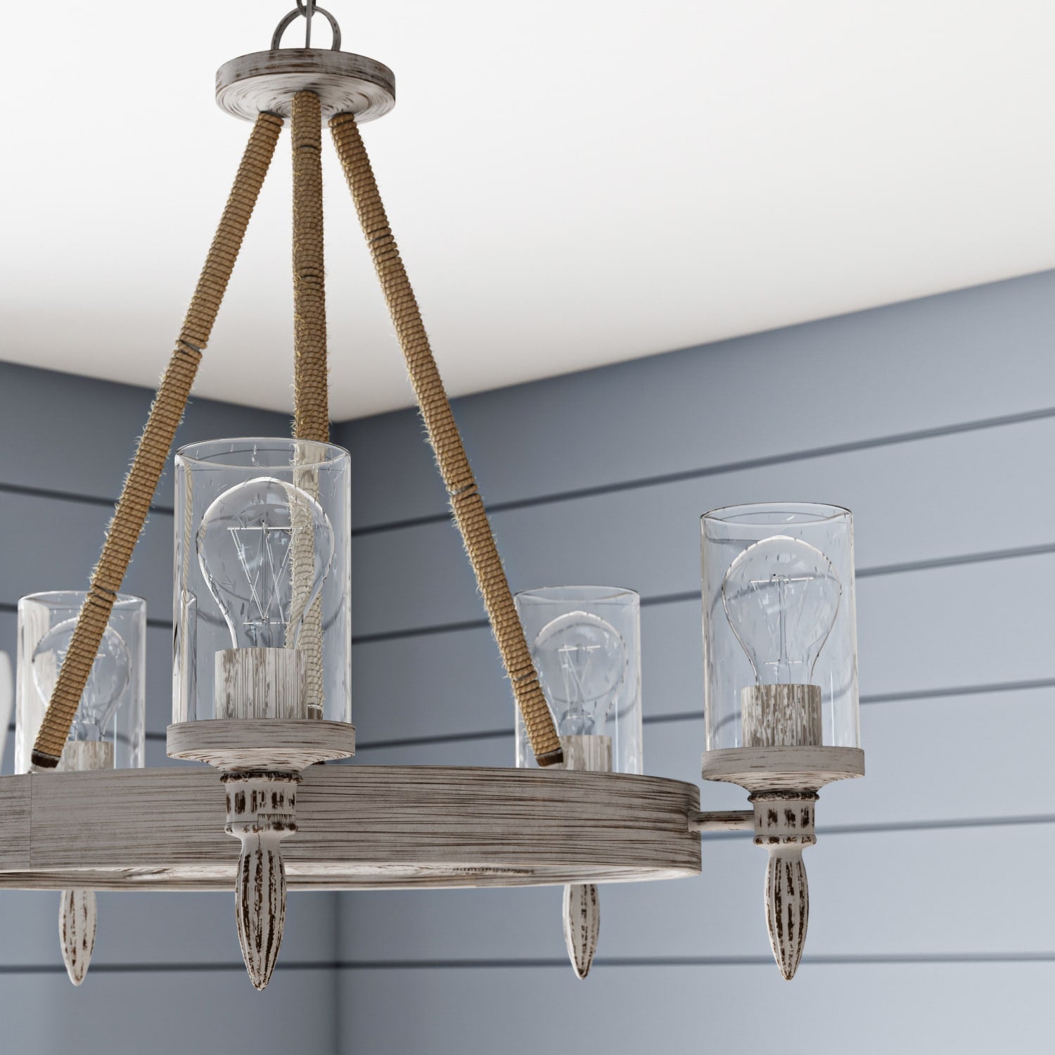 The Kichler Minnow 5-Light Chandelier embodies coastal charm with its distressed white finish and nautical accents. This chic chandelier features clear seeded glass shades that deliver warm, inviting illumination, perfect for any kitchen, dining, or living room setting.