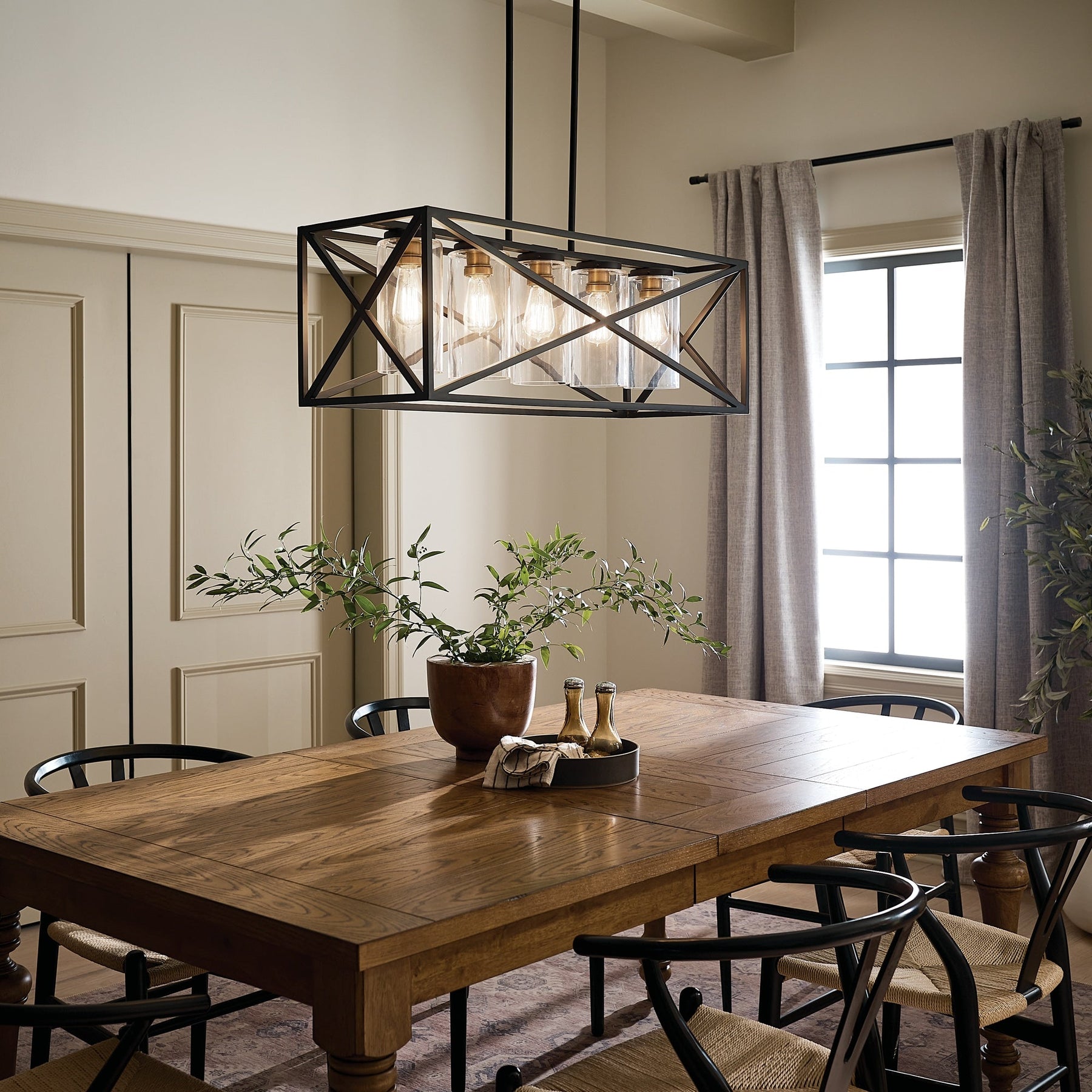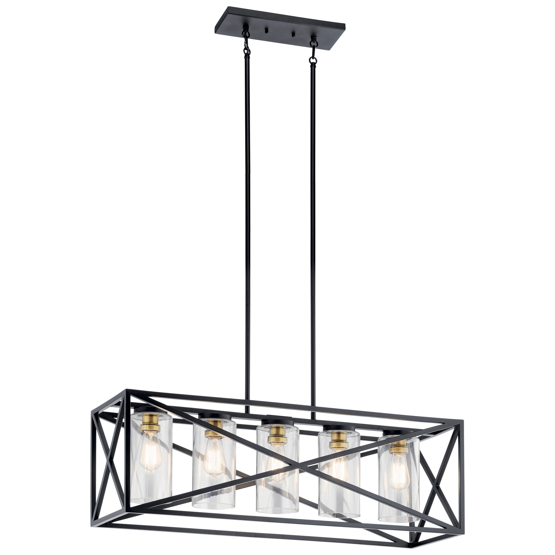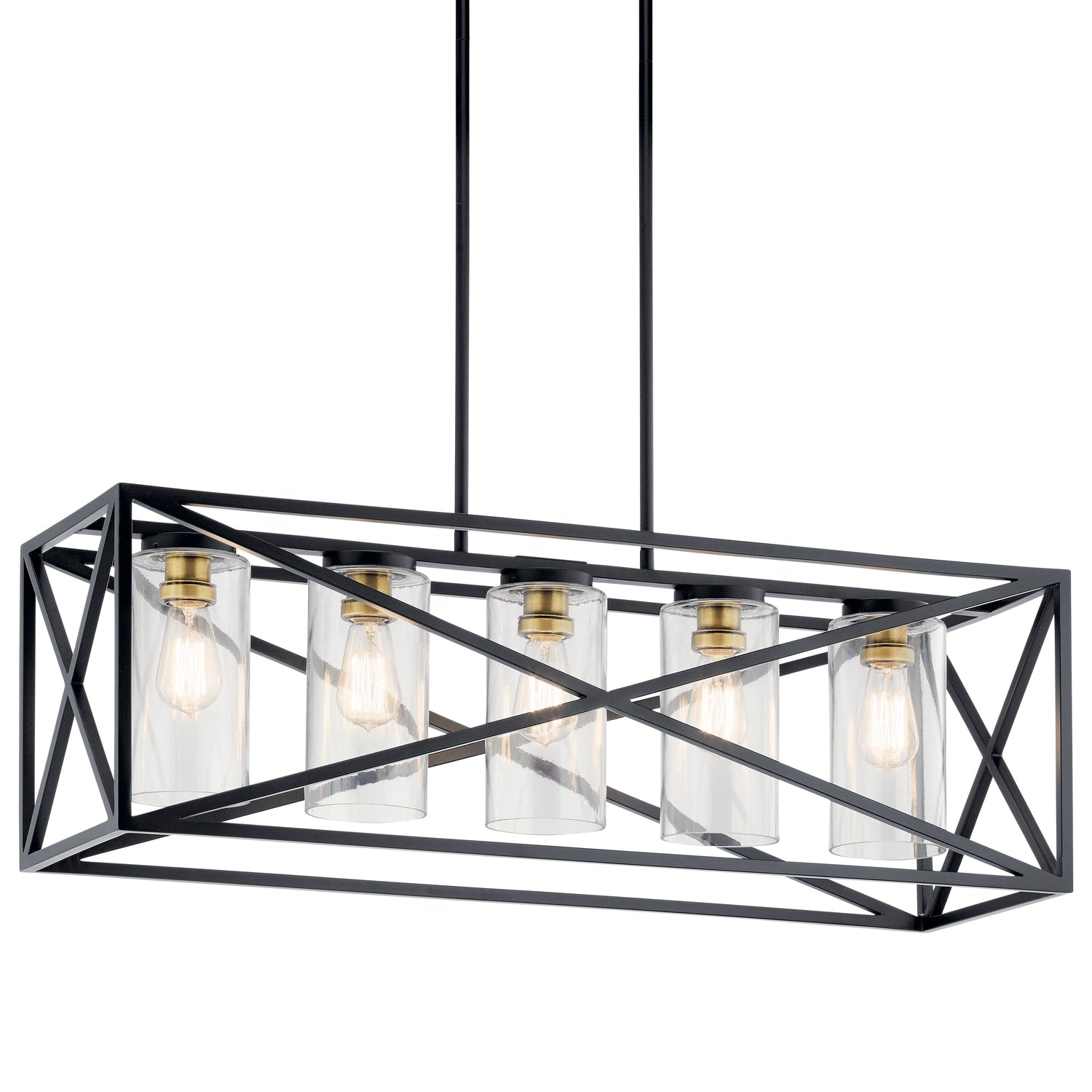 Illuminate your home with the Kichler Moorgate Farmhouse Chandelier, featuring a vintage industrial design inspired by vintage shipping crates. This 5-light linear fixture combines black and brass finishes with clear glass shades, perfect for rustic or lodge aesthetic environments.