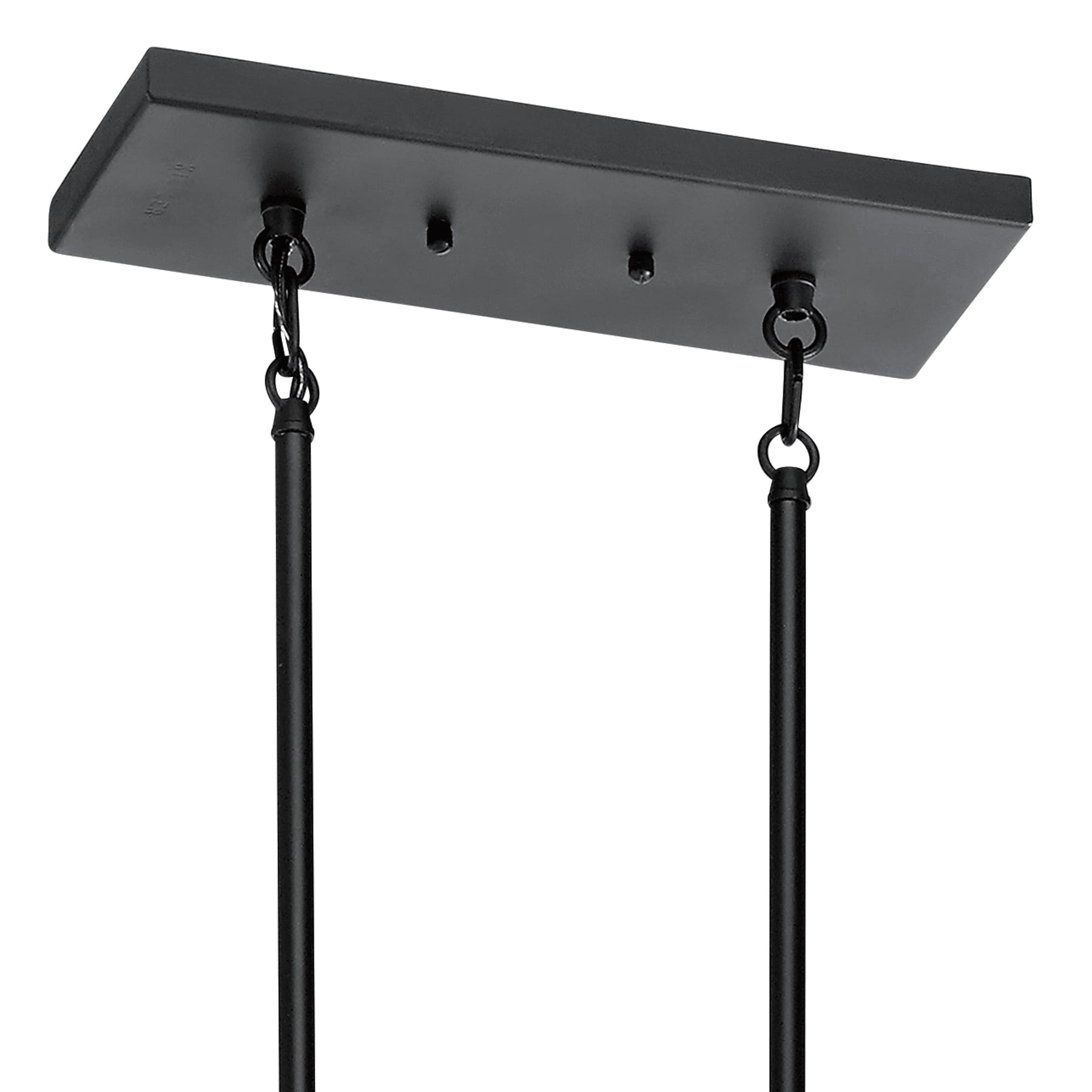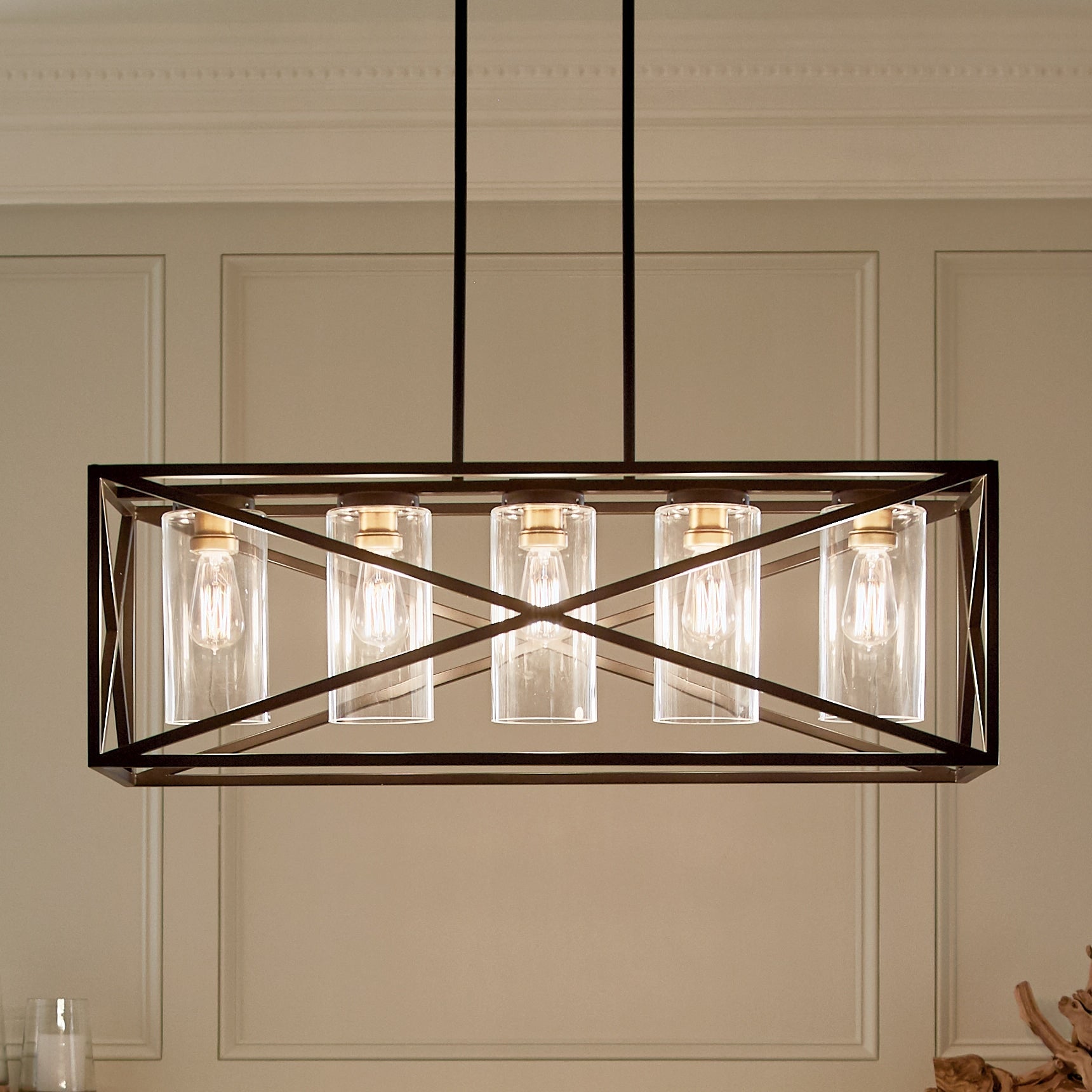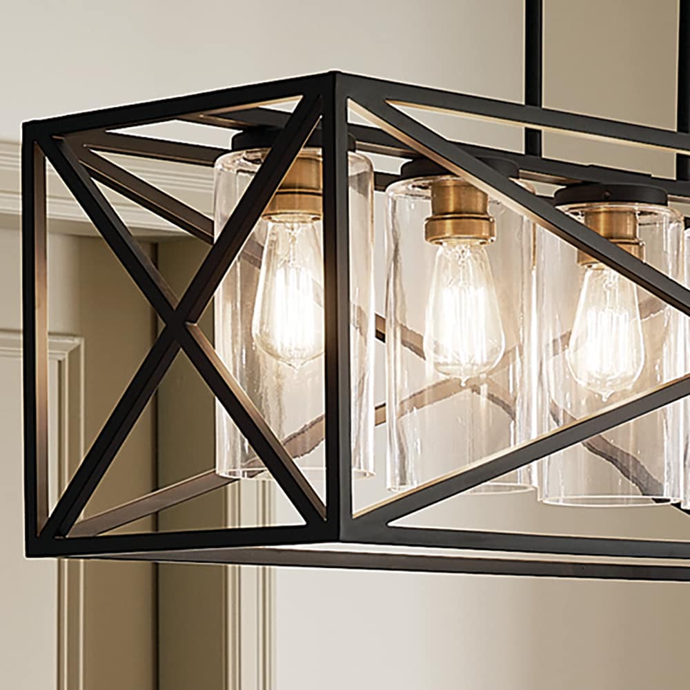 Illuminate your home with the Kichler Moorgate Farmhouse Chandelier, featuring a vintage industrial design inspired by vintage shipping crates. This 5-light linear fixture combines black and brass finishes with clear glass shades, perfect for rustic or lodge aesthetic environments.