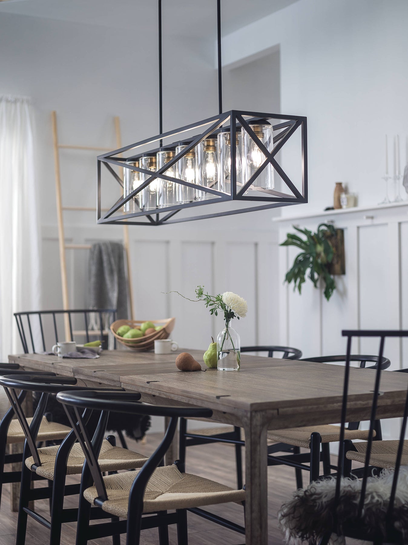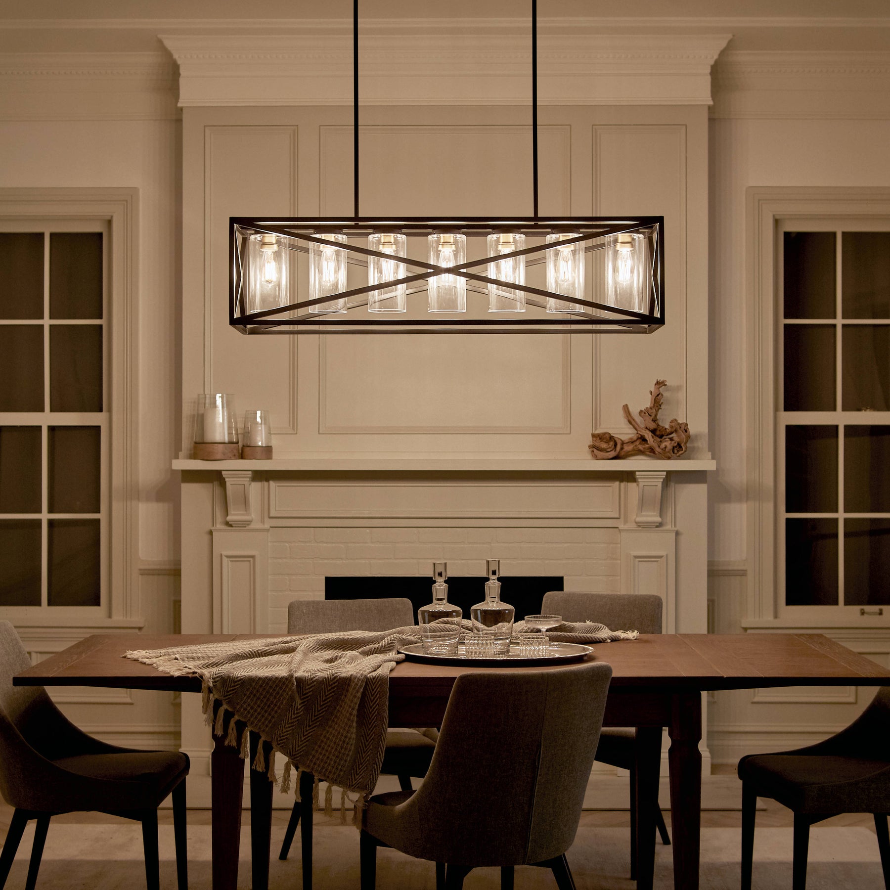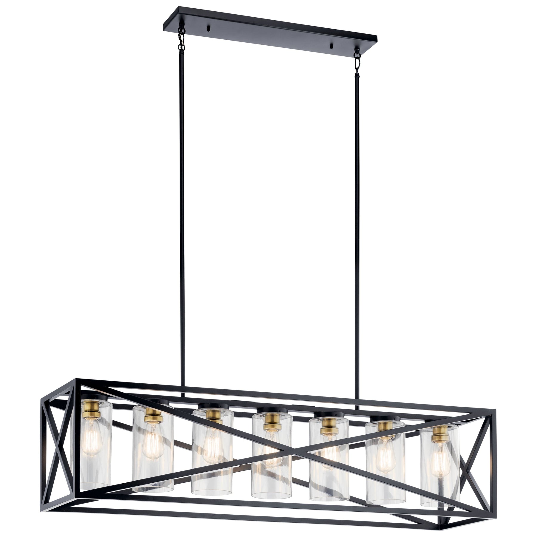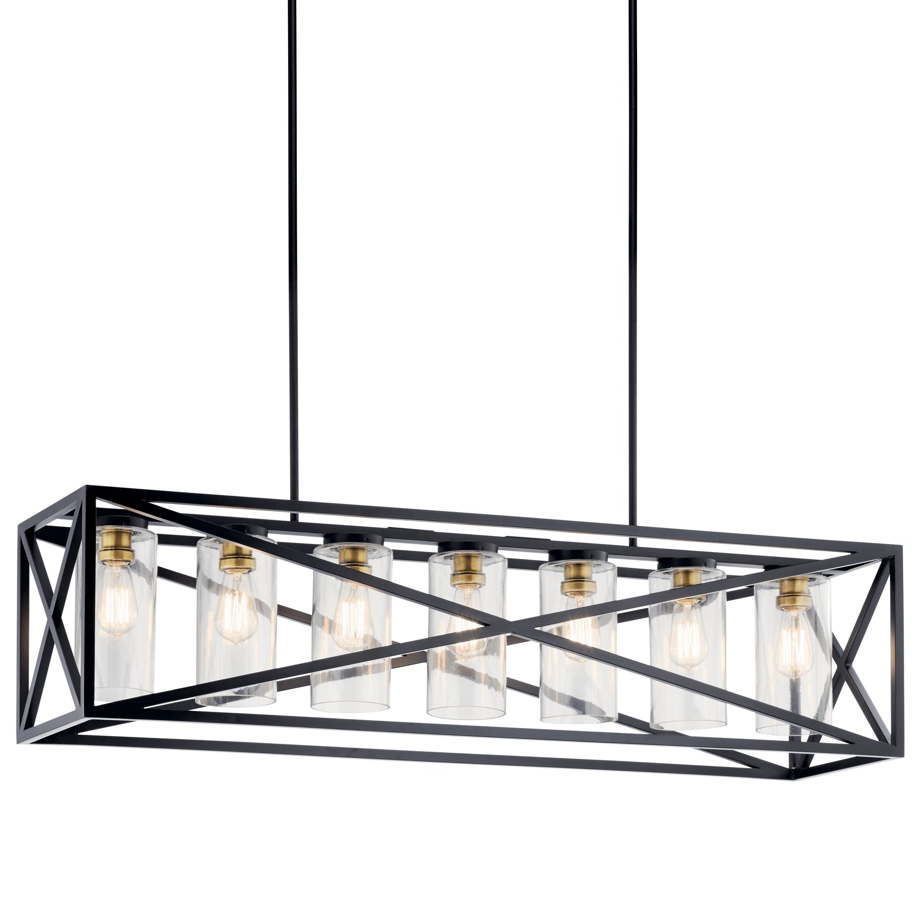 The Kichler Moorgate 7-Light Black Farmhouse Cage Chandelier marries vintage industrial design with modern elegance. Its black and brass finish paired with clear glass introduces a bold statement piece perfect for dining rooms or kitchen areas.