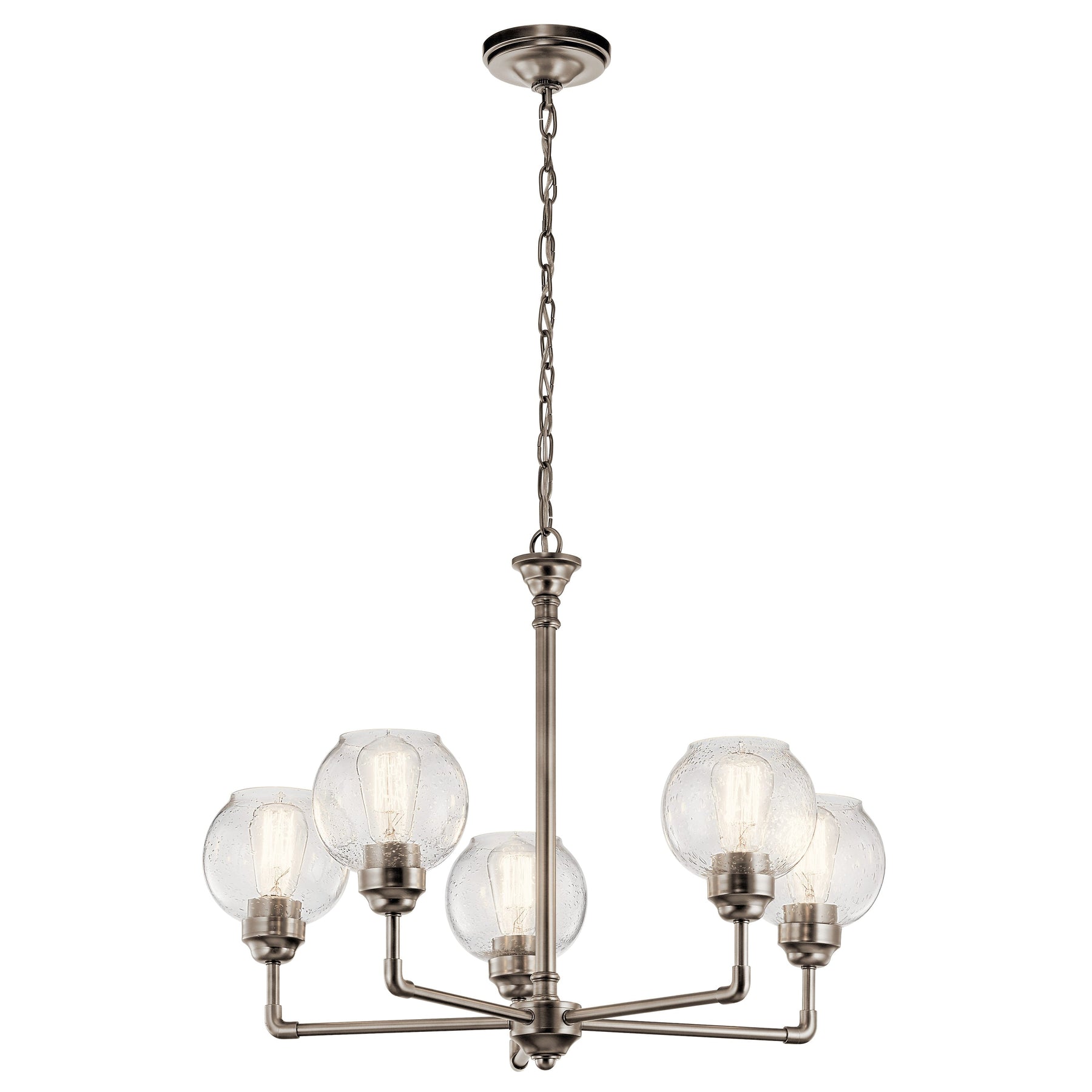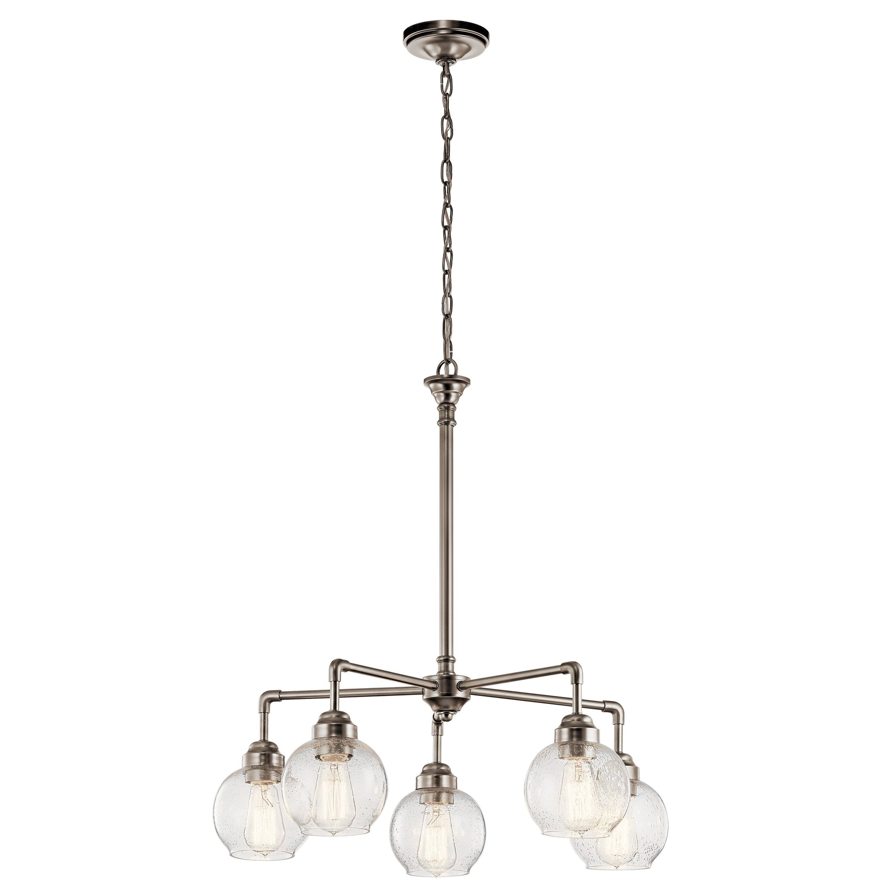 Bring an element of industrial-era elegance to your home with the Kichler Niles 5-Light Antique Pewter Chandelier. This transitional fixture offers clean lines and a globe-inspired design, perfect for dining rooms, living spaces, or foyers. Crafted from durable steel with a stunning antique pewter finish, it's an ideal centerpiece for both modern and traditional interiors.