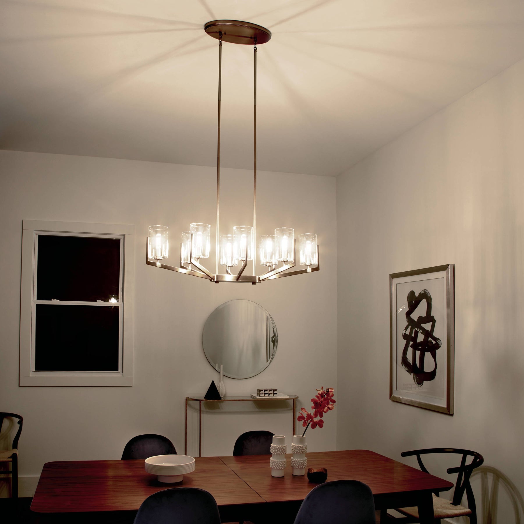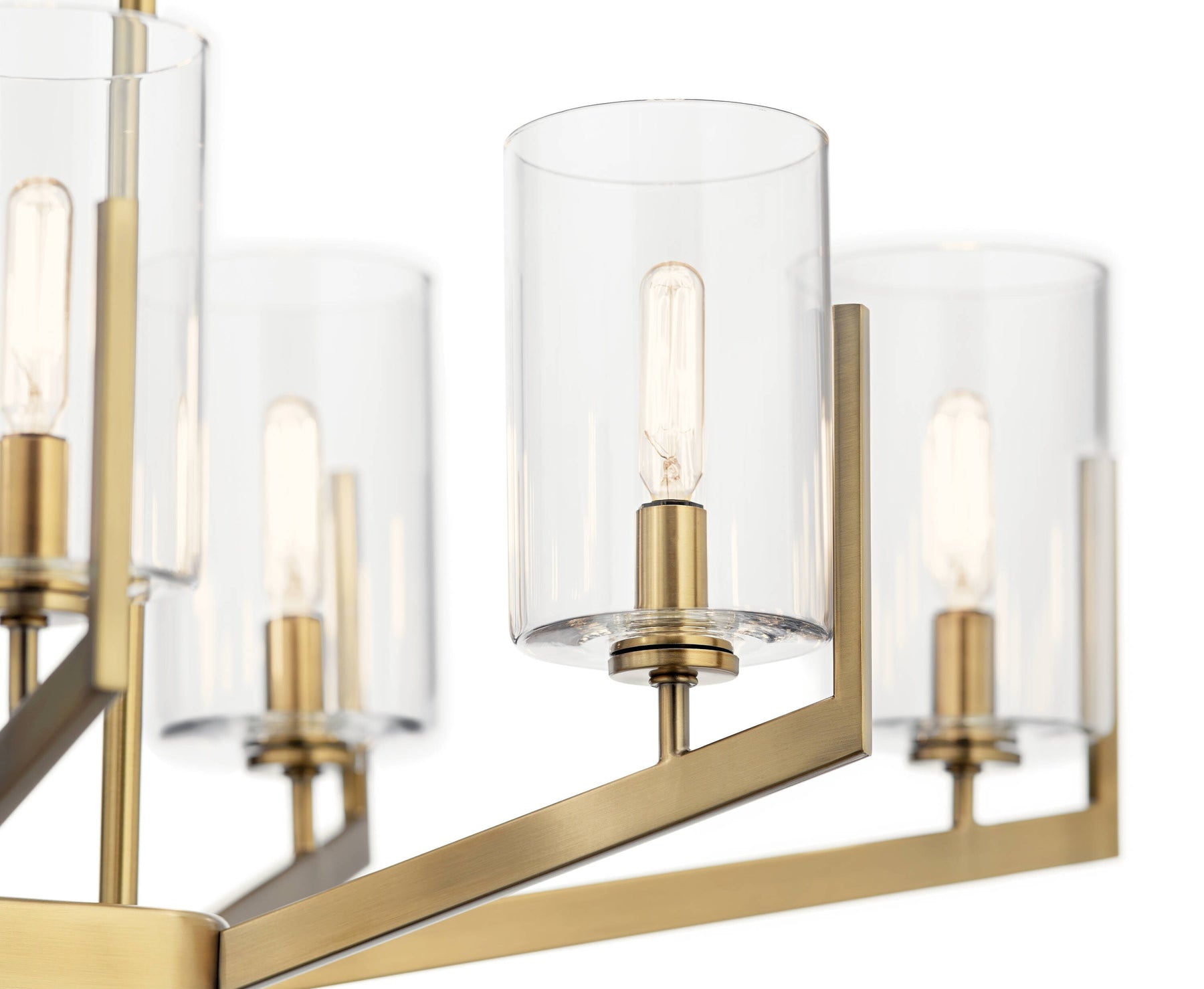 Elevate your interior with the Kichler Nye 8-Light Chandelier, a striking fusion of modern and transitional design elements. Crafted from elegant brushed natural brass and featuring clear glass shades, it casts a warm, inviting glow across dining rooms, living spaces, and foyers. Perfect for creating a sophisticated ambiance, this chandelier seamlessly complements a range of contemporary decors.