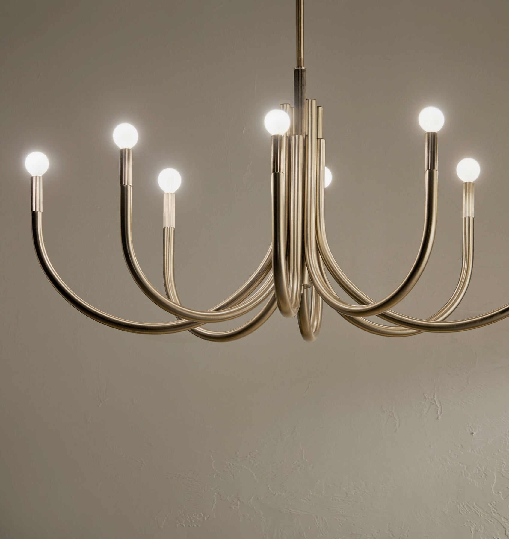 Envelop your room in the opulent glow of the Kichler Odensa 8-Light Chandelier. This fixture transcends ordinary lighting, presenting a symphony of elegance with its sinuous curves and exquisite champagne bronze finish. For a statement piece, place it over a grand dining table or within a chic foyer, allowing it to become the jeweler's hand at the heart of your design. Its transformative presence is essential for those who crave modern luxury interwoven with timeless aesthetics.