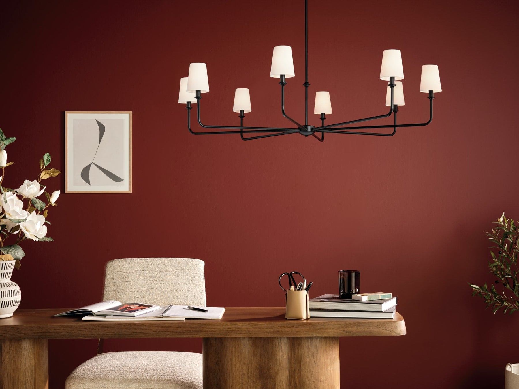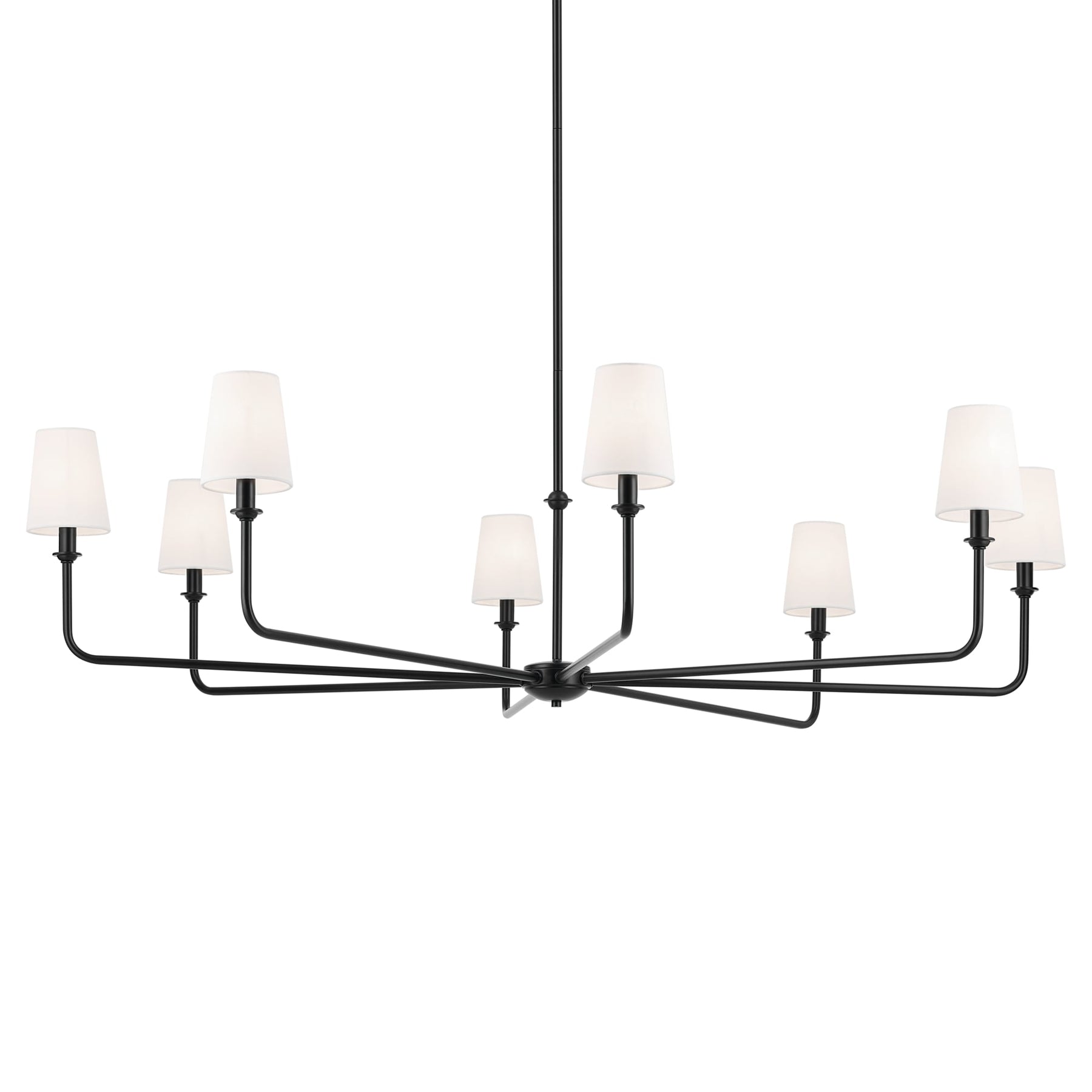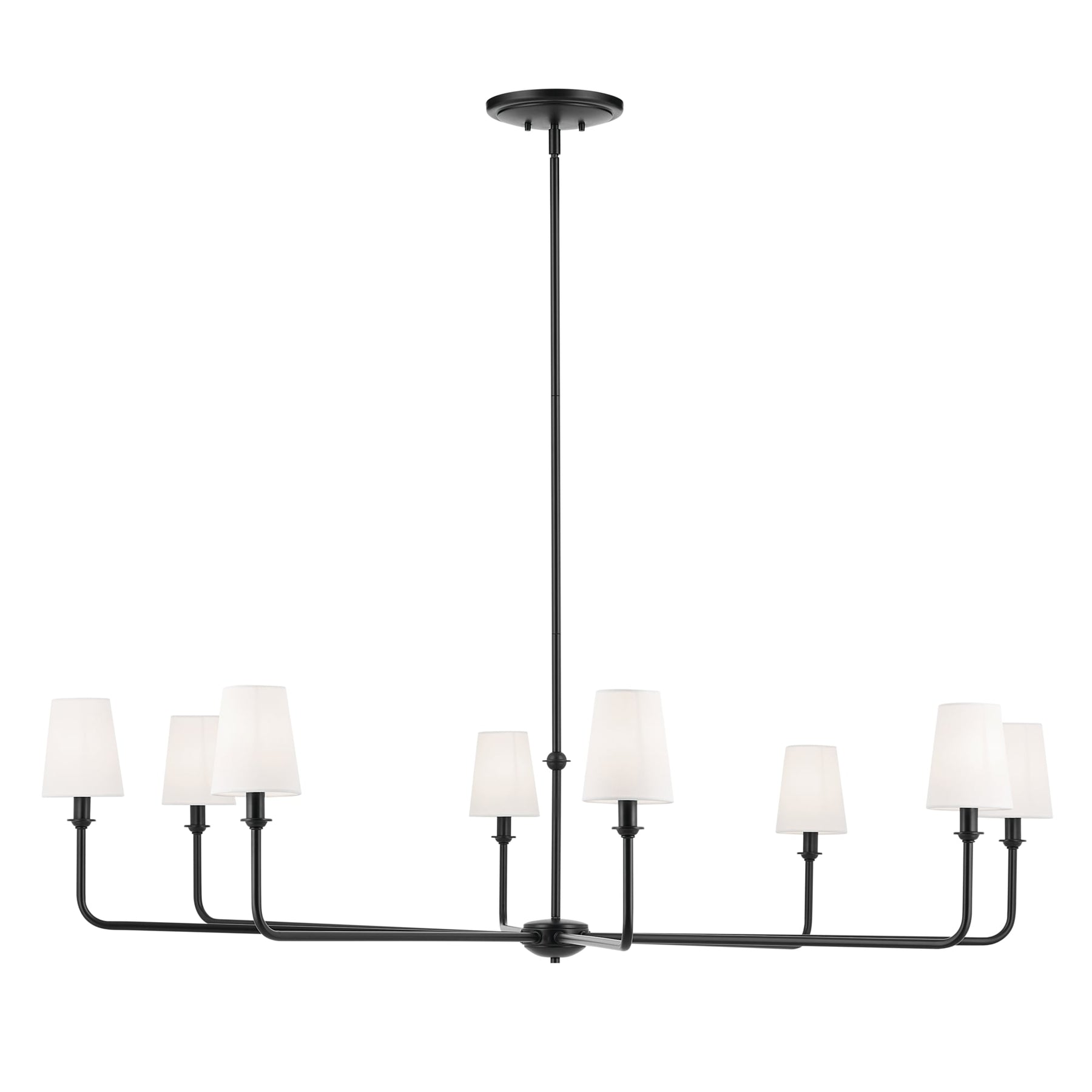 The Kichler Pallas 8-Light Black Chandelier combines elegant simplicity with superior craftsmanship for an exquisite lighting solution. Constructed with a durable steel frame, this chandelier offers stability and timeless style, making it a perfect focal point for any luxury setting. Customizable with interchangeable linen shades, its design provides flexible ambiance to enhance any expansive dining room, living room, or foyer.