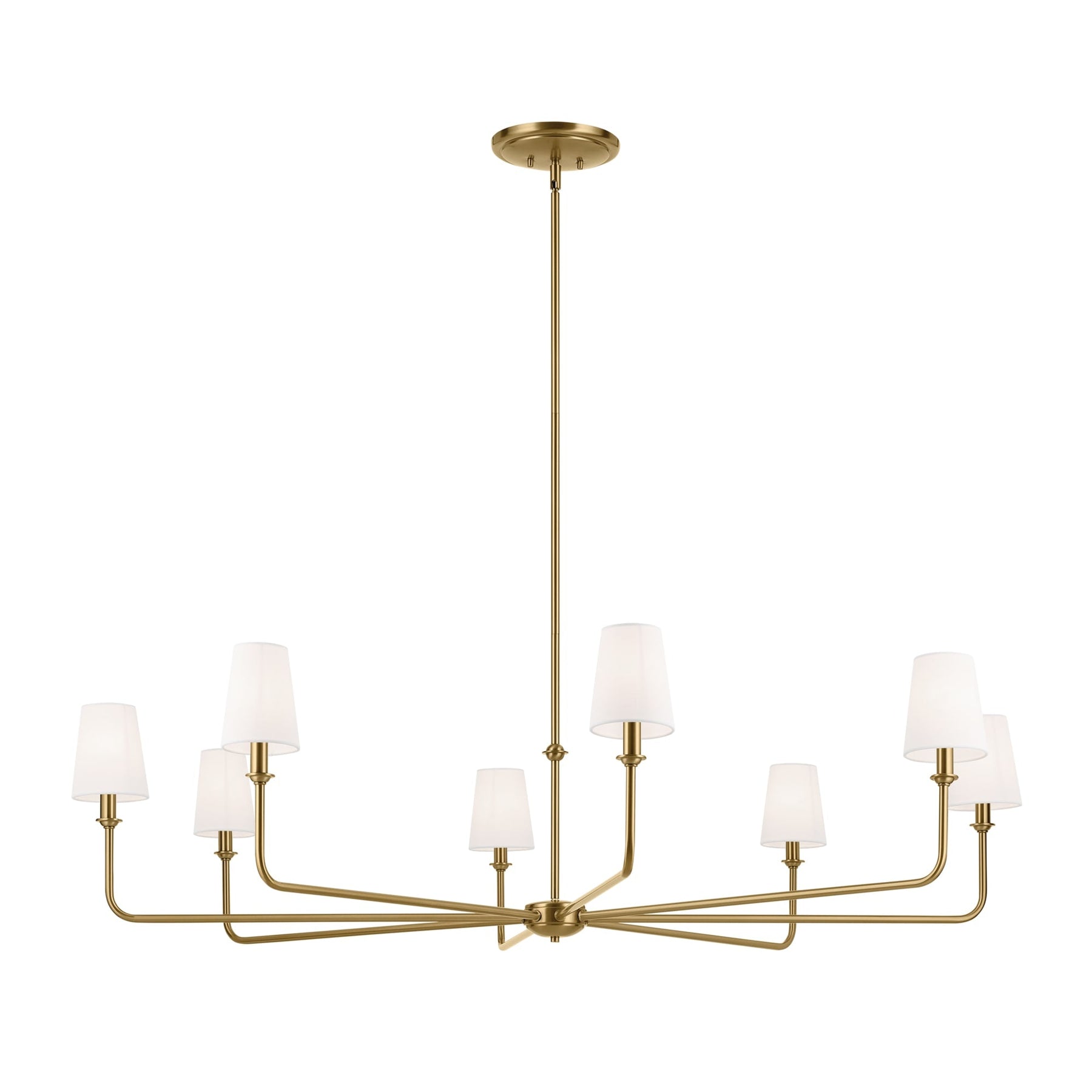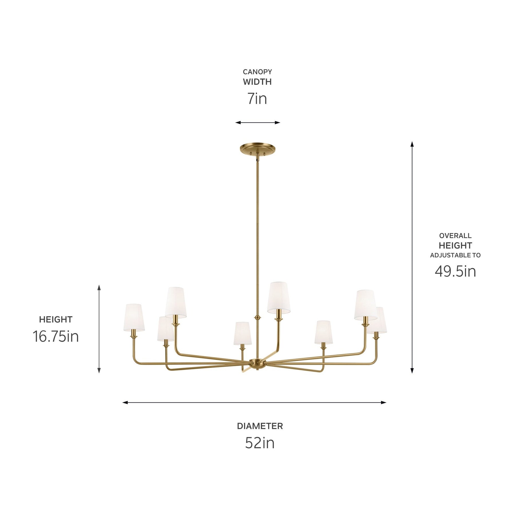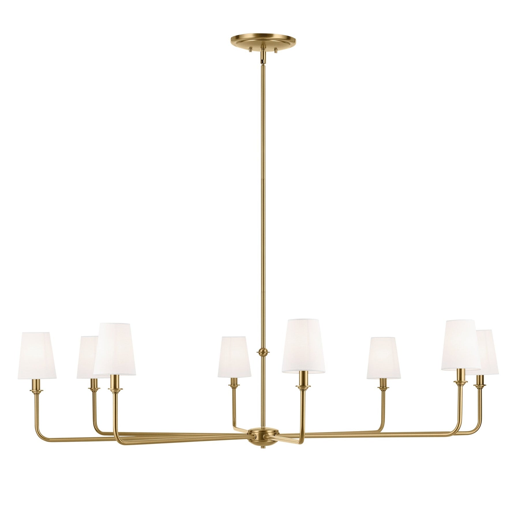 Illuminate your space with timeless elegance using the Kichler Pallas 8-Light Brushed Gold Chandelier. Crafted from durable steel with a luxurious brushed gold finish, this chandelier offers versatile styling options with or without the included linen shades, perfect for enhancing modern traditional interiors.