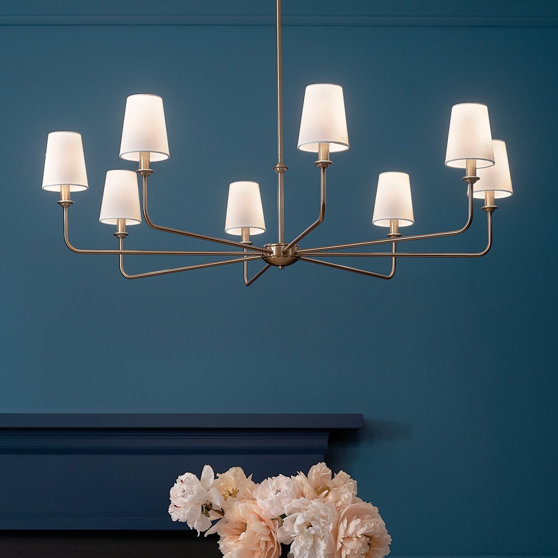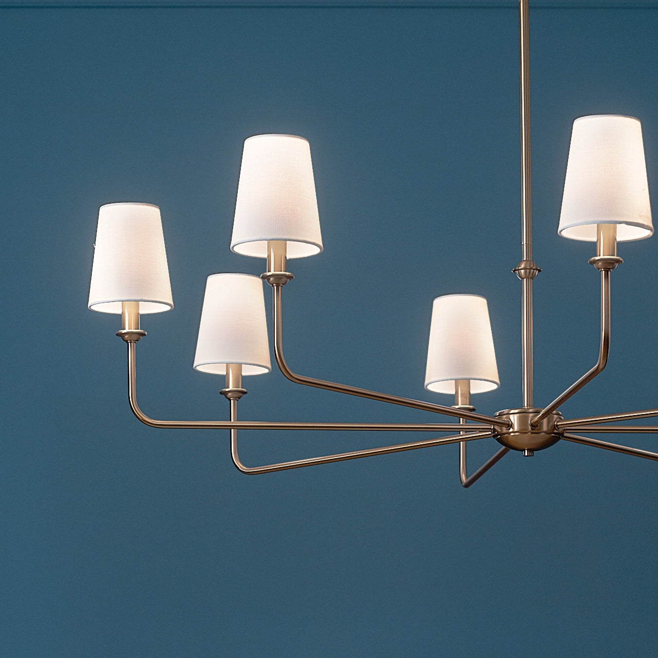 Illuminate your space with the Kichler Pallas 8-Light Traditional Chandelier. Featuring a brushed natural brass finish and white linen shades, this chandelier effortlessly merges classic elegance with modern refinement, perfect for creating an inviting atmosphere in any home.
