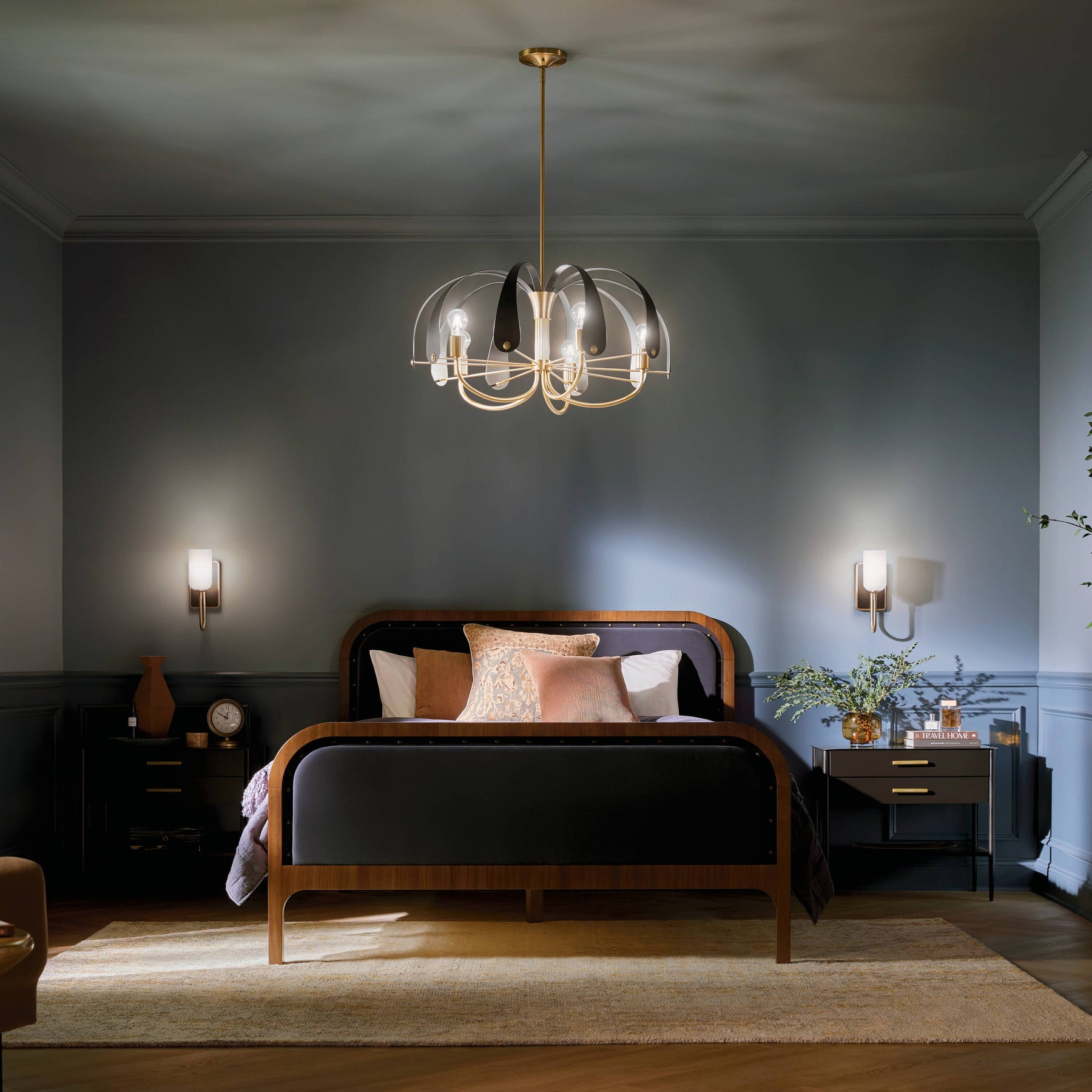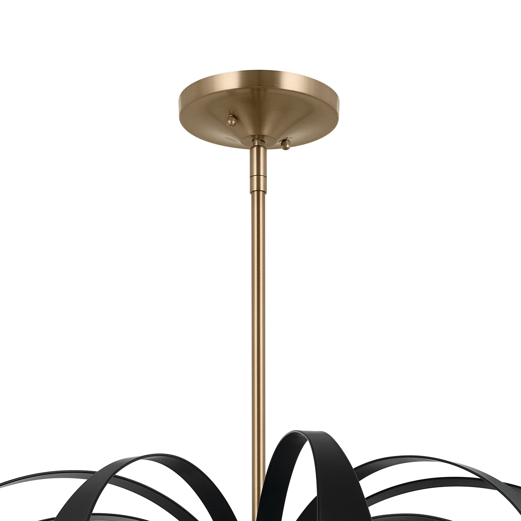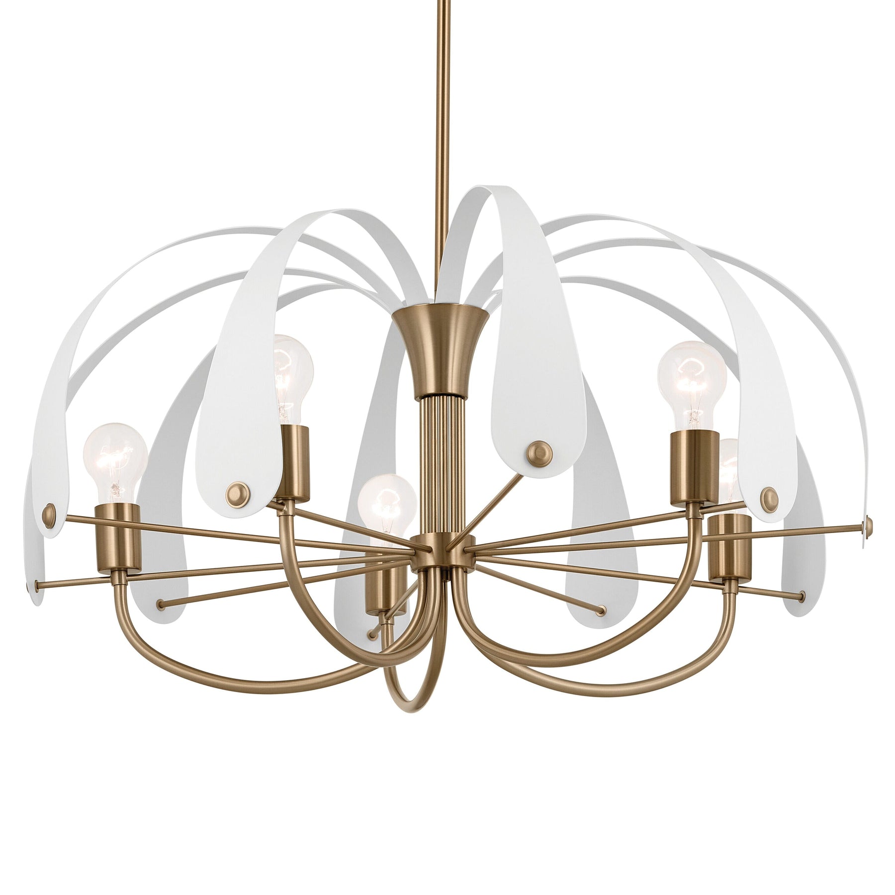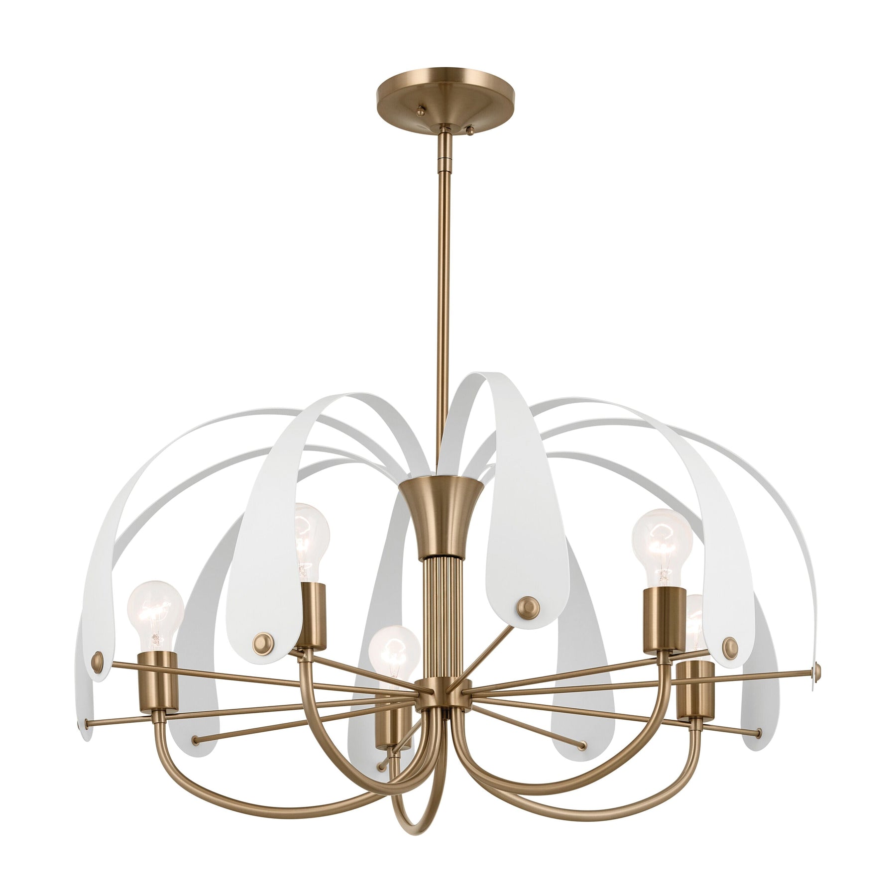 Illuminate your space with the Kichler Petal 5-Light Gold Vintage Chandelier, a stunning blend of Art Deco elegance and modern versatility. This exquisite fixture features a sophisticated champagne bronze finish and customizable straps, making it a perfect statement piece for any luxurious setting.