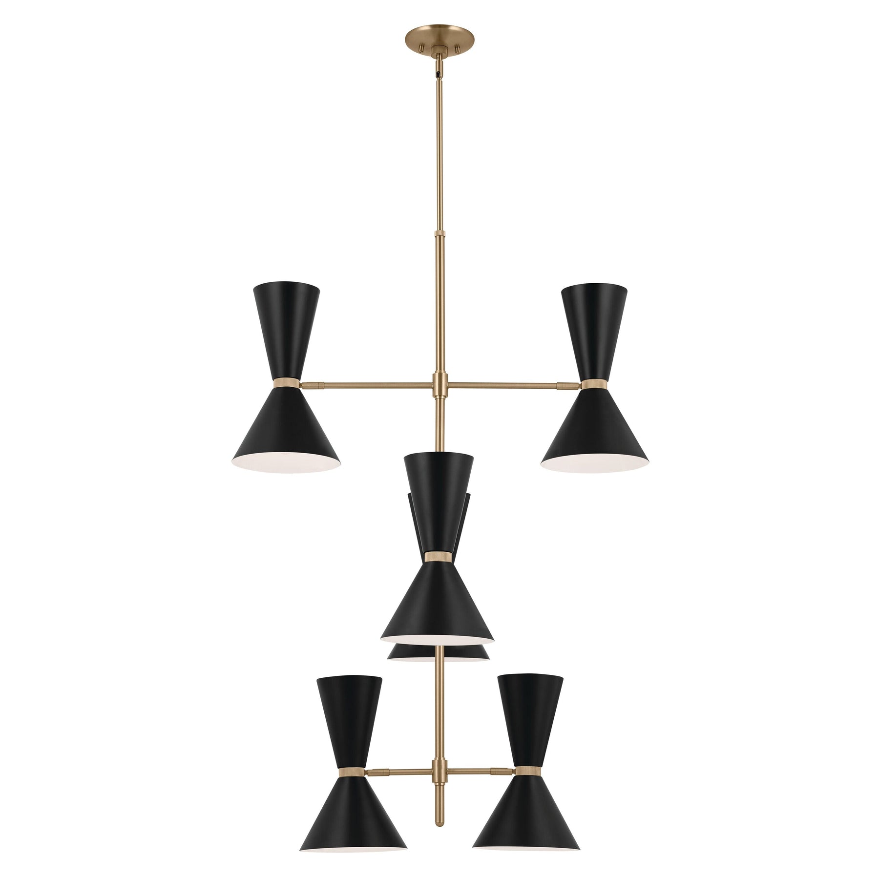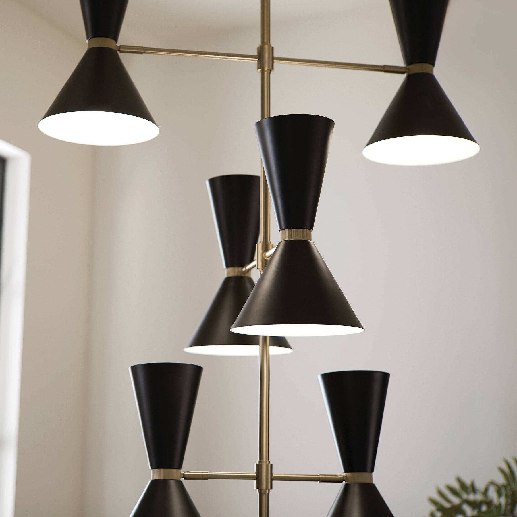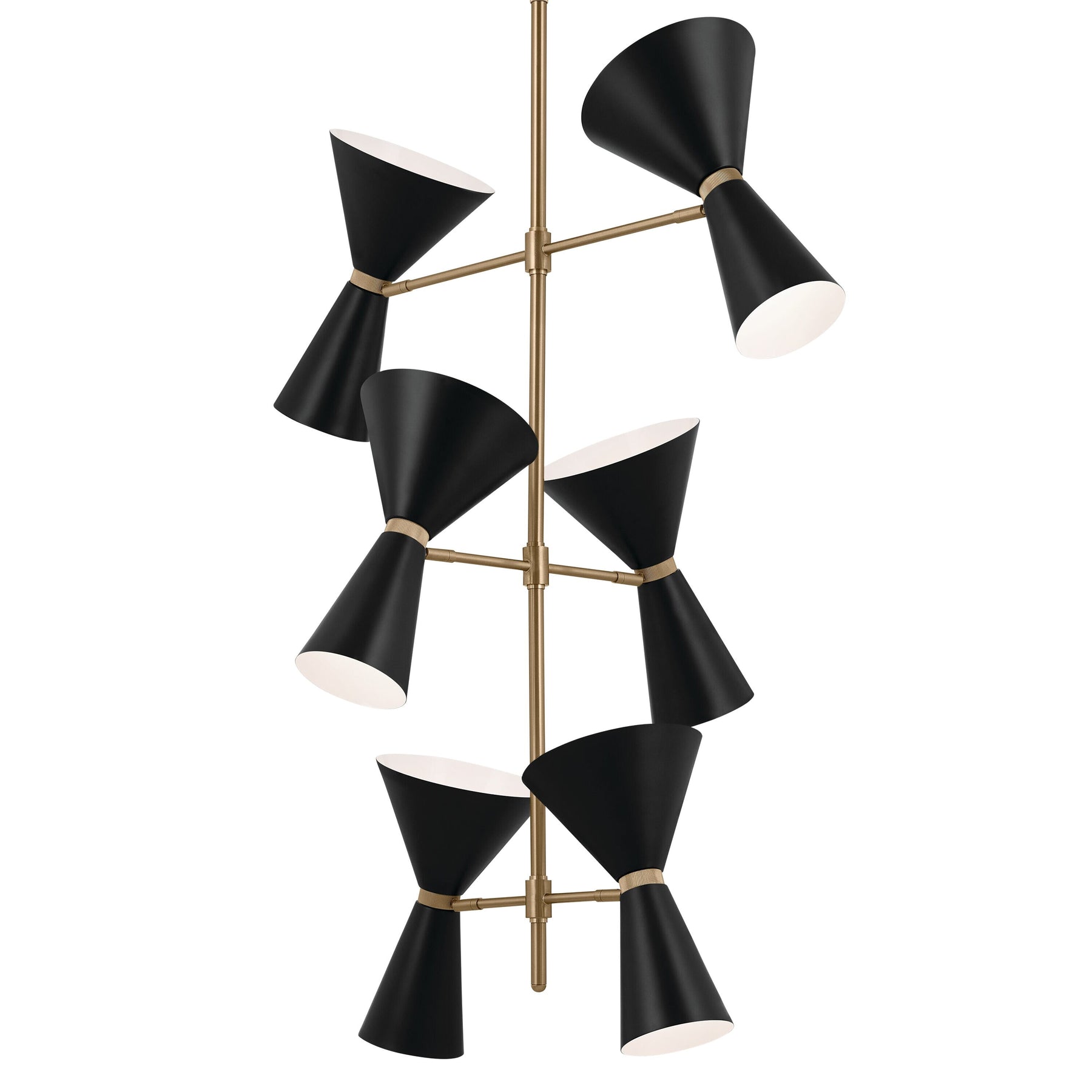 Illuminate your space with the Kichler Phix 12-Light Mid-century Chandelier. Blending modern elegance with retro charm, this luxurious fixture features a brushed gold finish complemented by sleek black shades, adding sophistication to any room with high ceilings.