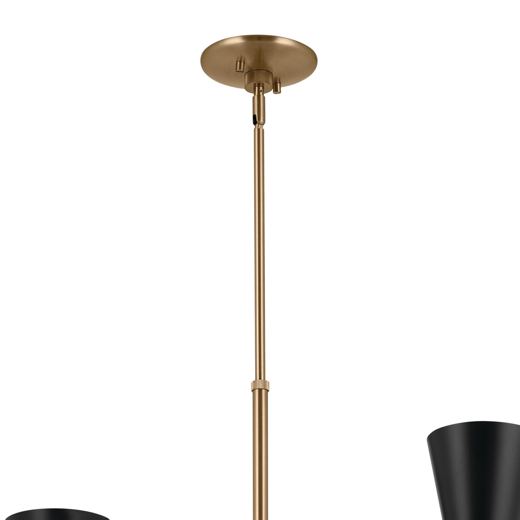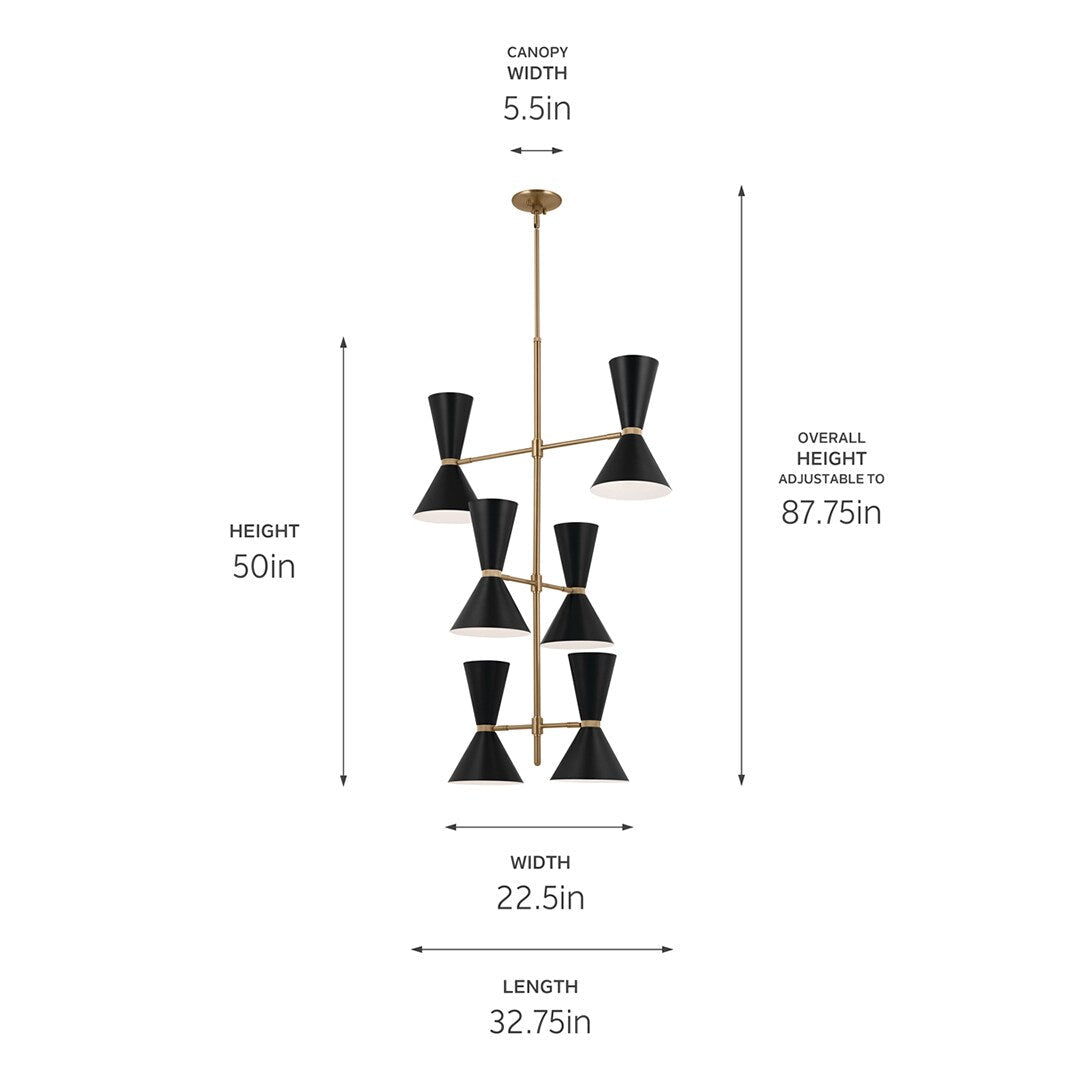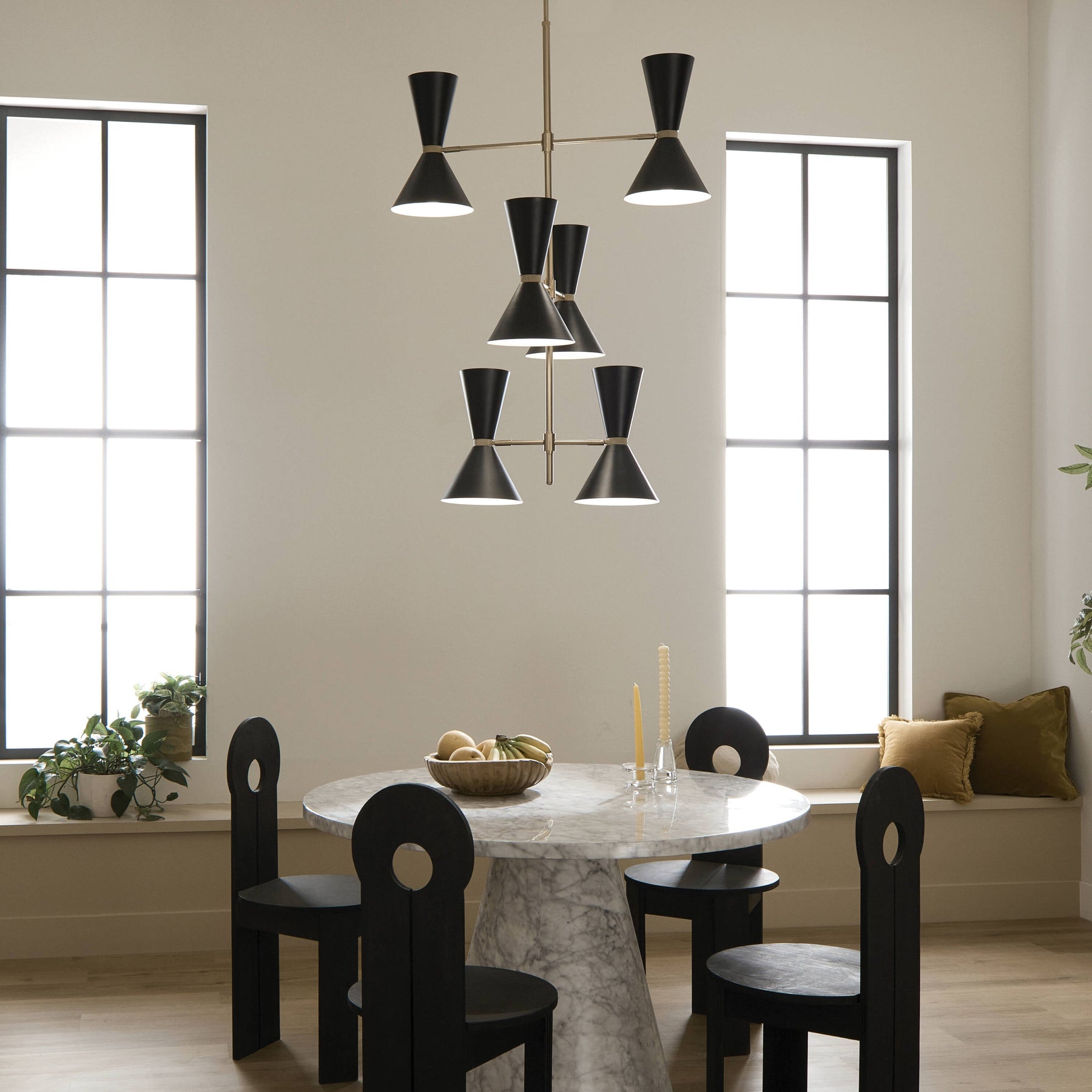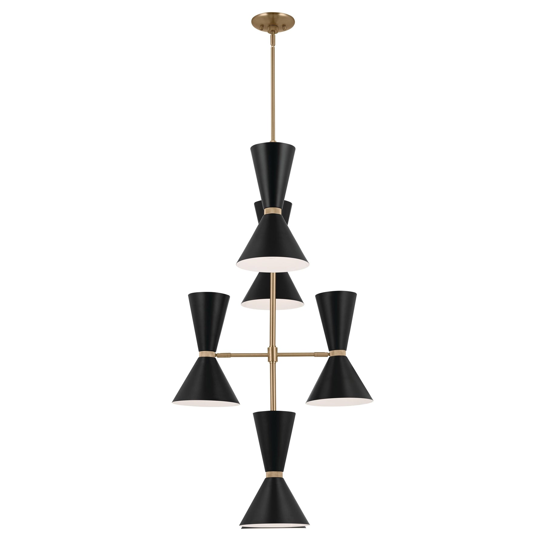 Illuminate your space with the Kichler Phix 12-Light Mid-century Chandelier. Blending modern elegance with retro charm, this luxurious fixture features a brushed gold finish complemented by sleek black shades, adding sophistication to any room with high ceilings.