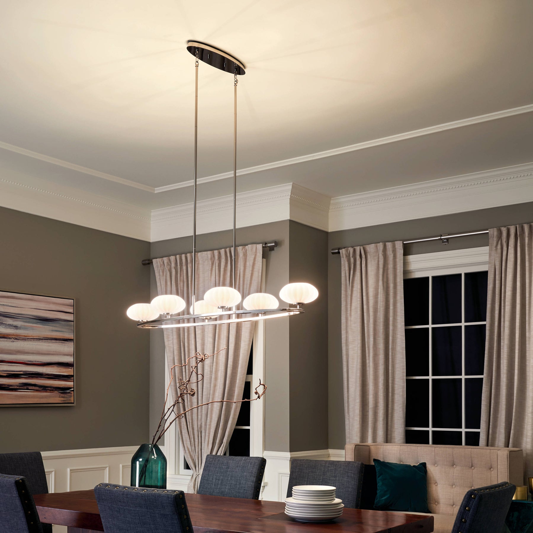 Elevate your home with the chic and contemporary Kichler Pim 6-Light Chandelier. This stunning fixture features polished nickel and satin etched cased opal glass to provide warm, ambient lighting for any dining room, living room, or kitchen space. Perfect for contemporary and transitional decor, this chandelier brings an upscale touch to any room.