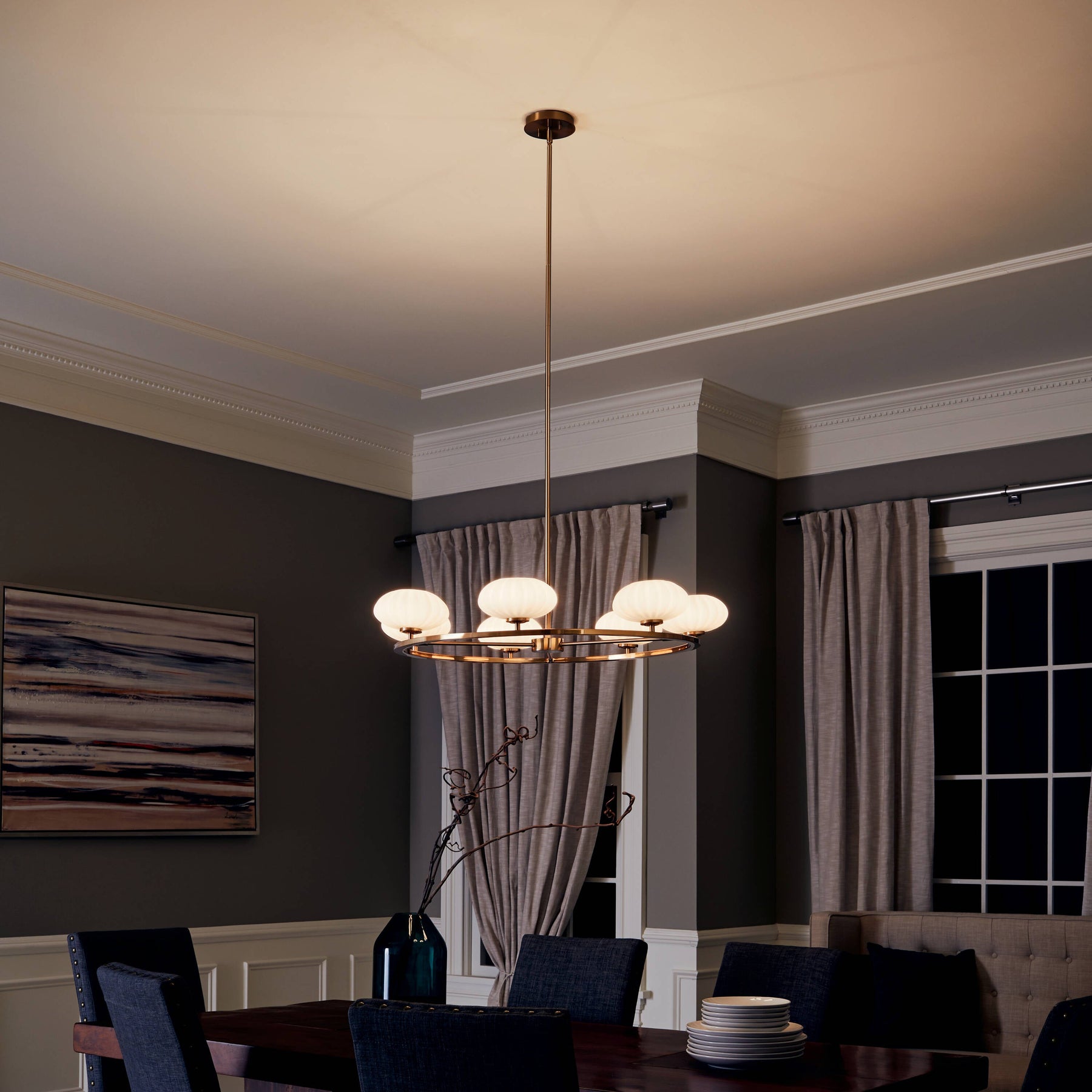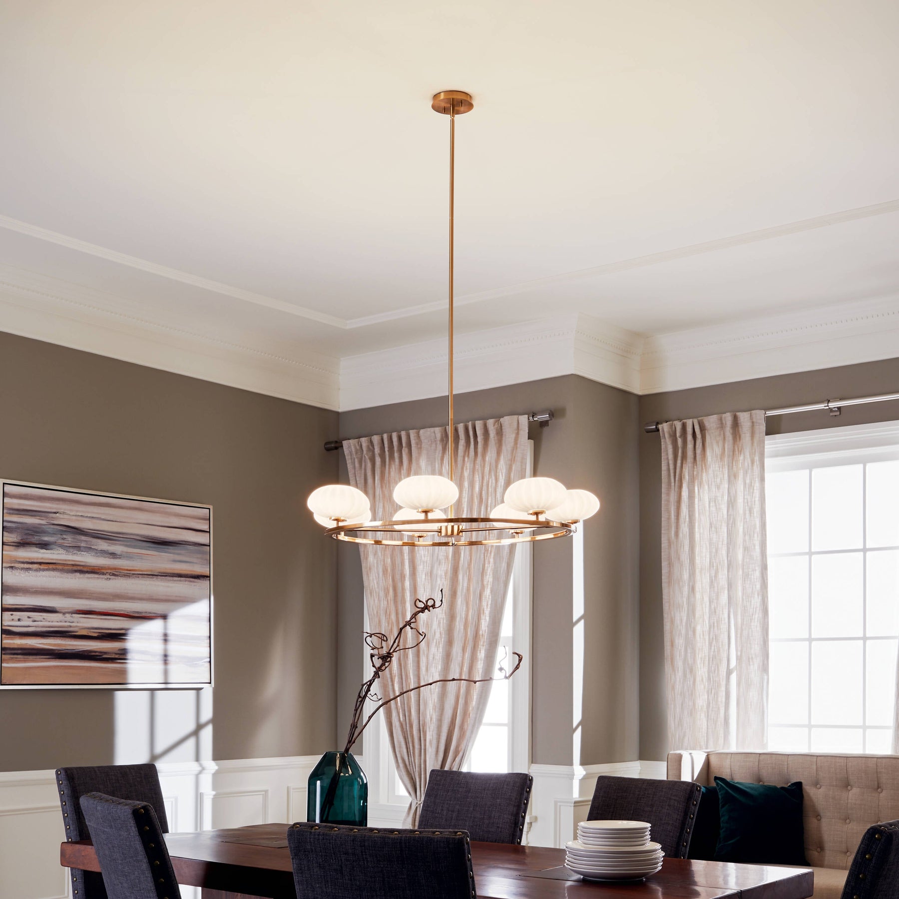 The Kichler Pim 7-Light Gold Modern/Contemporary Chandelier merges mid-century elegance with contemporary flair, perfect for transforming any room into a luxurious escape. Featuring a striking fox gold finish and satin etched cased opal glass, this chandelier provides ambient, gentle light ideal for social or intimate settings. Elevate your space with this sophisticated statement piece, harmoniously bestowing charm and modernity.