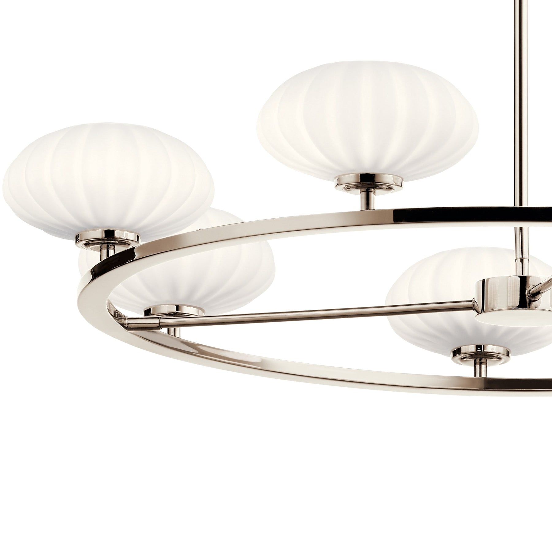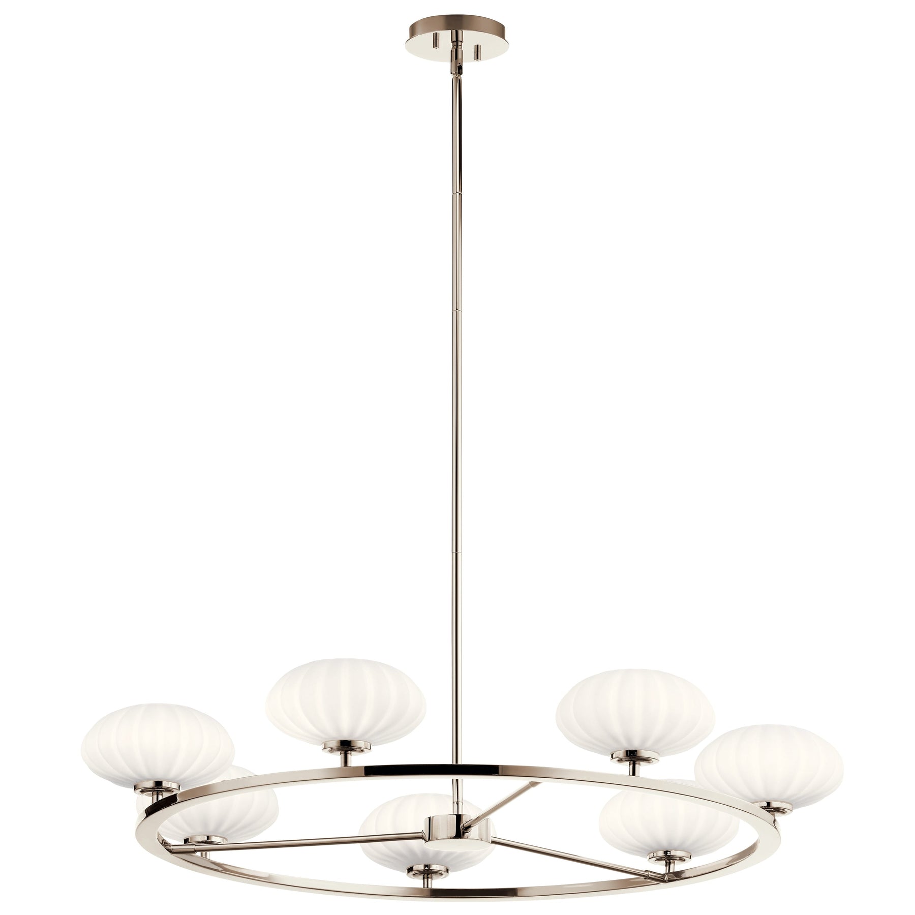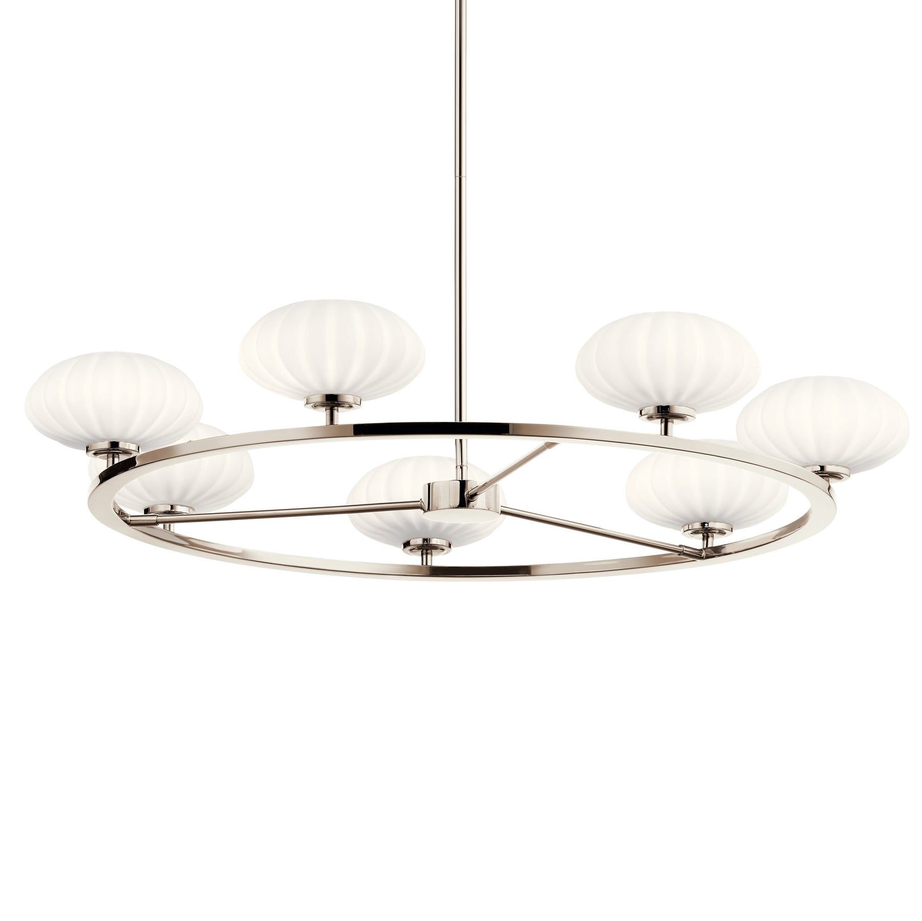 Experience lighting as art with the Kichler Pim Chandelier, where polished nickel meets the soft, diffused glow of satin etched glass. This captivating chandelier transforms a mundane room into a sumptuous statement, harmonizing seamlessly with your contemporary or transitional decor. Use it to illuminate a grand dining table or as a centerpiece in an open-concept living area. Not just a light fixture, it's an essential piece of art that elevates the luxurious ambiance of your home.