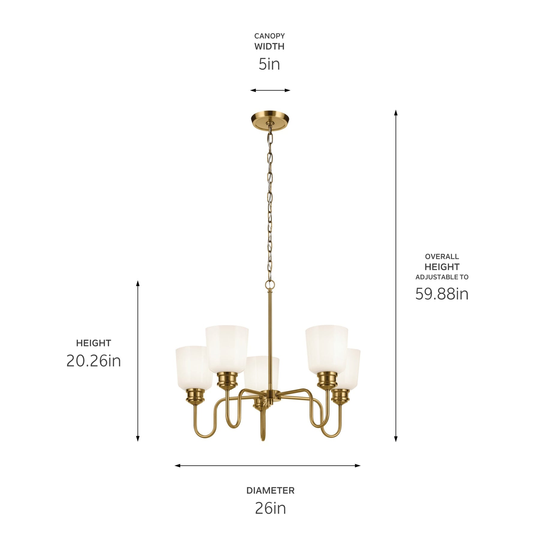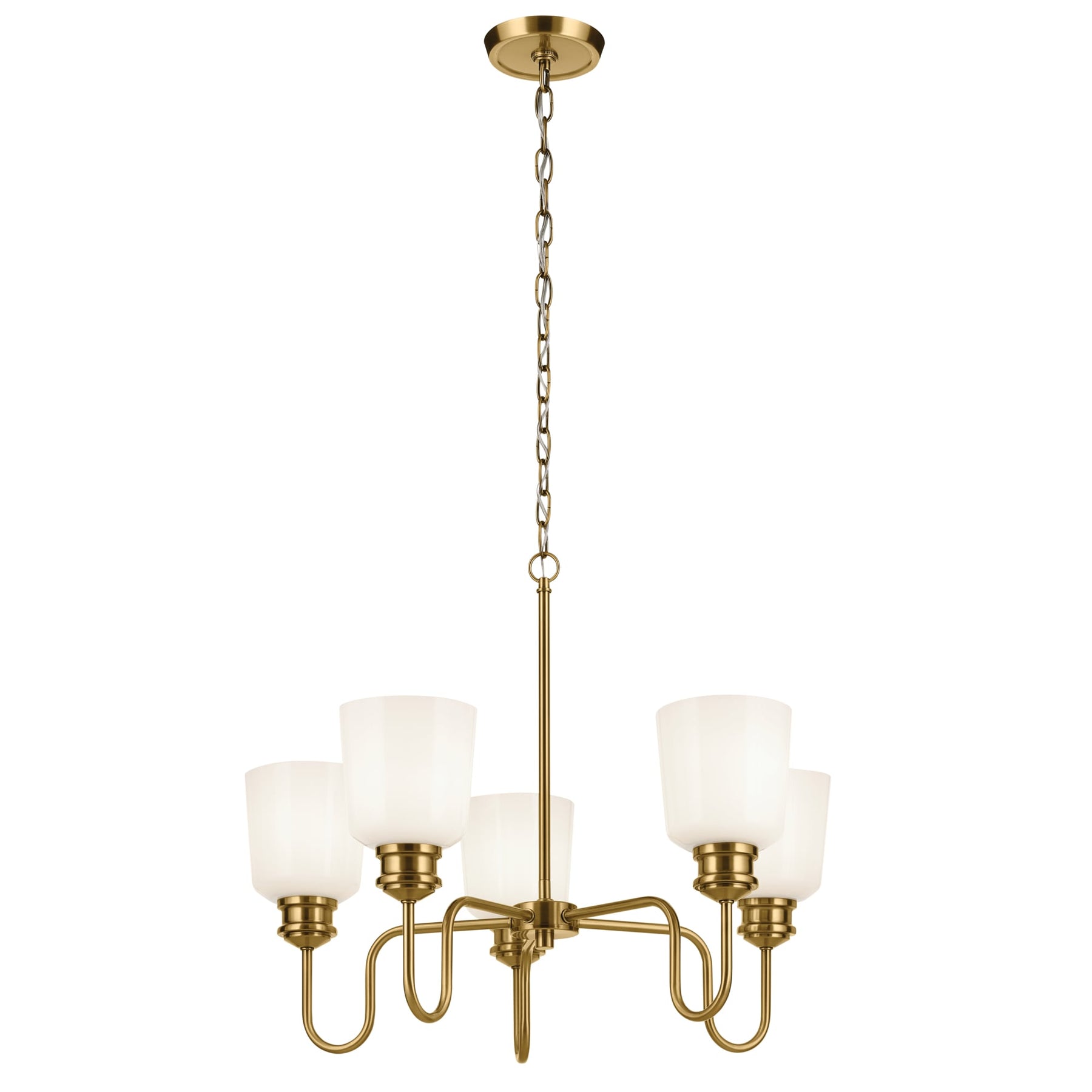 Illuminate your space with the Kichler Renneker 5-Light Vintage Chandelier, a captivating blend of vintage elegance and modern craftsmanship. This chandelier effortlessly combines a brushed natural brass finish with opal glass shades to create a warm, inviting ambiance perfect for any dining room or foyer.
