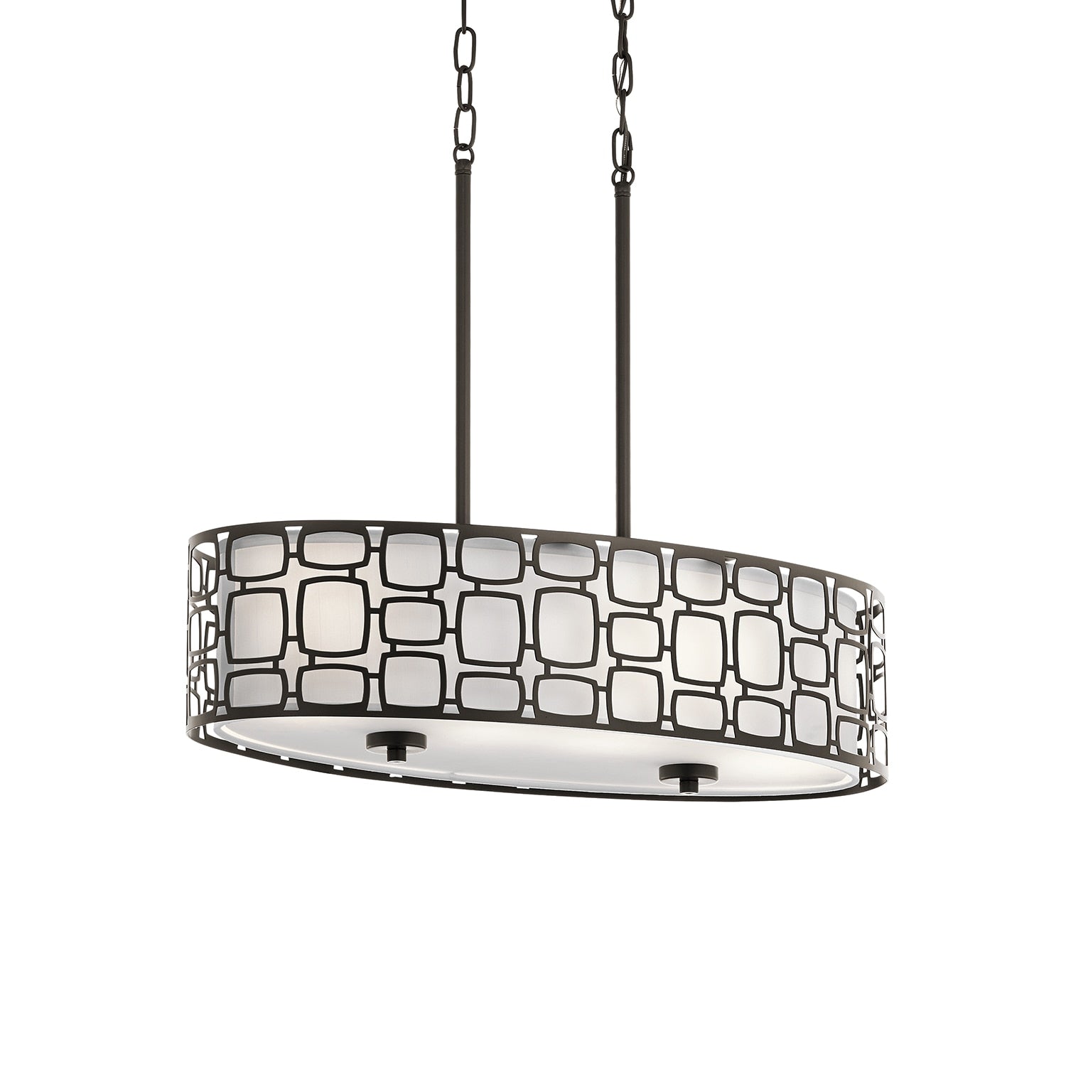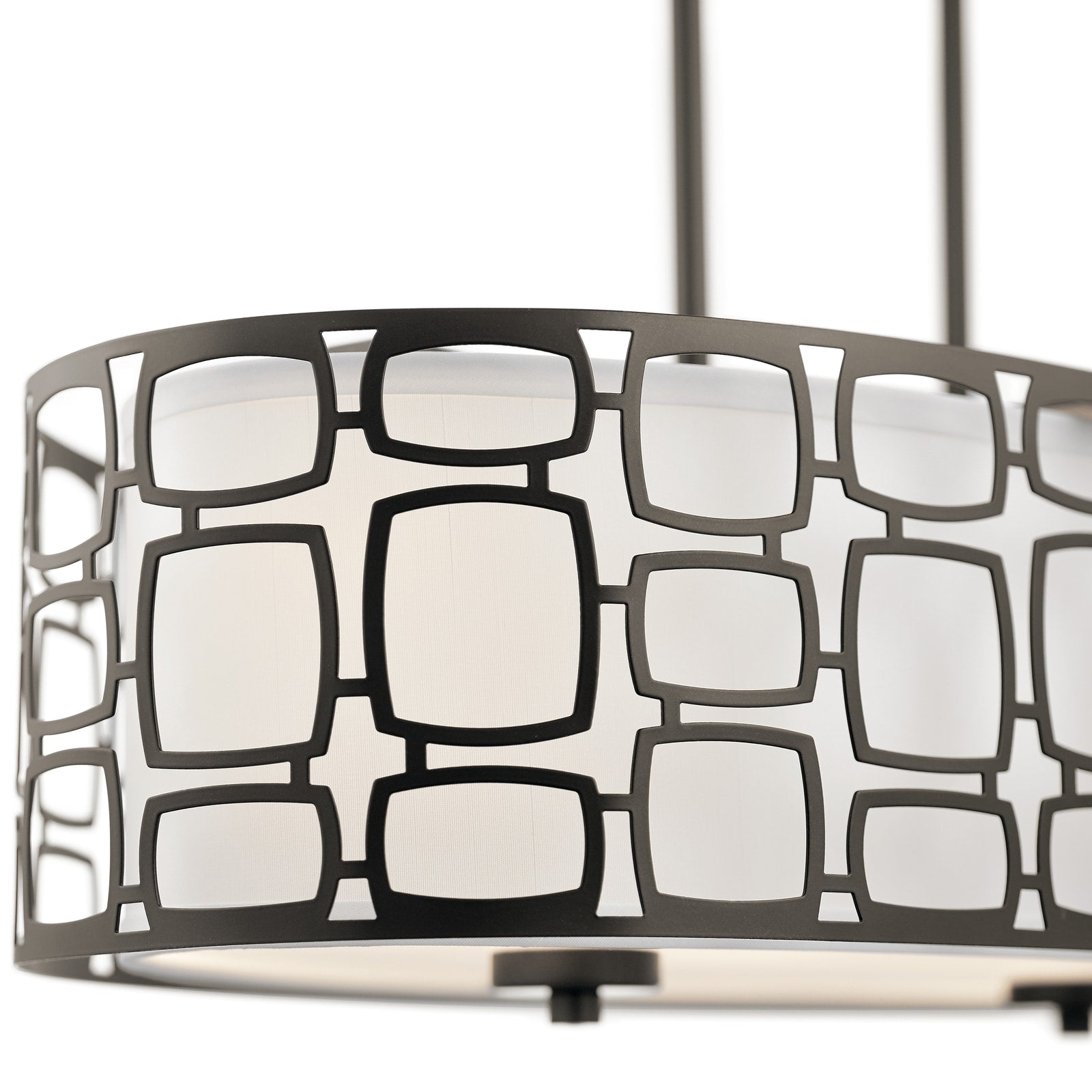 Elevate your interiors with the Kichler Sabine 4-Light Pendant Light, a stunning blend of geometric elegance and warm illumination. Featuring a sophisticated Olde Bronze finish, its etched glass drum and off-white fabric shade create a captivating ambiance fit for any modern or contemporary space.