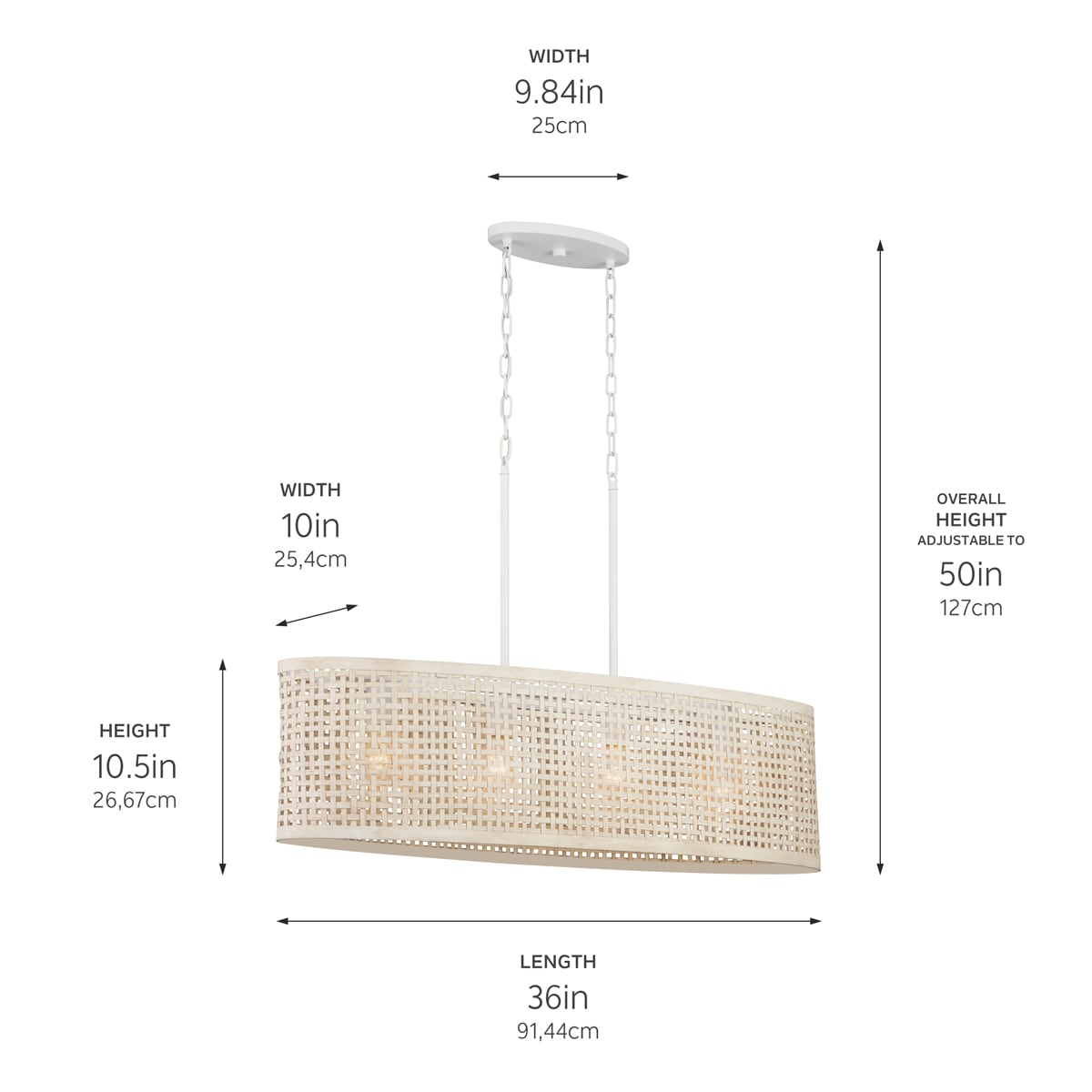 Illuminate your living space with the Kichler Sayulita 4-Light Coastal Chandelier, a stunning addition to any coastal-themed decor. With its white washed wicker shades and refined silhouette, this chandelier brings a warm, comfortable texture to dining rooms, kitchens, or living areas. Whether over an island or a long table, it adds a beautiful ambient glow to your home.