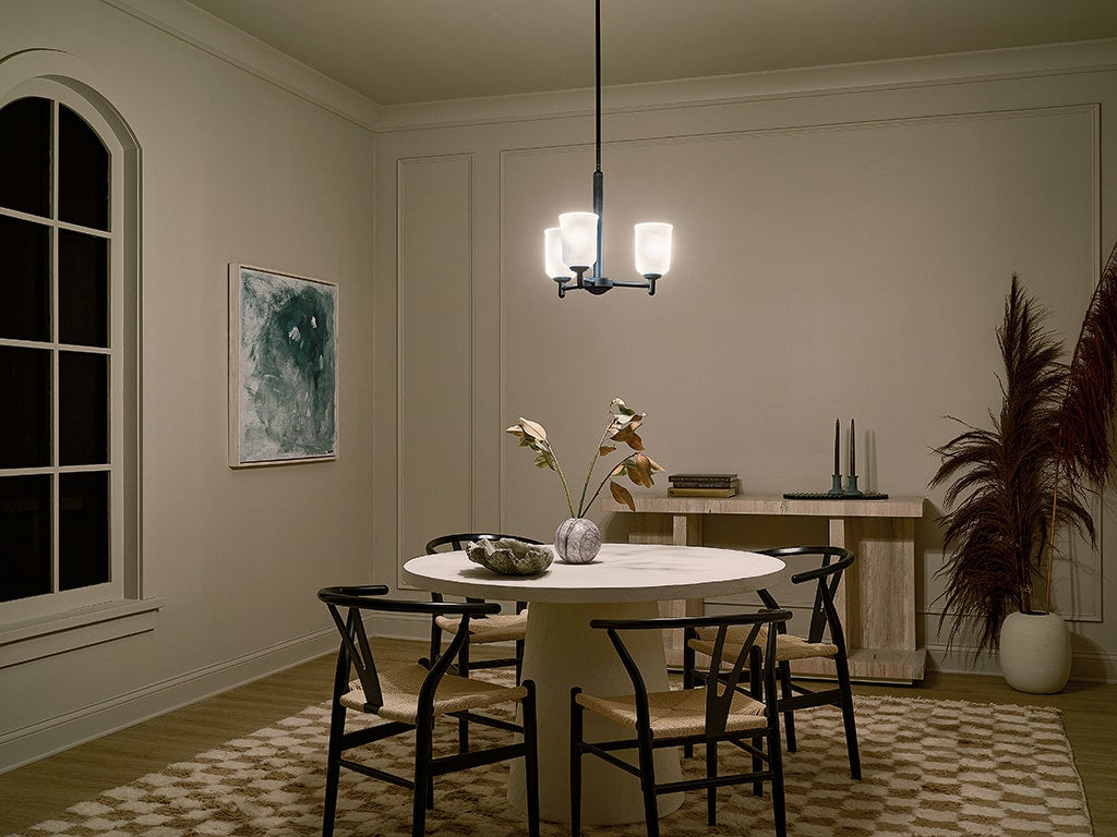 The Kichler Shailene 3-Light Black Transitional Chandelier combines clean lines and a sophisticated black finish to enhance any traditional or transitional space. Its etched satin glass shades provide ambient lighting, making it perfect for dining areas or living rooms. With adjustable hanging height and dimmable capabilities, this fixture offers both style and functionality.