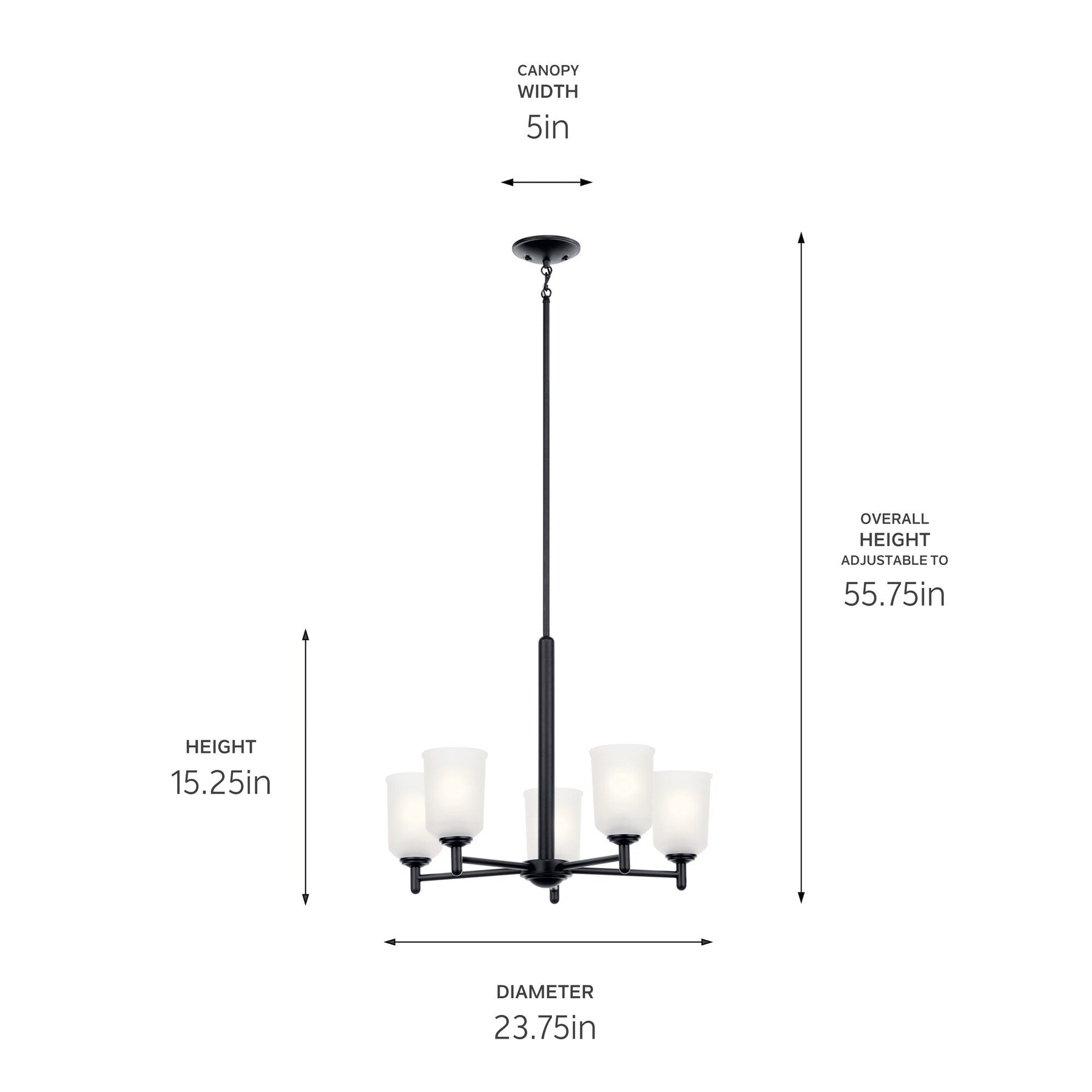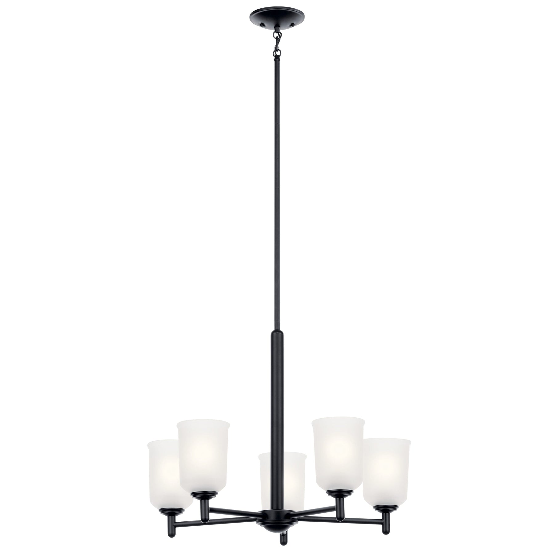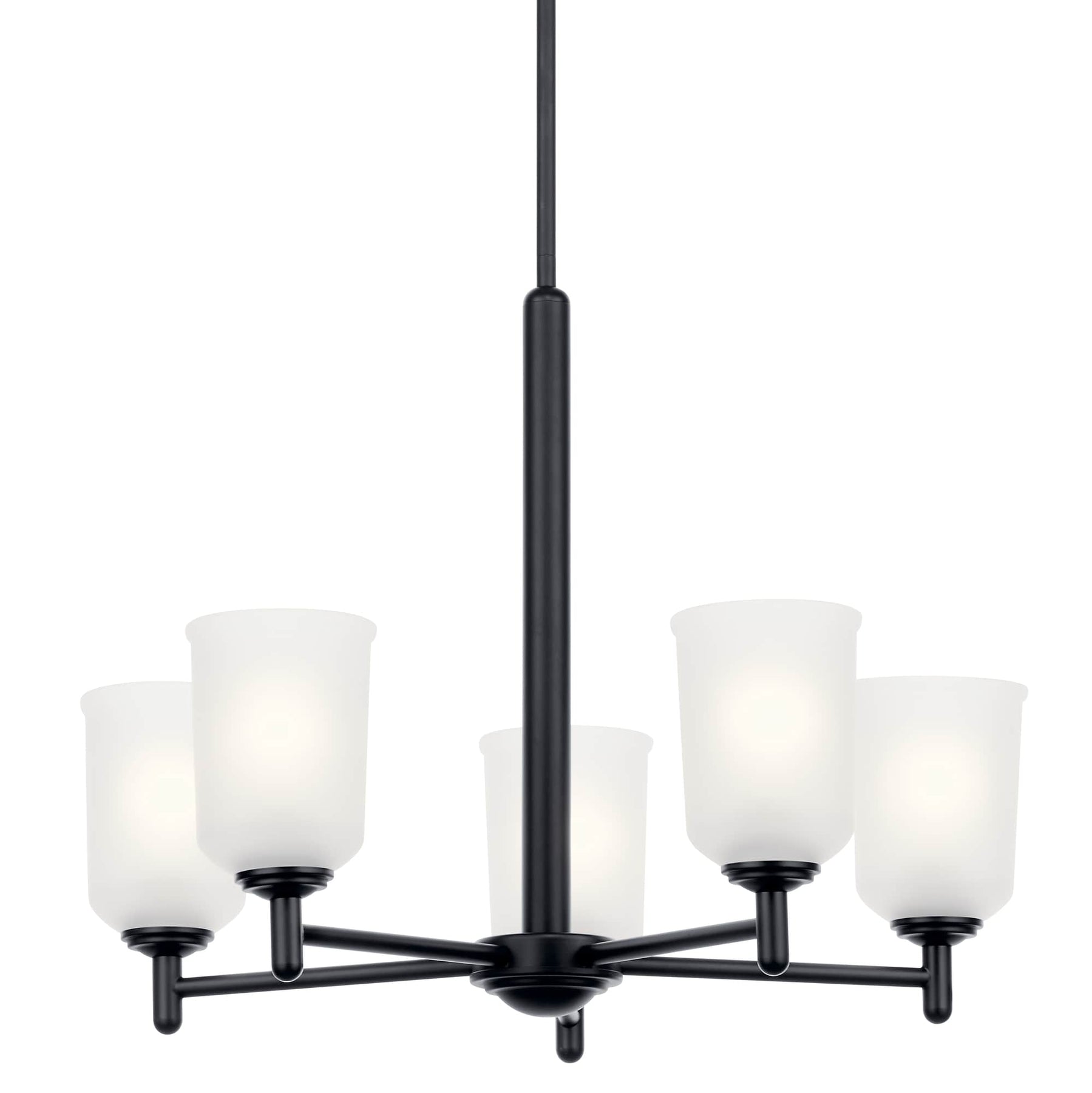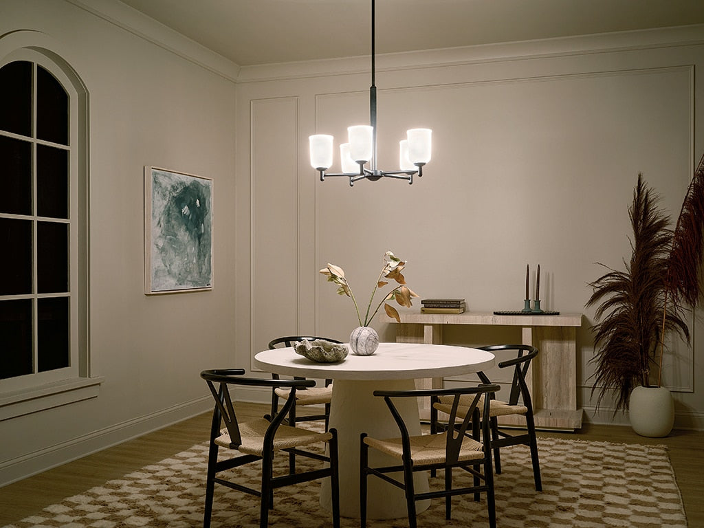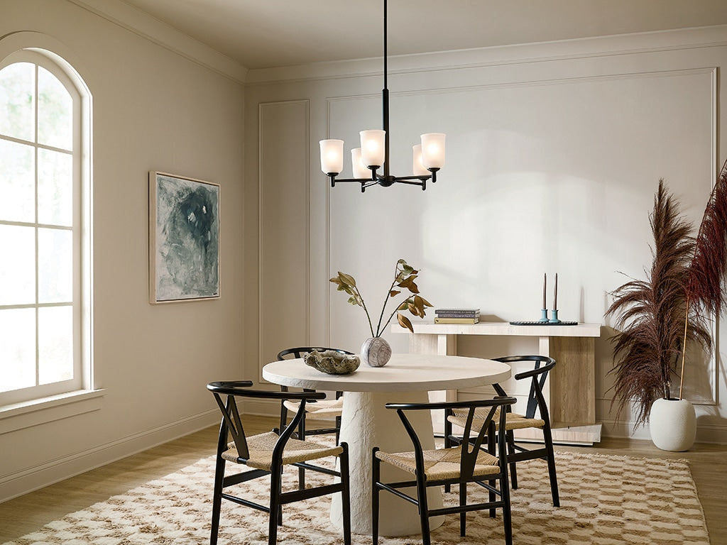 Illuminate your space with the Kichler Shailene 5-Light Chandelier, featuring a sleek black finish and satin etched glass. Perfect for transitional settings, this chandelier brings elegance and ambient lighting to dining areas, kitchens, or living rooms. Its versatile design is compatible with dimmable switches for customizable mood lighting.