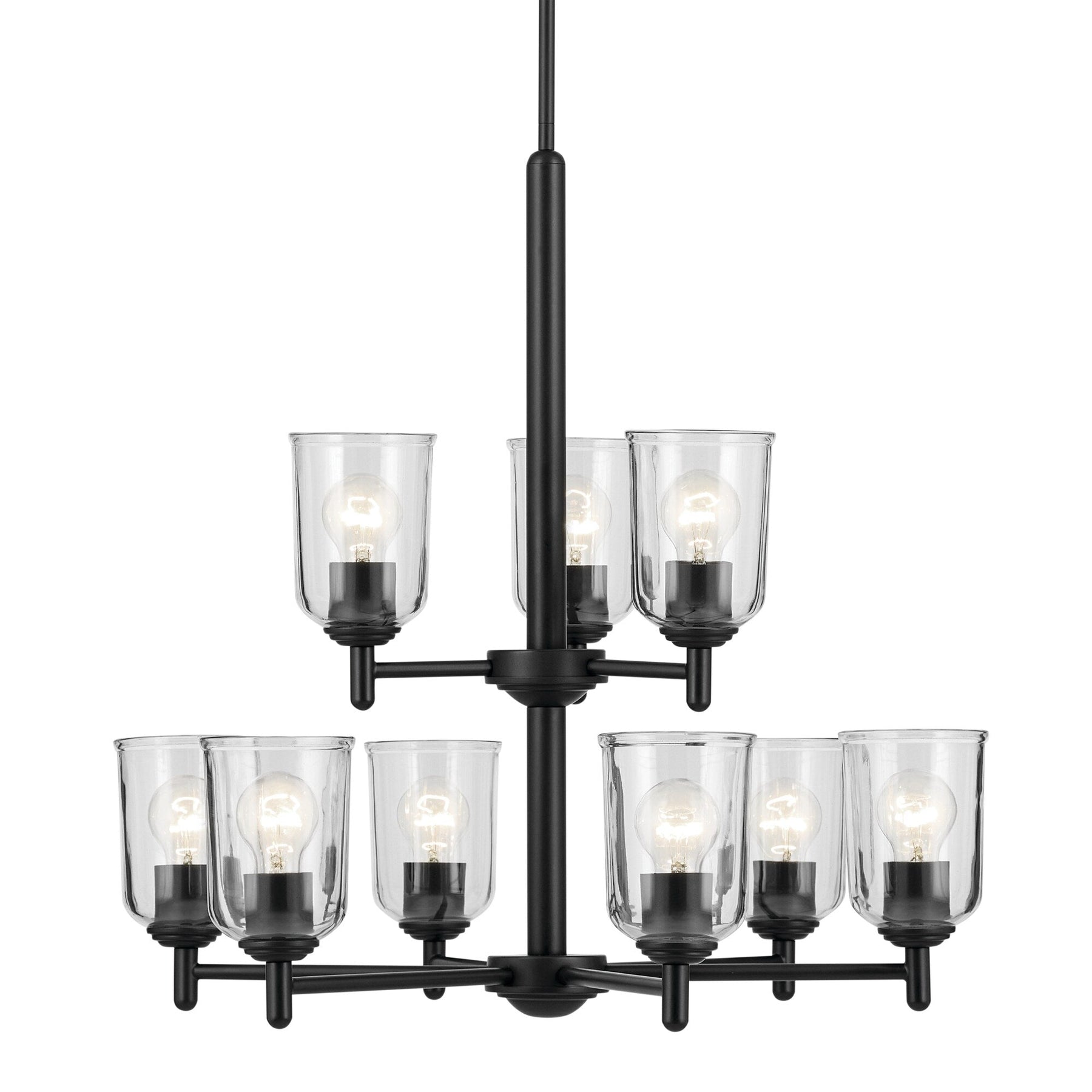 Illuminate your space with the timeless elegance of the Kichler Shailene 9-Light Black Chandelier. This traditional chandelier provides a captivating glow, featuring a durable steel frame with a sleek, black finish that complements any decor. The clear glass shades contribute to its sophisticated allure, making it a perfect addition to foyers or dining areas.