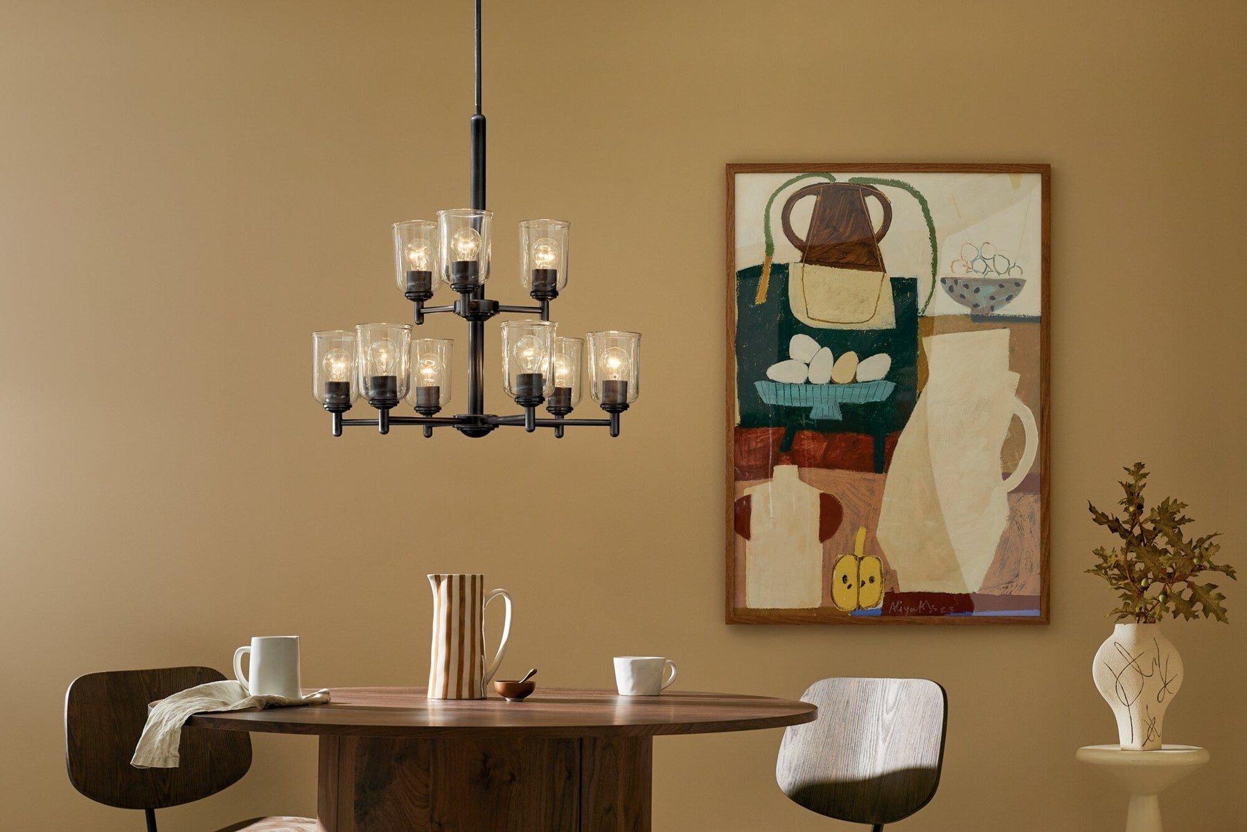 Envision the Kichler Shailene Chandelier gracing your grand foyer or dining area, casting a warm and inviting glow that welcomes all who enter. Its graceful tiered design, highlighted by clear glass shades, blends traditional and modern elements to create a look of understated elegance. Imagine styling it above a reclaimed wood dining table or within a minimalist entryway to serve as an artistic focal point. This chandelier not only illuminates but elevates your home, offering an ambiance of luxurious sophistication.