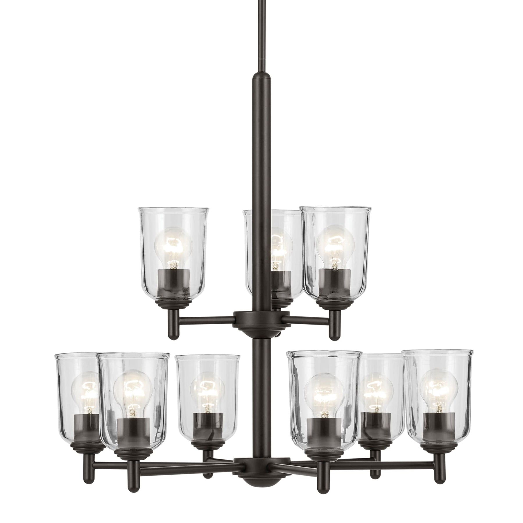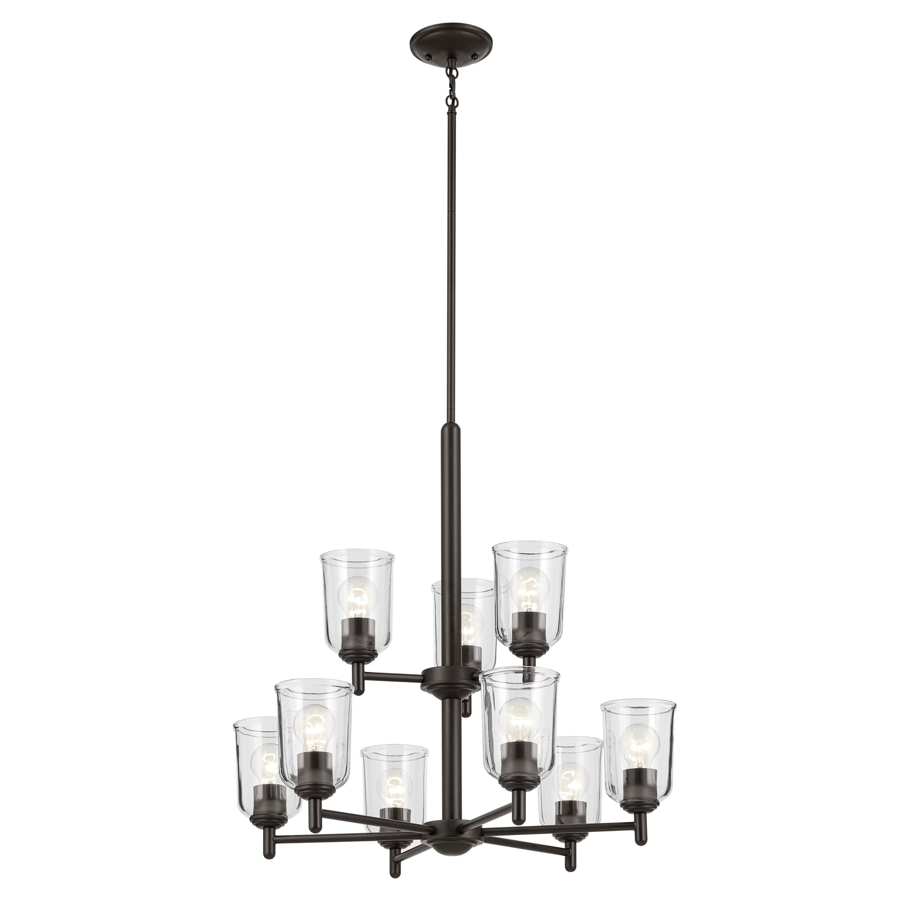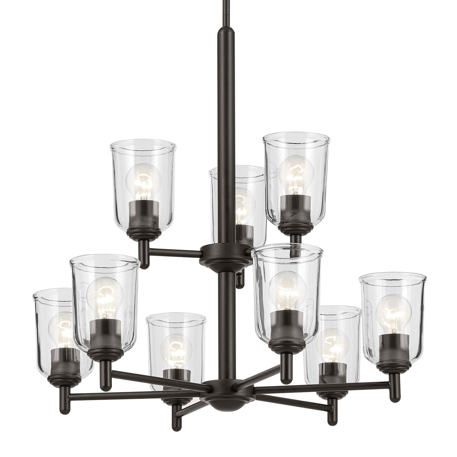 The Kichler Shailene 9-Light Bronze Traditional Chandelier is a captivating fixture with an antique bronze finish that complements any updated traditional environment. Its elegance is accentuated by clear removable glass shades, delivering ambient lighting for foyers, dining rooms, or living spaces.