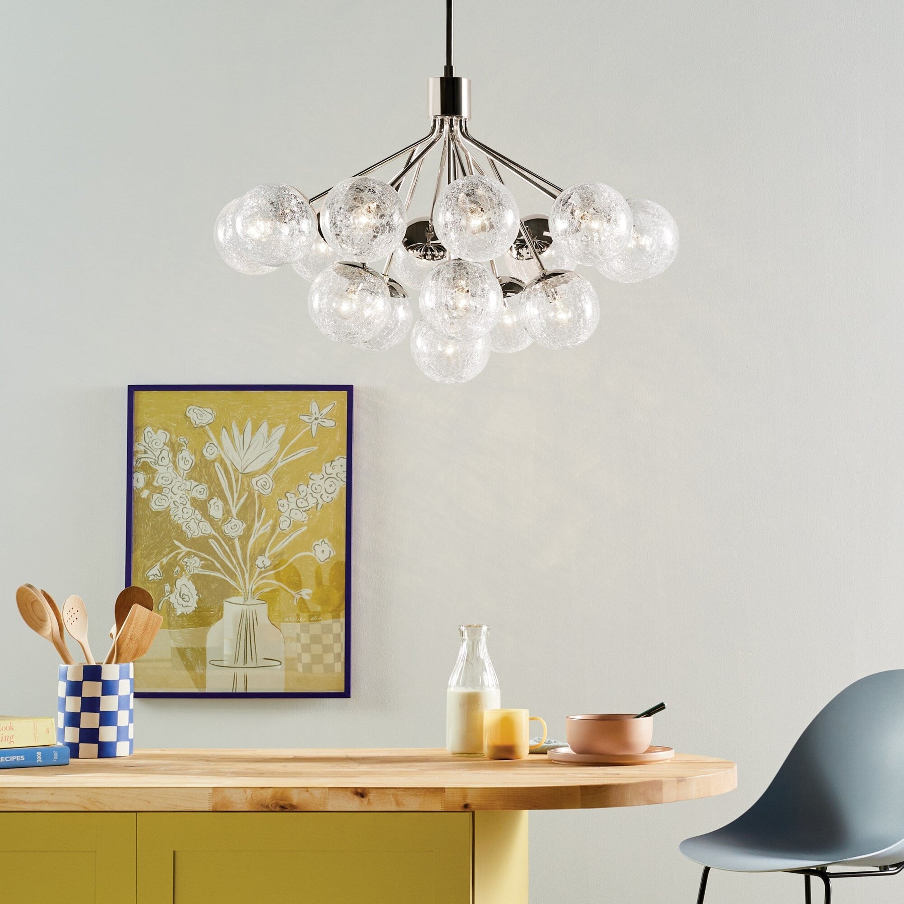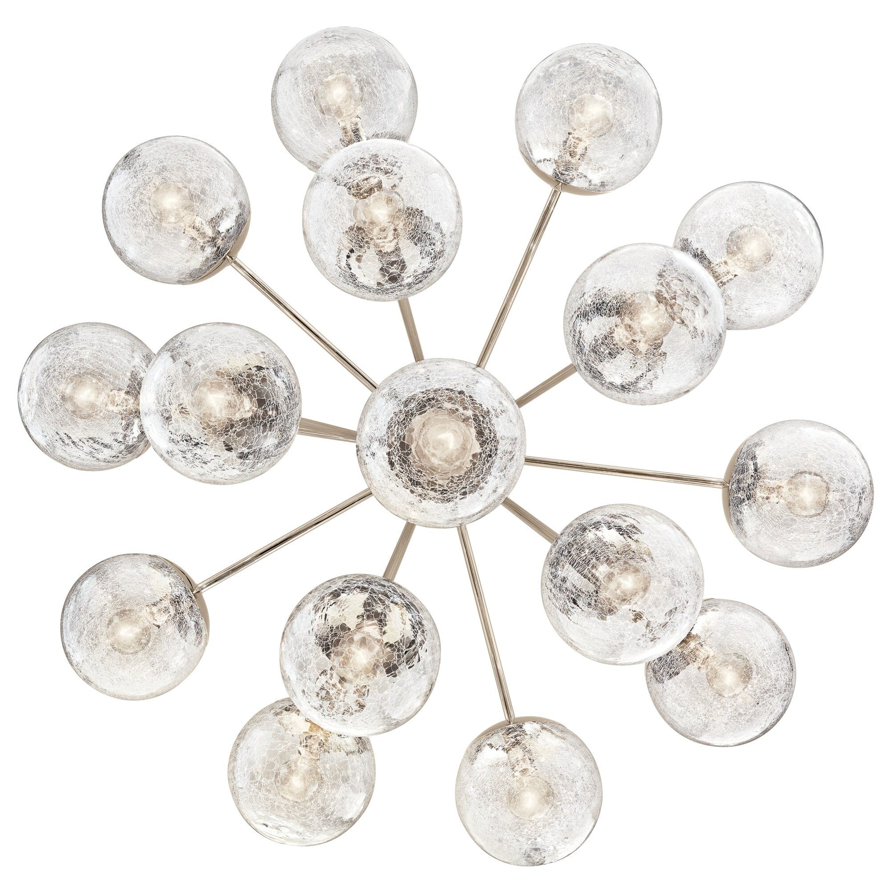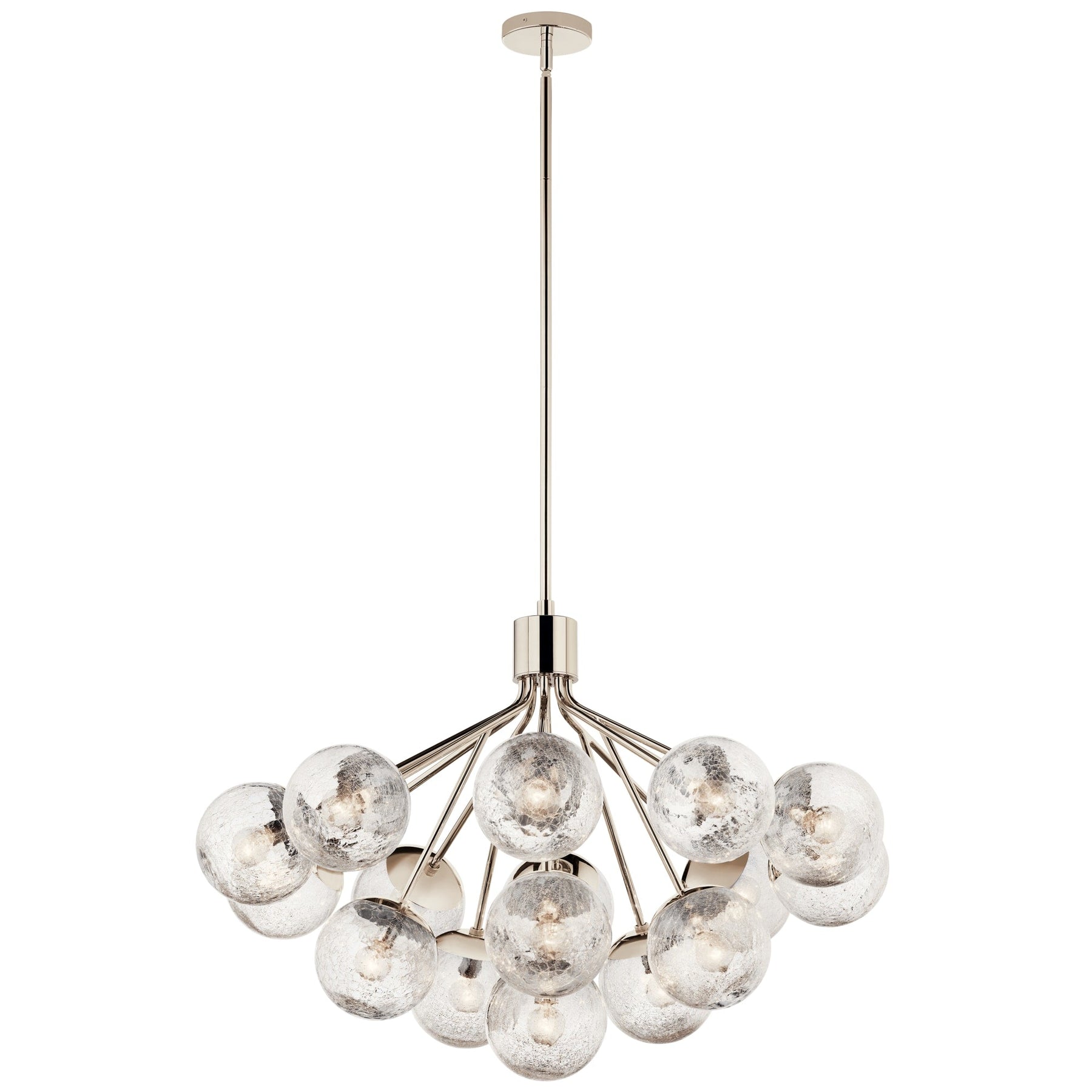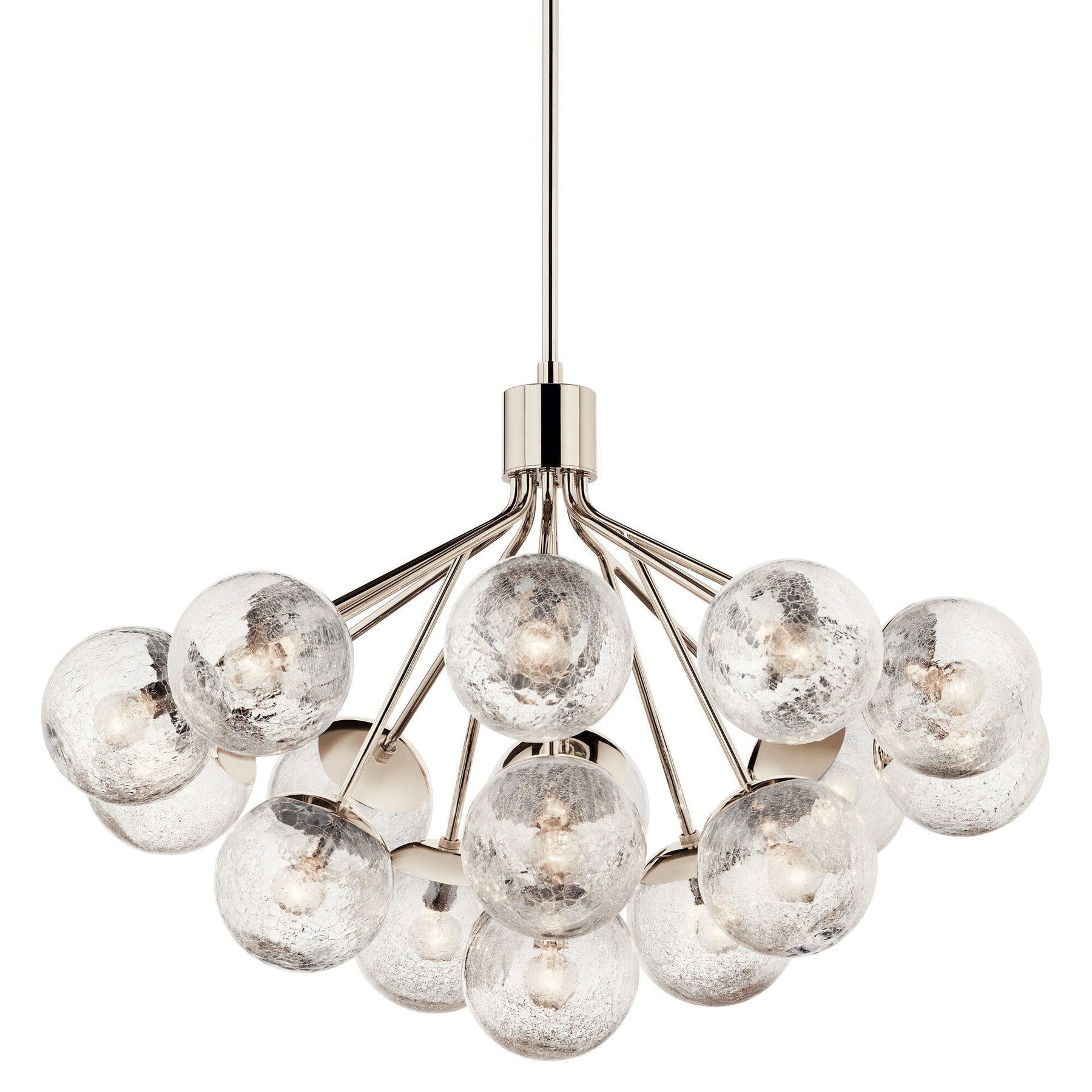 Illuminate your living space with the Kichler Silvarious Chandelier, a fusion of modernity and elegance. Its sputnik-inspired design, polished nickel finish, and crackle glass shades exude sophistication, making it a perfect centerpiece for dining rooms, living rooms, or foyers.