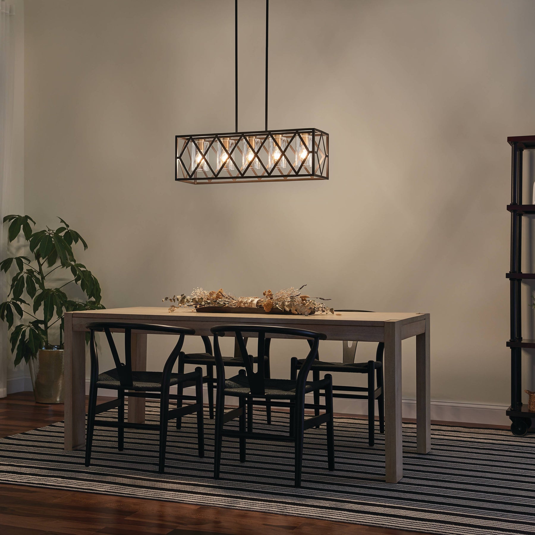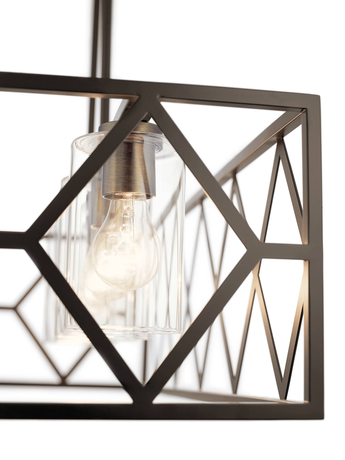 Illuminate your kitchen island with style using the Kichler Solander 5-Light Olde Bronze Linear Island Light. This fixture combines a transitional design with clear glass panels for bright, ambient lighting. Its olde bronze criss-cross metalwork offers a charming touch, perfect for various interior styles.