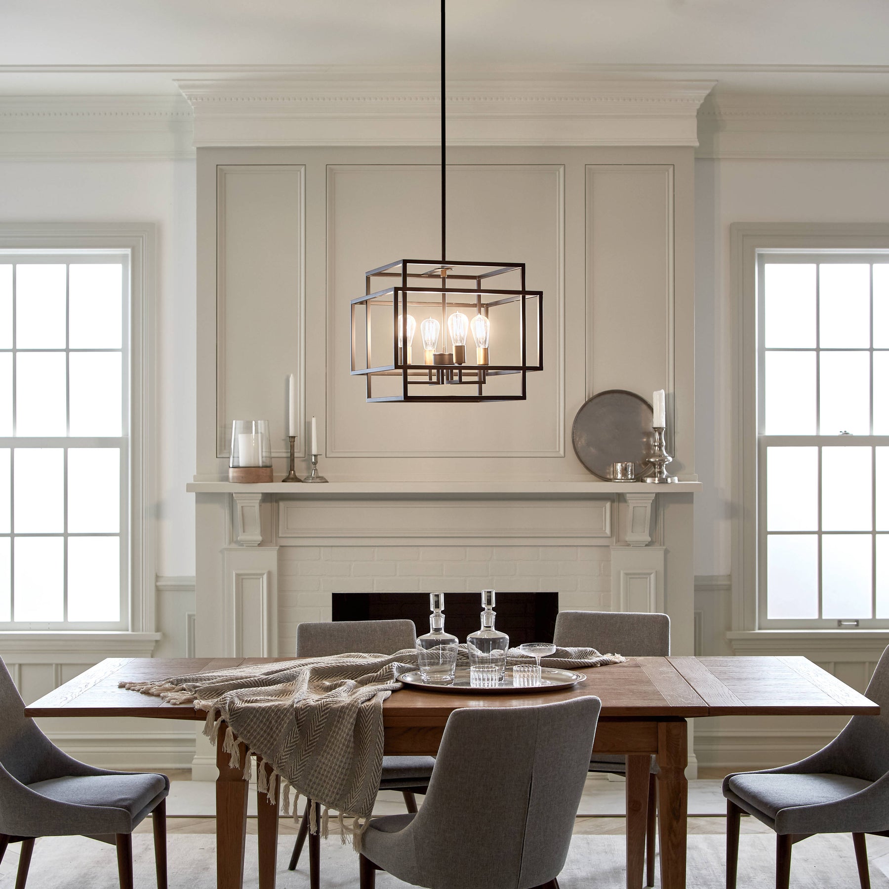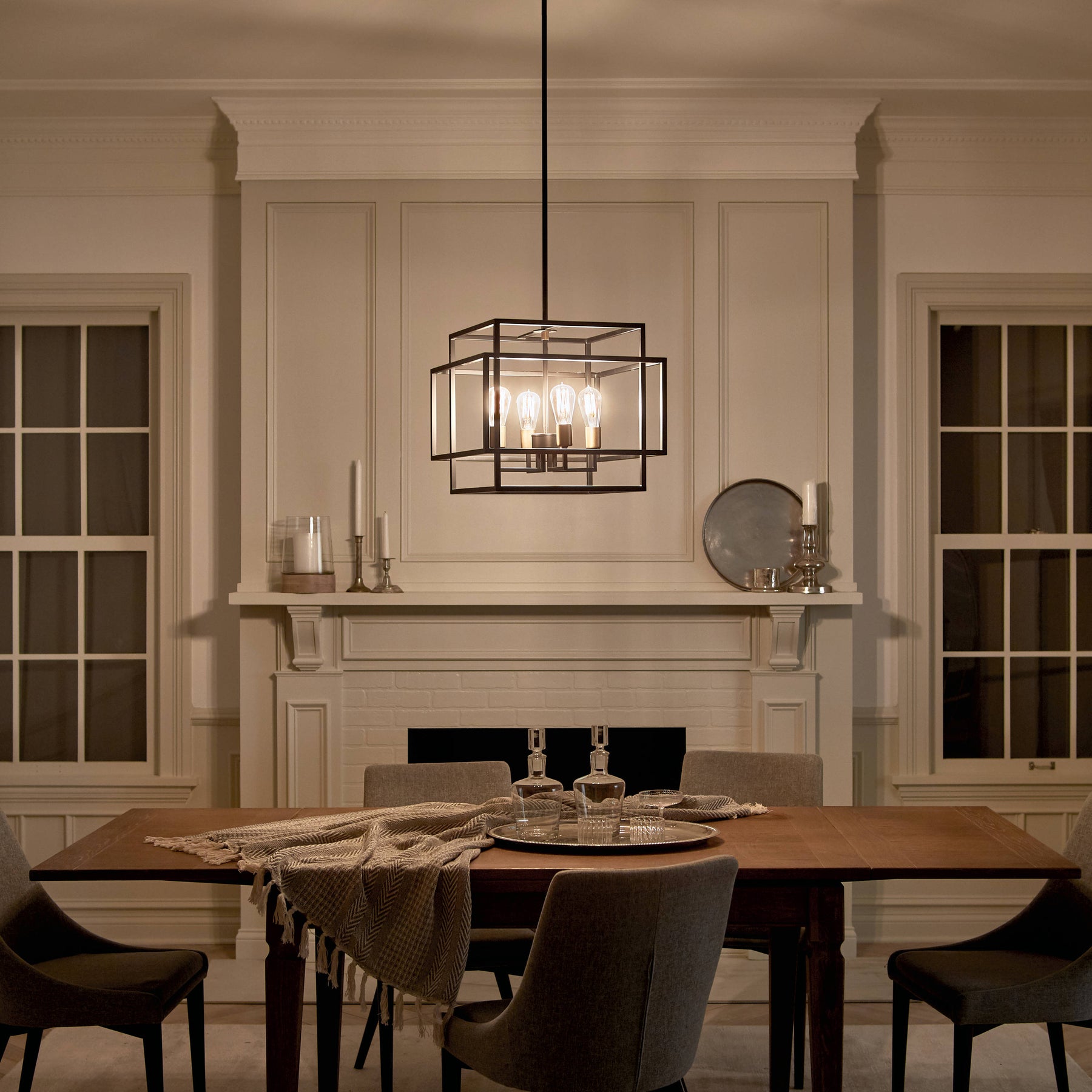 Illuminate your home with the striking Kichler Taubert 4-Light Pendant Light, featuring a geometric, mid-century design that blends industrial elegance with modern sensibility. Crafted from durable steel in a sleek black finish, this fixture transforms your dining room, living room, or entryway into a stylish retreat while providing ample ambient lighting.