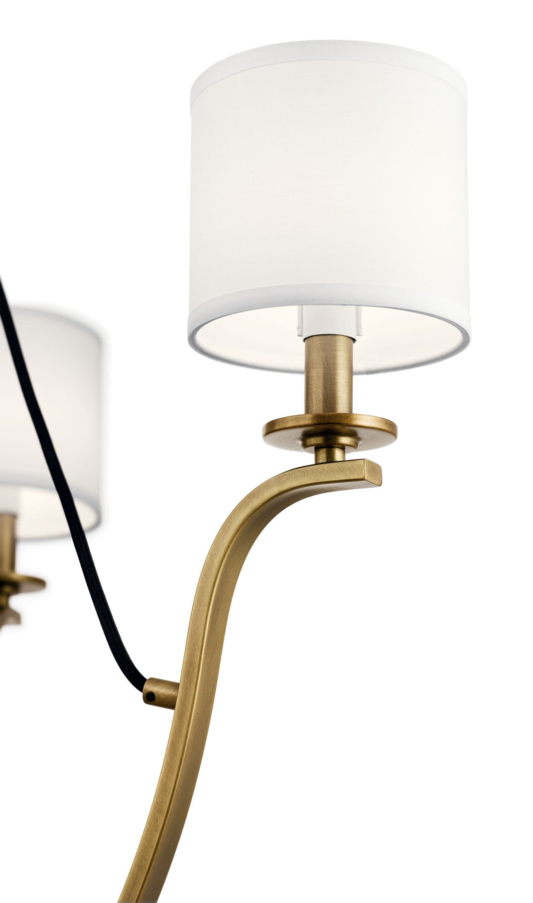 The Kichler Thisbe Chandelier is a masterful blend of classic and contemporary design, adding a layer of timeless elegance to any interior space. Its natural brass finish coupled with white linen shades cast a warm, inviting glow, perfect for creating ambiance in a dining room or living area. The standout fabric-covered rope detail adds a touch of artisan charm, making it more than just a light fixture but a statement piece. Break free from ordinary lighting and let this chandelier be the centerpiece of your luxurious living space.