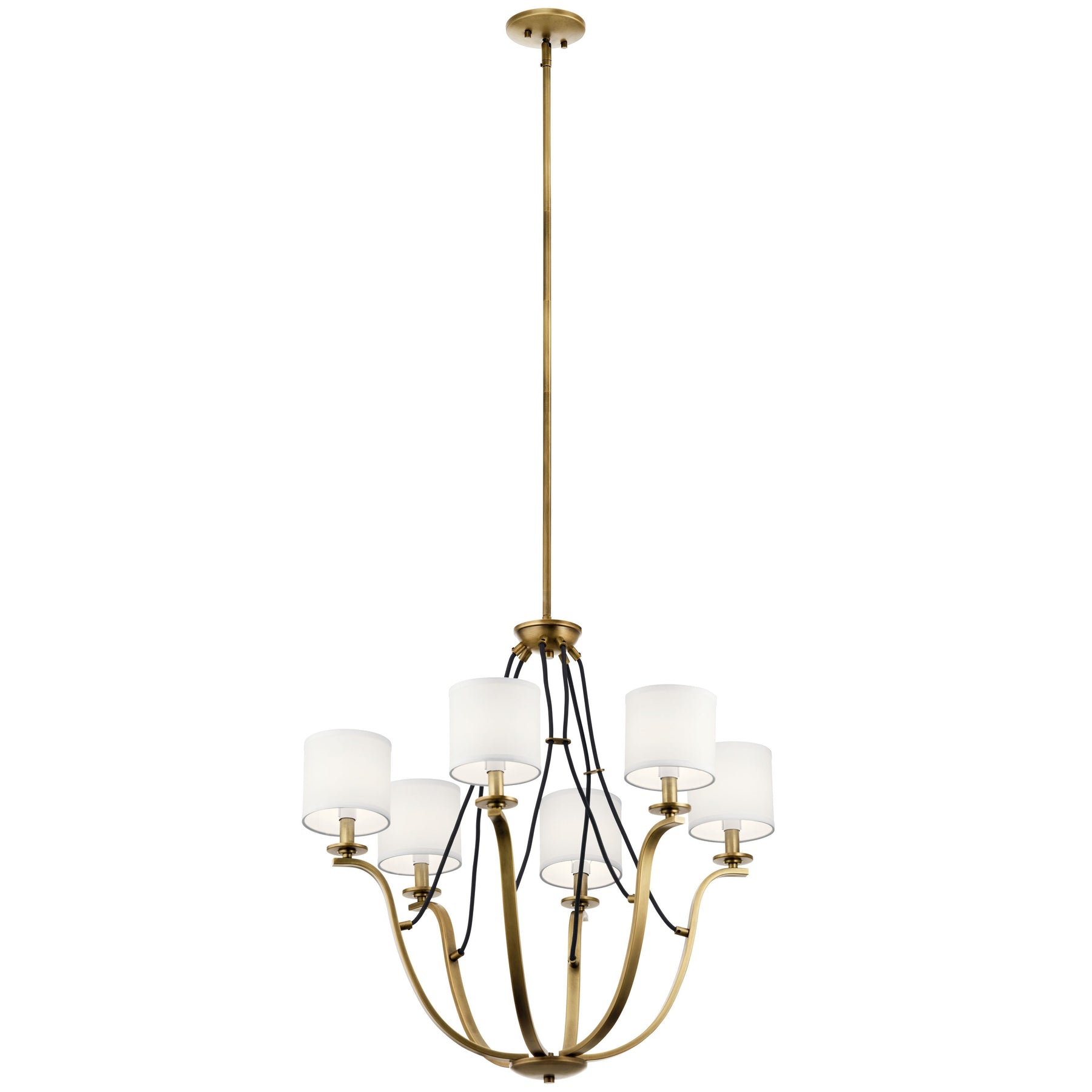 Elevate any room with the Kichler Thisbe 6-Light Traditional Chandelier, boasting elegant curves and a natural brass finish. This fixture blends timeless design with modern appeal, creating a warm and inviting glow for dining rooms and living spaces. Its fabric-covered rope detail and white linen shades add a touch of sophistication to traditional homes.