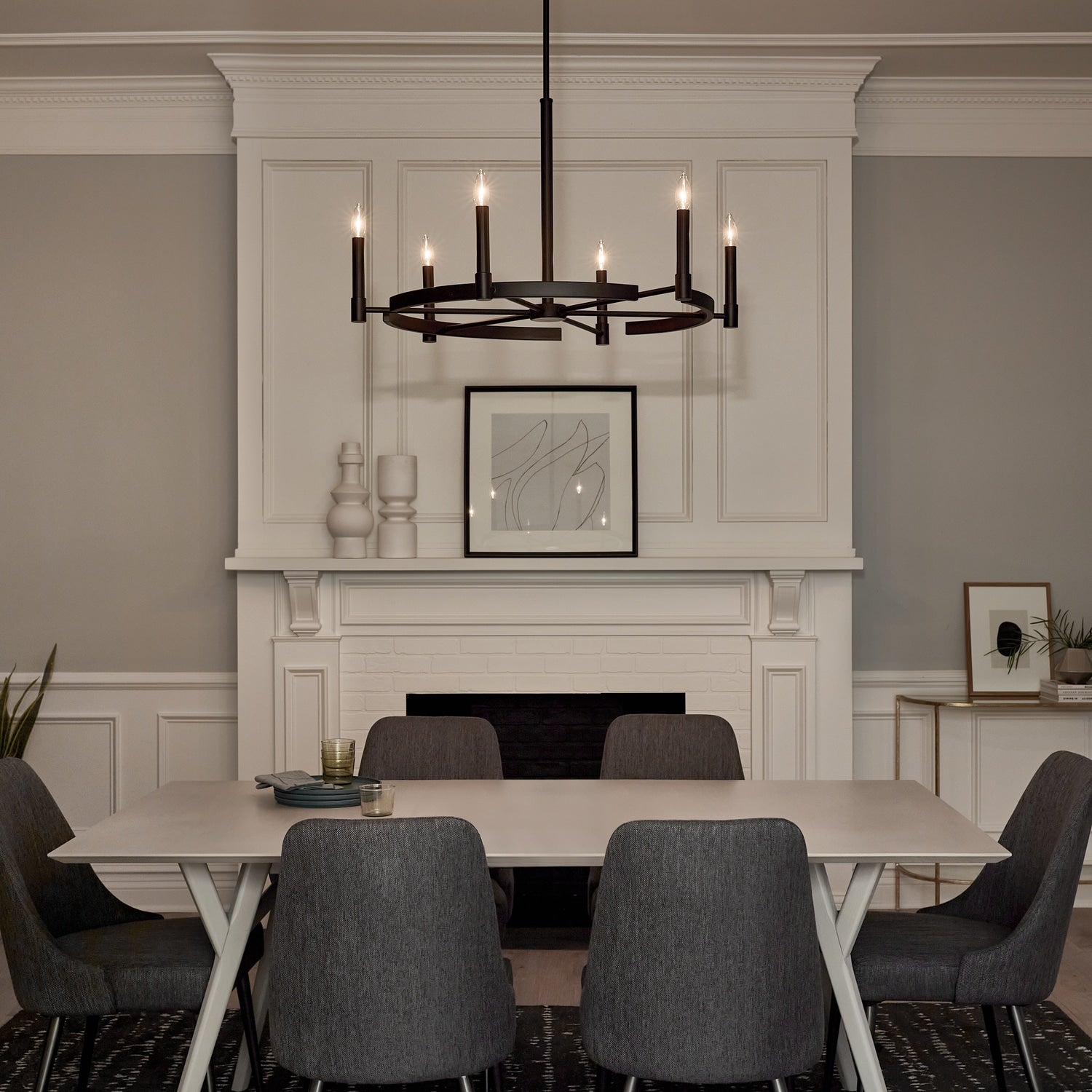 Elevate your interior design with the Kichler Tolani 6-Light Chandelier. This modern masterpiece combines a sleek black finish with elegant candelabra bases to create a sophisticated lighting solution that enhances any room. Perfect for adding a touch of glamour to your kitchen, dining room, or living room, this chandelier blends traditional and contemporary styles effortlessly.