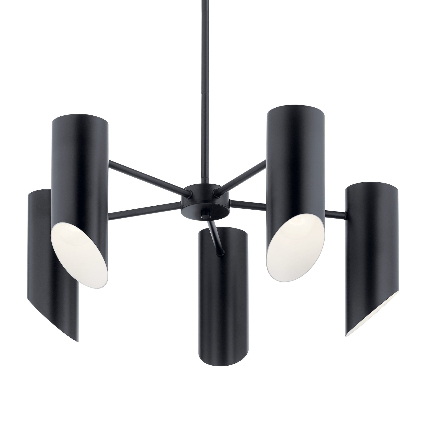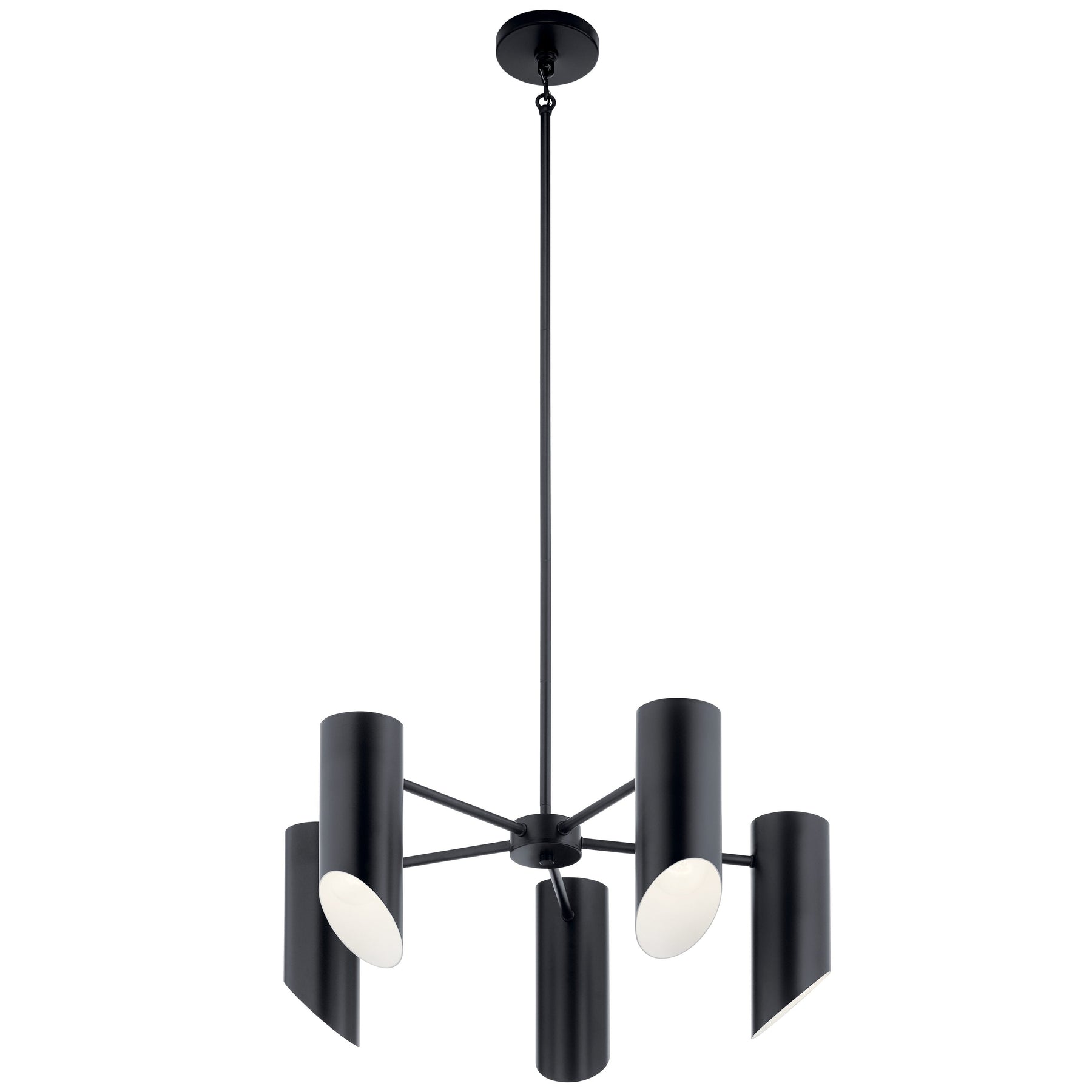 The Kichler Trentino 5-Light Chandelier embodies mid-century modern elegance, showcasing sleek steel construction and a bold black finish. Its five metal cylinders are designed to amplify light, casting a striking yet warm glow that's perfect for dining rooms and living spaces. Elevate your space with this stunning chandelier, a testament to refined taste and lasting style.