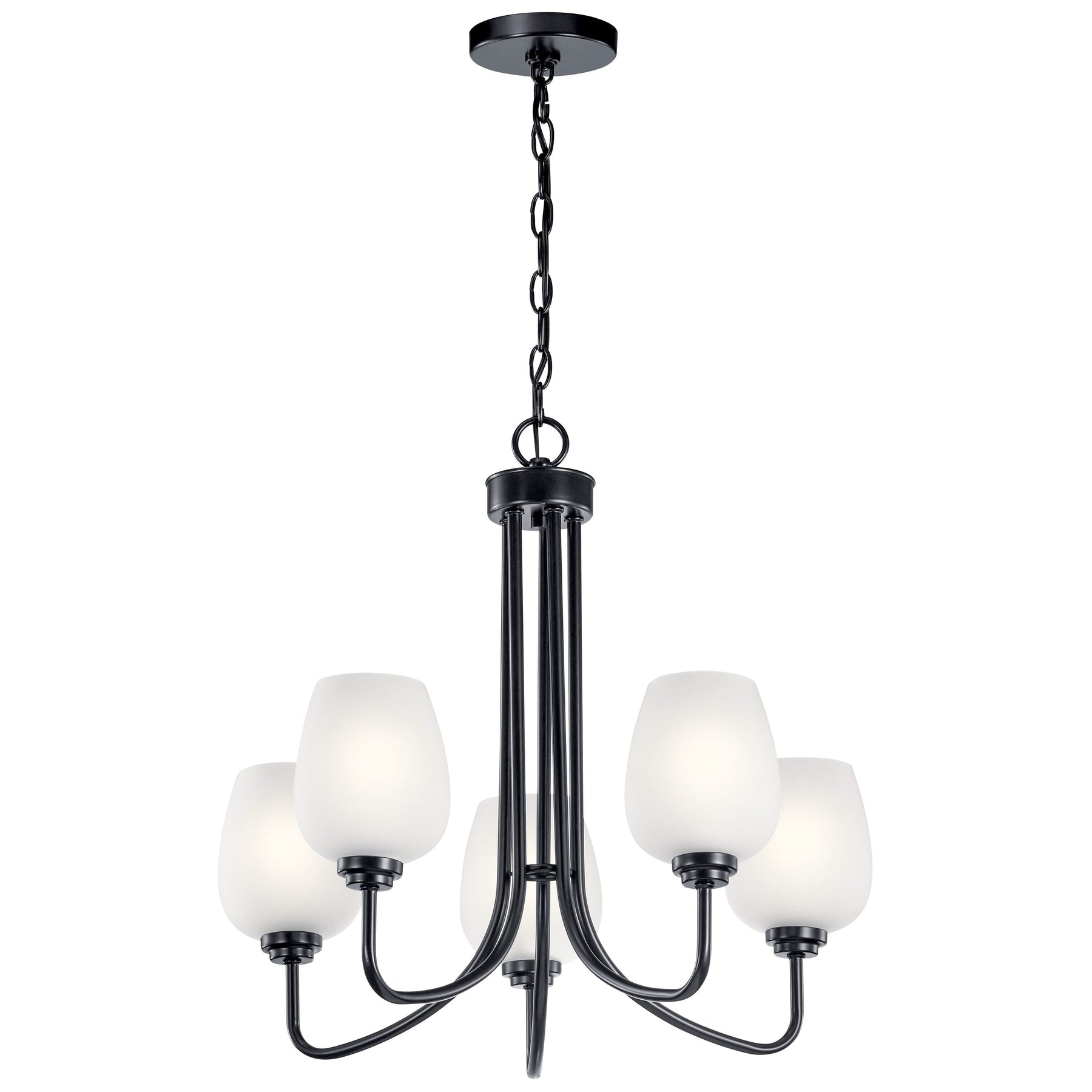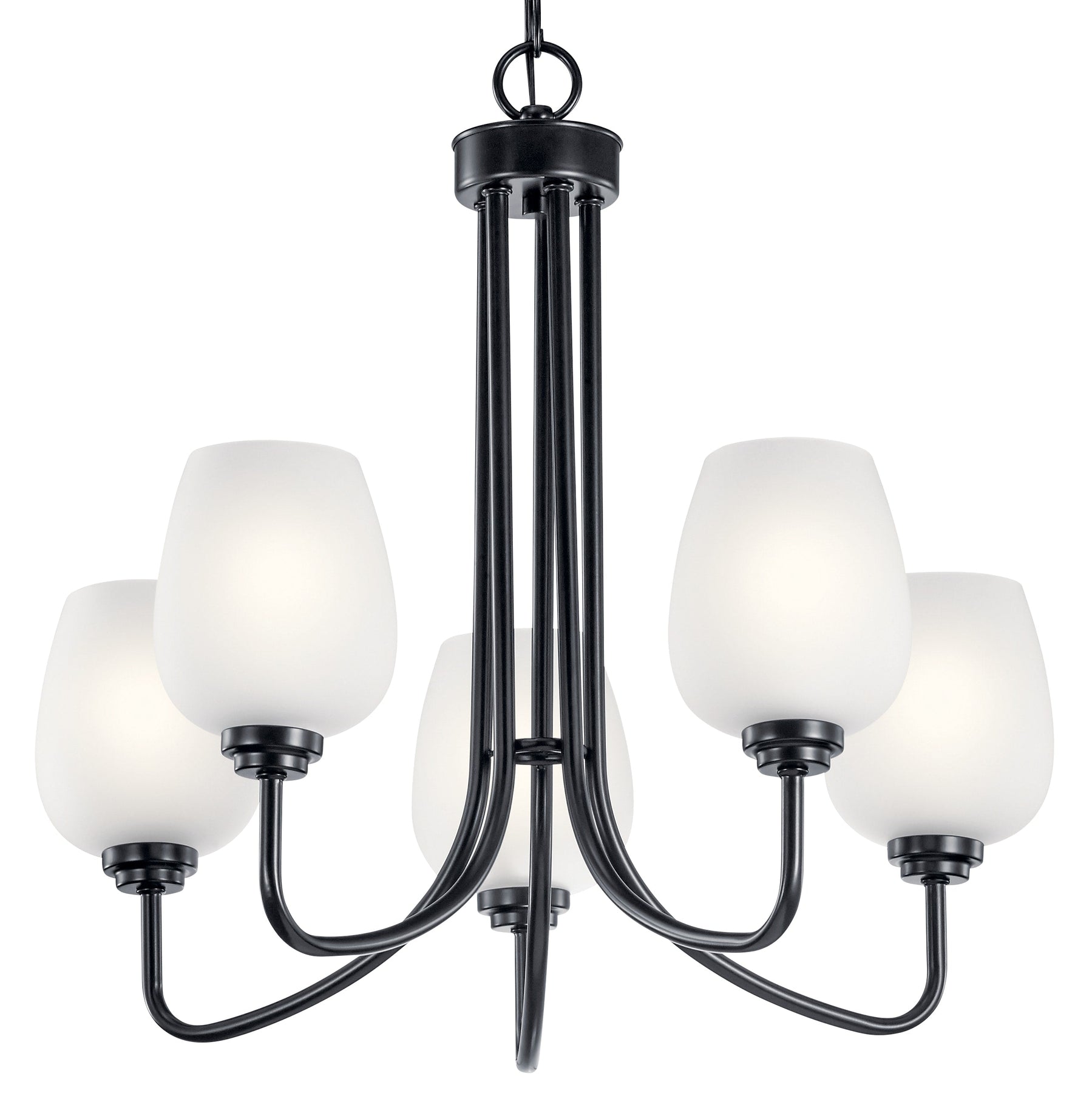Elevate your home's ambiance with the Kichler Valserrano 5-Light Black Traditional Chandelier. Crafted from durable steel and adorned with satin-etched glass shades, this chandelier offers a timeless elegance that enhances dining rooms, kitchens, and living spaces.