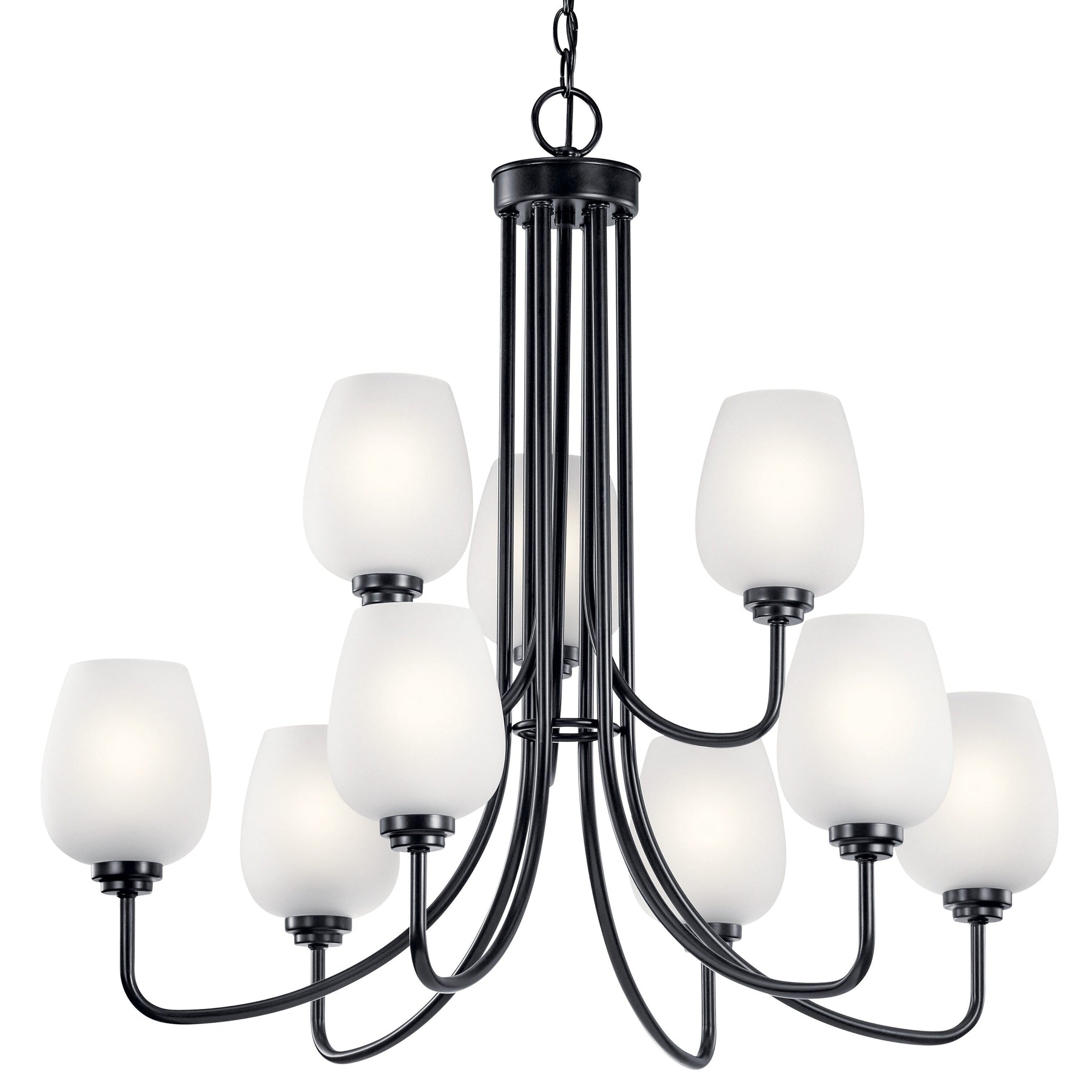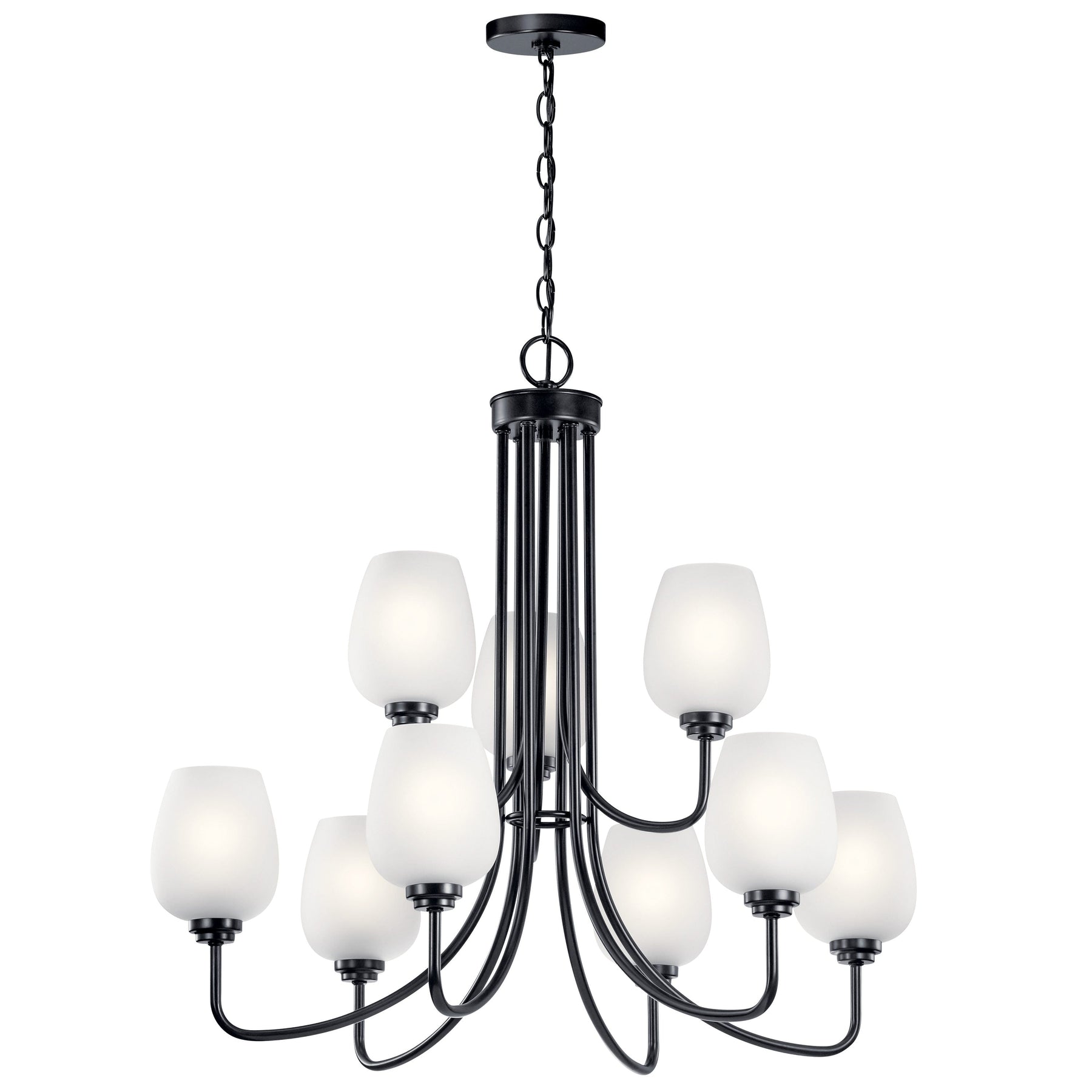 Elevate your space with the Kichler Valserrano 9-Light Black Traditional Chandelier, a stunning centerpiece that combines classic design with modern functionality. With its elegant steel construction and satin-etched glass shades, this tiered chandelier provides warm, inviting illumination ideal for dining rooms, foyers, and living areas.