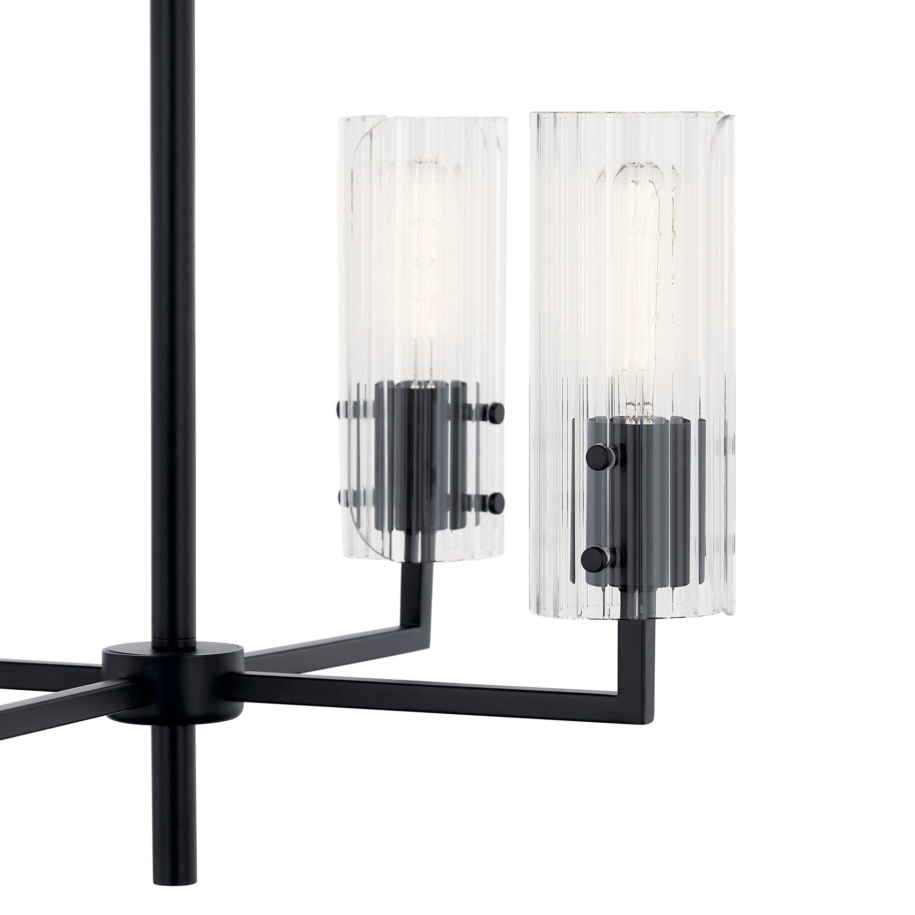 The Velestino 4-Light Chandelier acts as a stunning centerpoint in any room with its sleek design and flowing glass textures. Its clear, fluted shades create a dance of light and shadow, bringing dynamic movement to flat surfaces. Picture this piece hovering above a plush velvet dining set, casting an inviting, modern glow across a room. It’s more than lighting; it’s an artful expression of style and an essential touch of elegance for luxurious interiors.