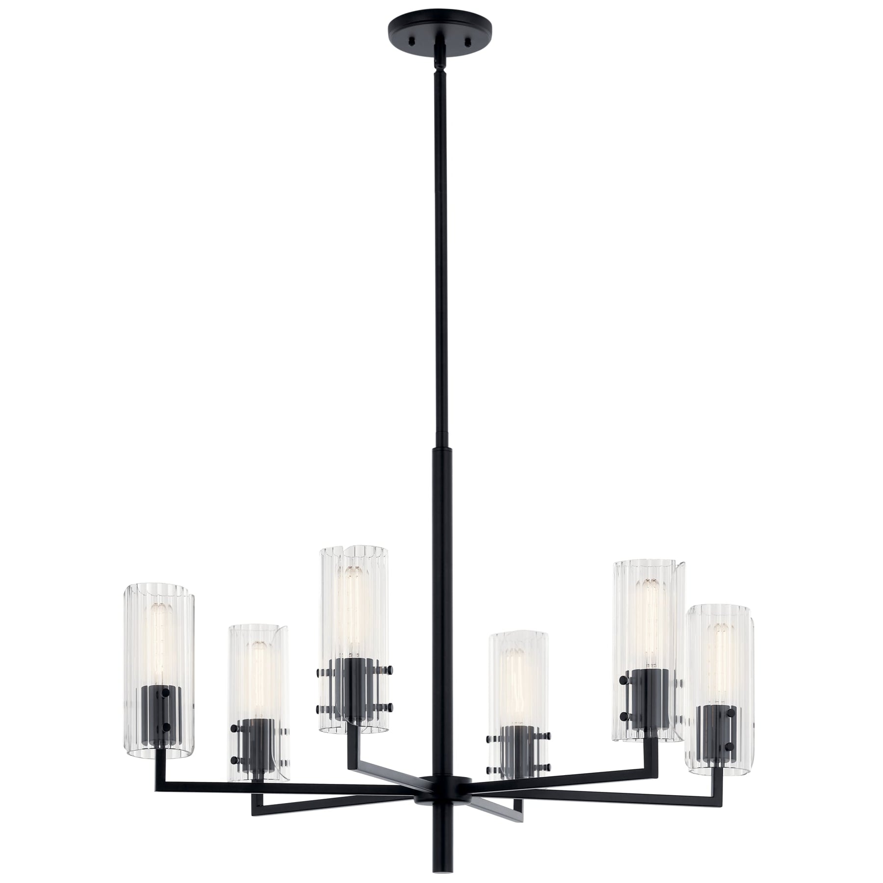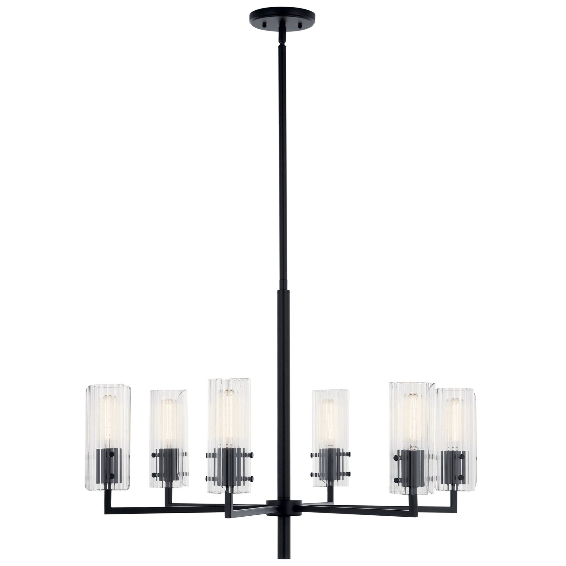 Illuminate your space with the Kichler Velestino 6-Light Black Chandelier. Designed with a durable steel frame and sleek black finish, this modern chandelier provides both aesthetic appeal and robust functionality. Its unique fluted glass shades diffuse light beautifully, making it an exquisite addition to any contemporary home.