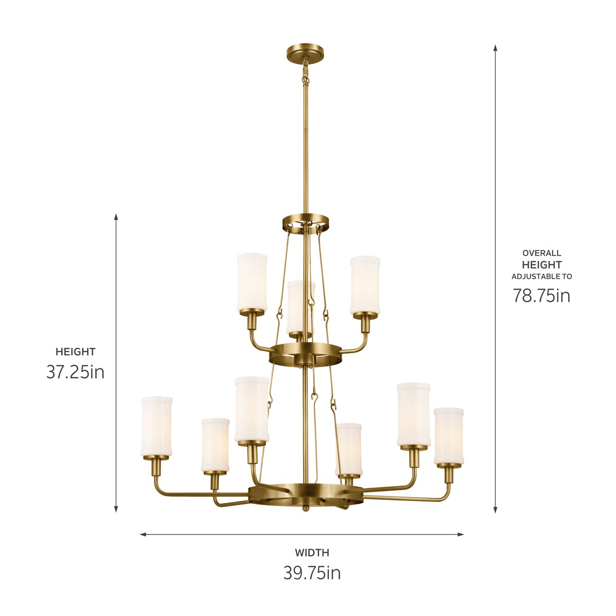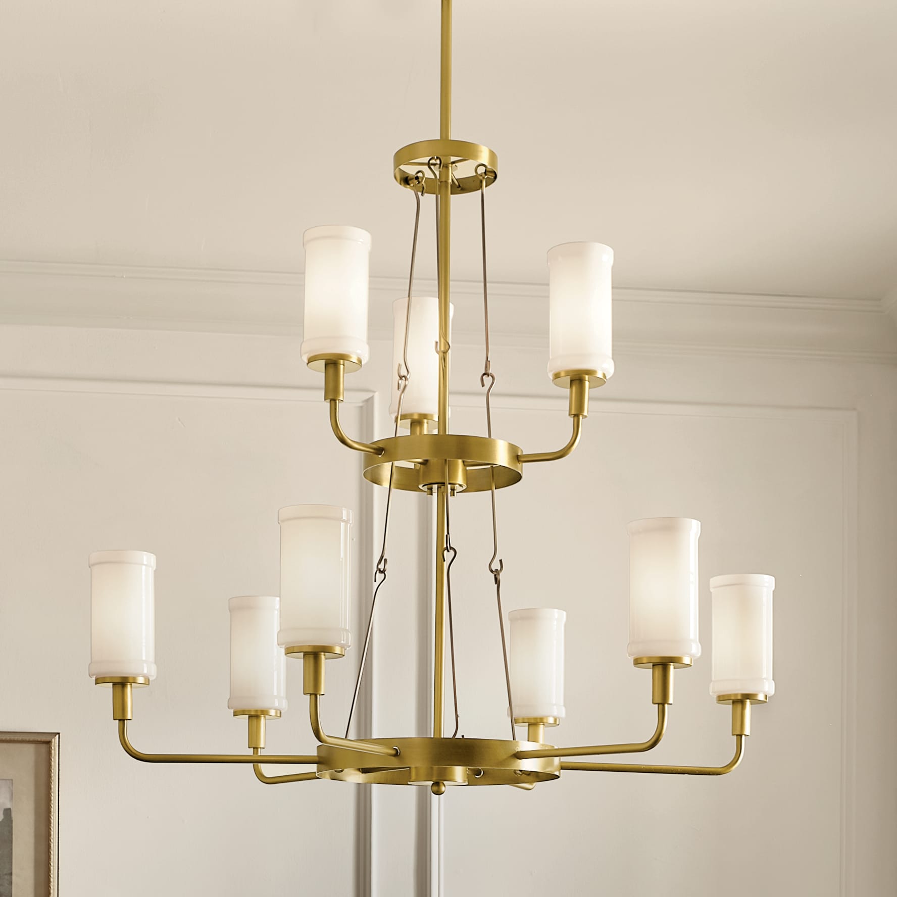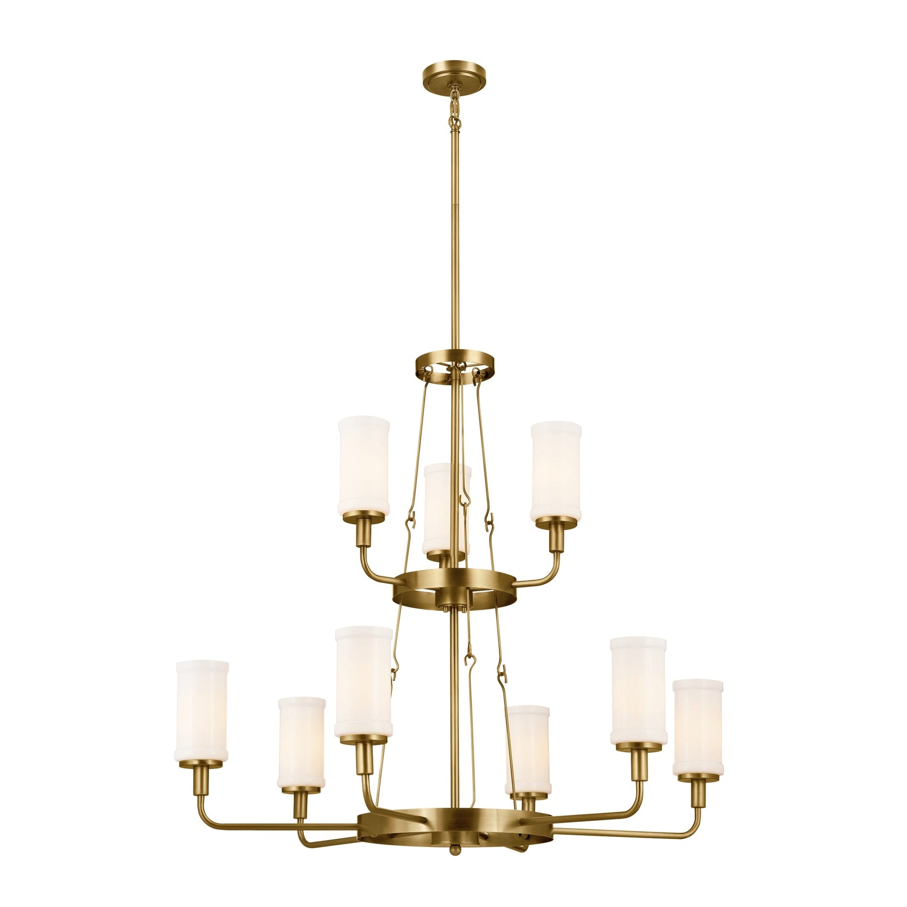 Illuminate your home with the vintage charm of the Kichler Vetivene 9-Light Chandelier. This elegant piece features a rich Natural Brass finish that resembles the warm patina of antique brass, complemented by optional Opal Glass shades for a nostalgic touch. Perfect for foyers or dining rooms, its adjustable height and ambient lighting create a welcoming atmosphere in any space.