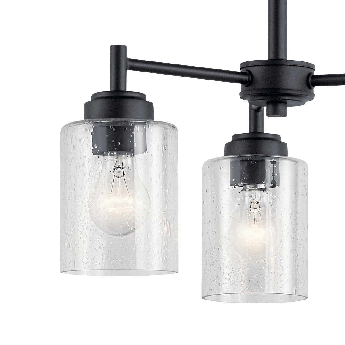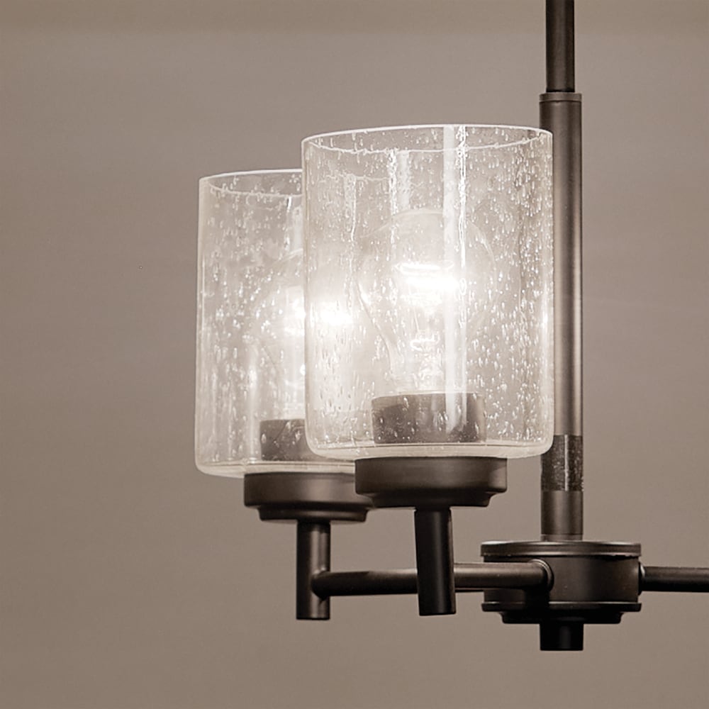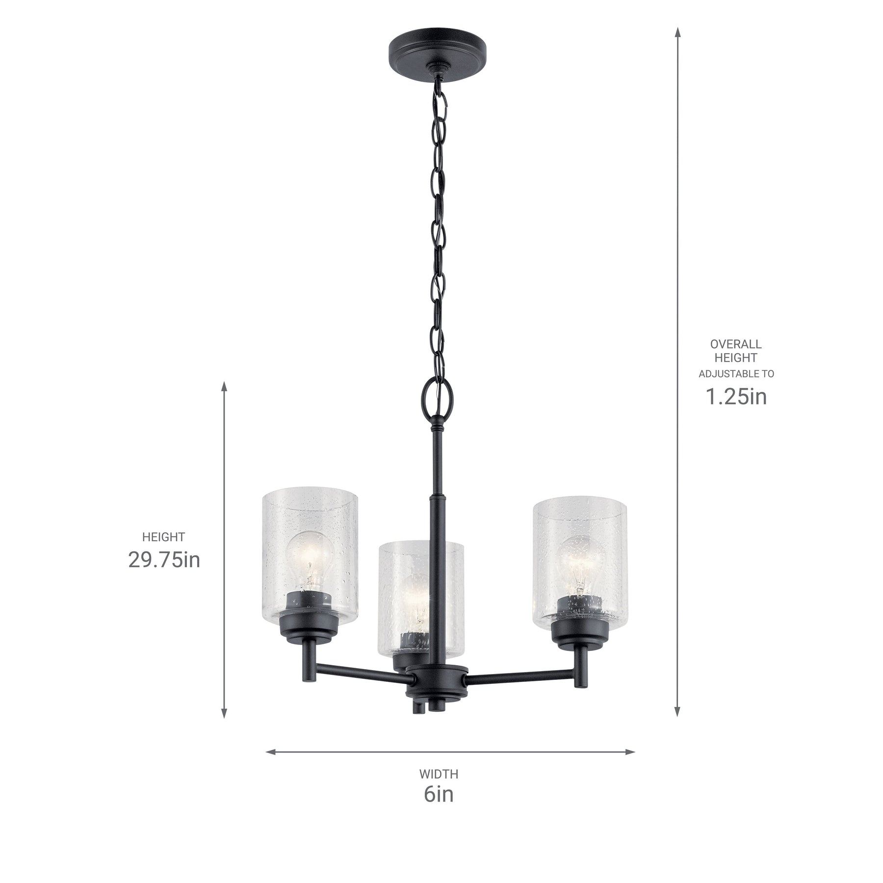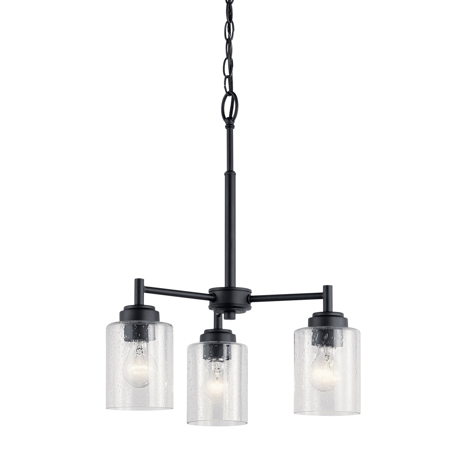 Illuminate your space with modern elegance using the Kichler Winslow 3-Light Black Chandelier. Featuring clear seeded glass shades and sleek black linear arms, this chandelier brings a contemporary flair to any room. Perfect for dining areas or kitchens, its adjustable hanging height ensures a custom fit for your home.