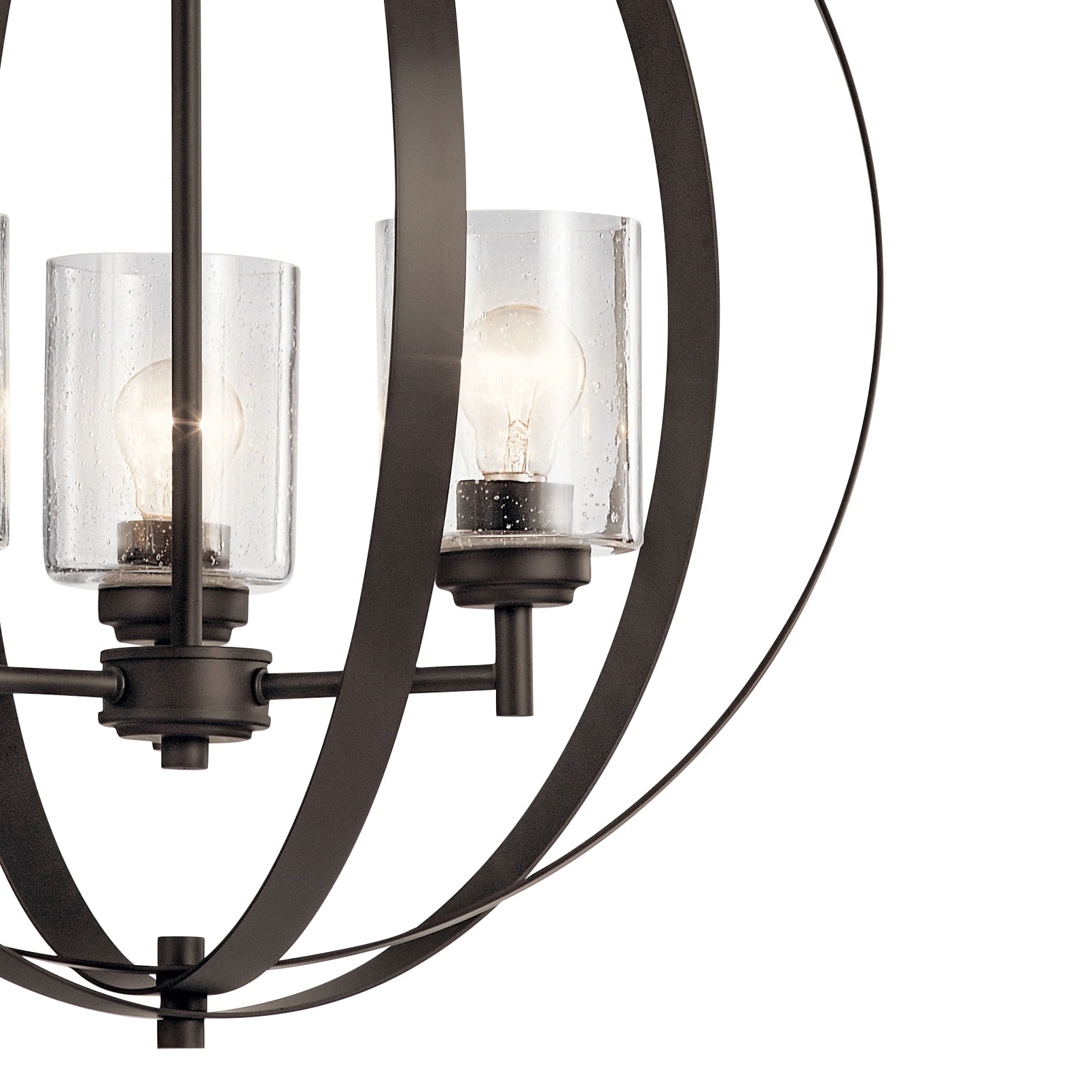 Elevate your space with the Kichler Winslow Chandelier, featuring a stylish bronze cage design and clear seeded glass shades that add a touch of modern elegance. Perfect for kitchens, dining rooms, or bars, this chandelier accommodates three medium E26 bulbs, making it a versatile choice for a range of interiors.