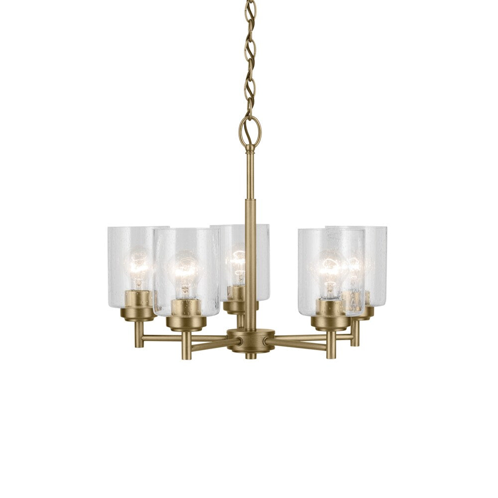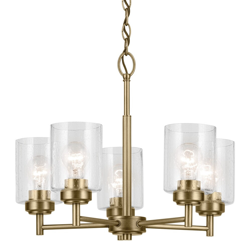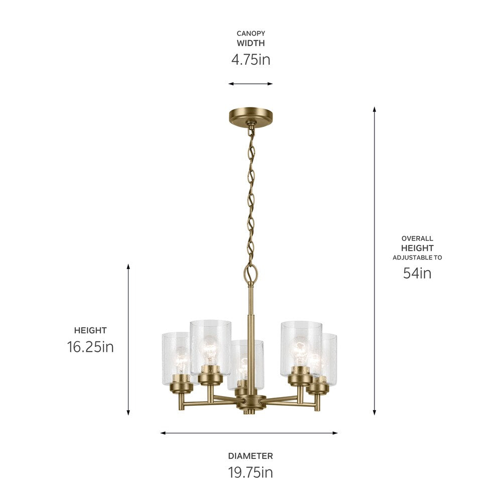 Elevate your interior with the Winslow 5-Light Industrial Gold Chandelier by Kichler, a perfect blend of vintage charm and modern functionality. Crafted from durable steel and featuring a warm brushed natural brass finish, this chandelier is designed to be a sophisticated focal point in any kitchen or dining area. The clear seeded glass enhances the fixture's soft glow, making it an exquisite choice for creating an inviting ambiance.
