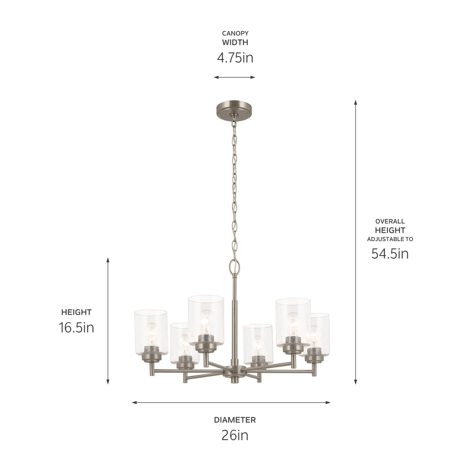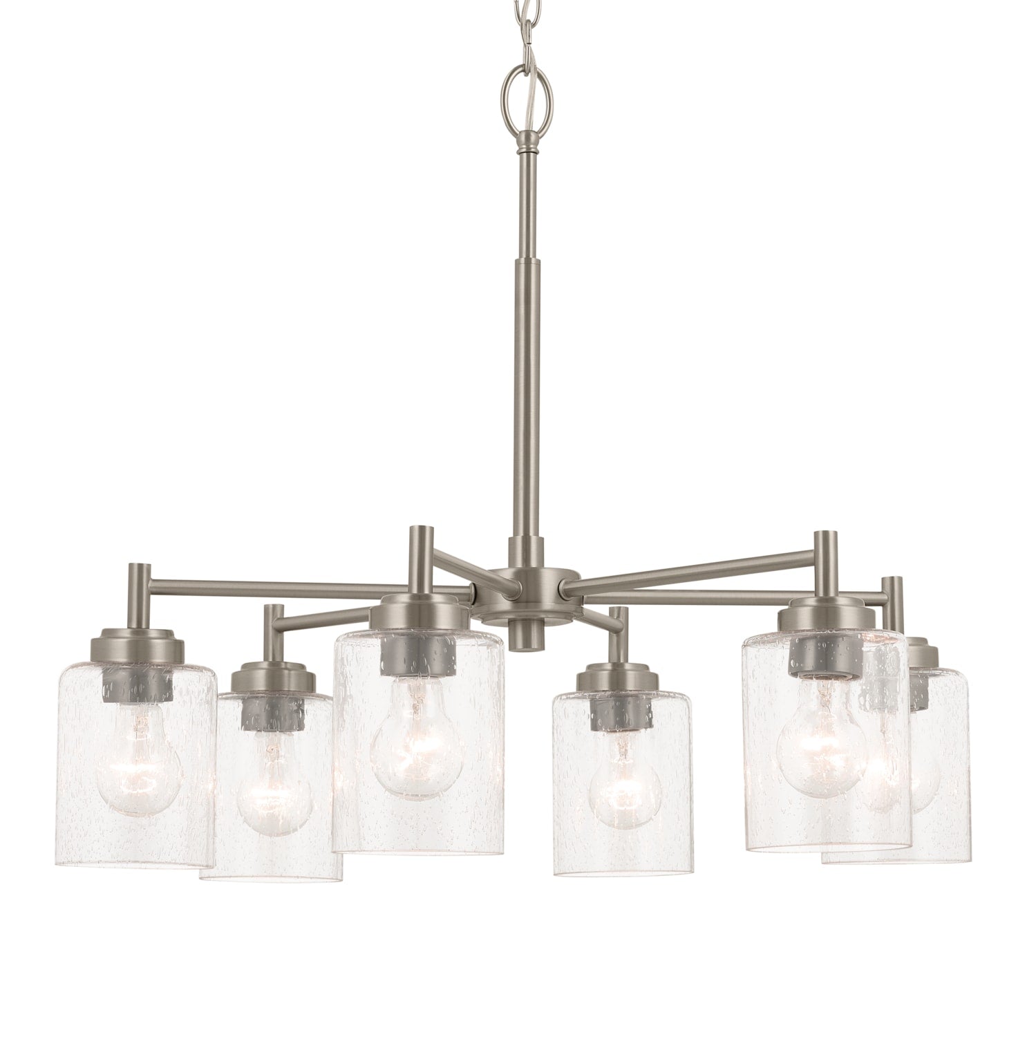 Illuminate your space with the Kichler Winslow 6-Light Brushed Nickel Industrial Chandelier, a perfect blend of style and functionality. The chandelier's clean lines and seeded glass make it ideal for industrial decor, while its versatile hanging options allow you to customize its look to fit various rooms in your home.