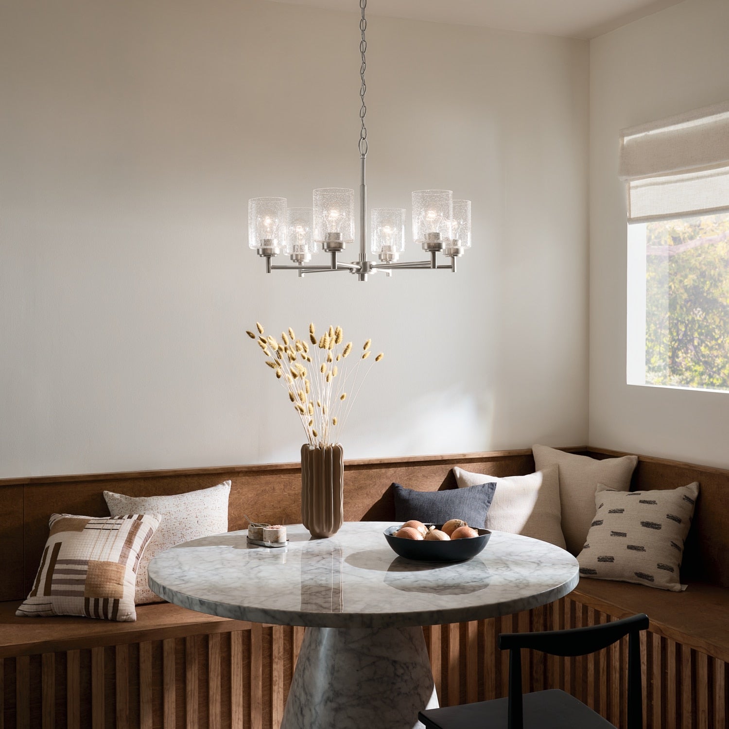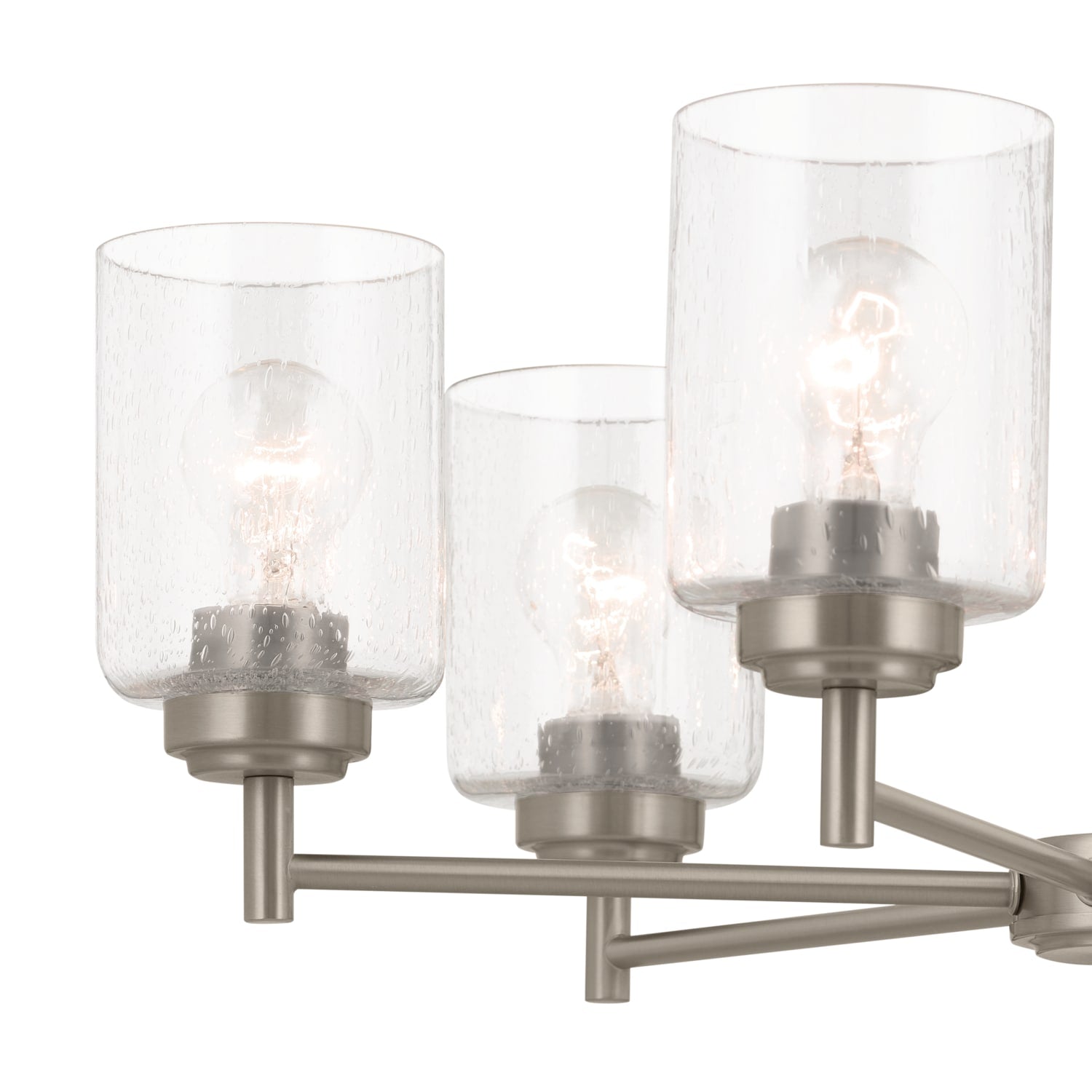 The Kichler Winslow Chandelier transforms any space with its rustic elegance and industrial charm. This architectural marvel, with its brushed nickel finish and intricate interplay of light through seeded glass, creates a stunning focal point. Imagine this chandelier elegantly suspended over a reclaimed wood dining table, its light drawing shadows that dance across the room, enhancing your décor's ambiance. Embrace its versatile design, adjusting the glass orientation to suit your mood, and let it be a testament to luxurious living.
